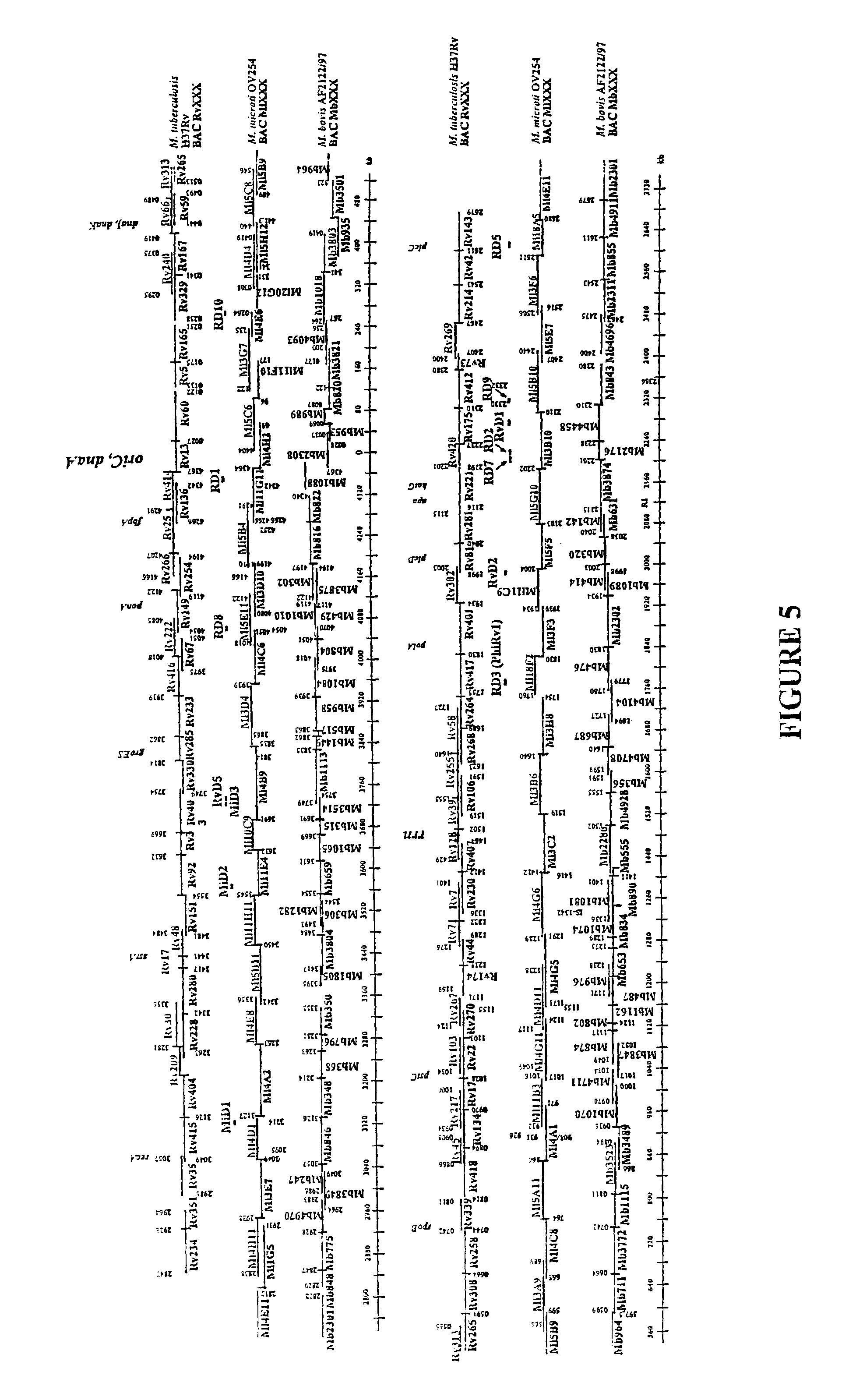 [0003]One of these two regions known as RD5 is disclosed in Molecular Microbiology (1999), vol. 32, pages 643 to 655 (Gordon S. V. et al.). The other region named RD1-2F9 spans the known region RD1 as disclosed in Molecular Microbiology (1999), vol. 32, pages 643 to 655 (Gordon S. V. et al.). Both of the regions RD1 and RD5 or at least one of them are absent from the vaccine strains of M. bovis BCG and in M. microti, strains found involved and used as live vaccines in the 1960's.