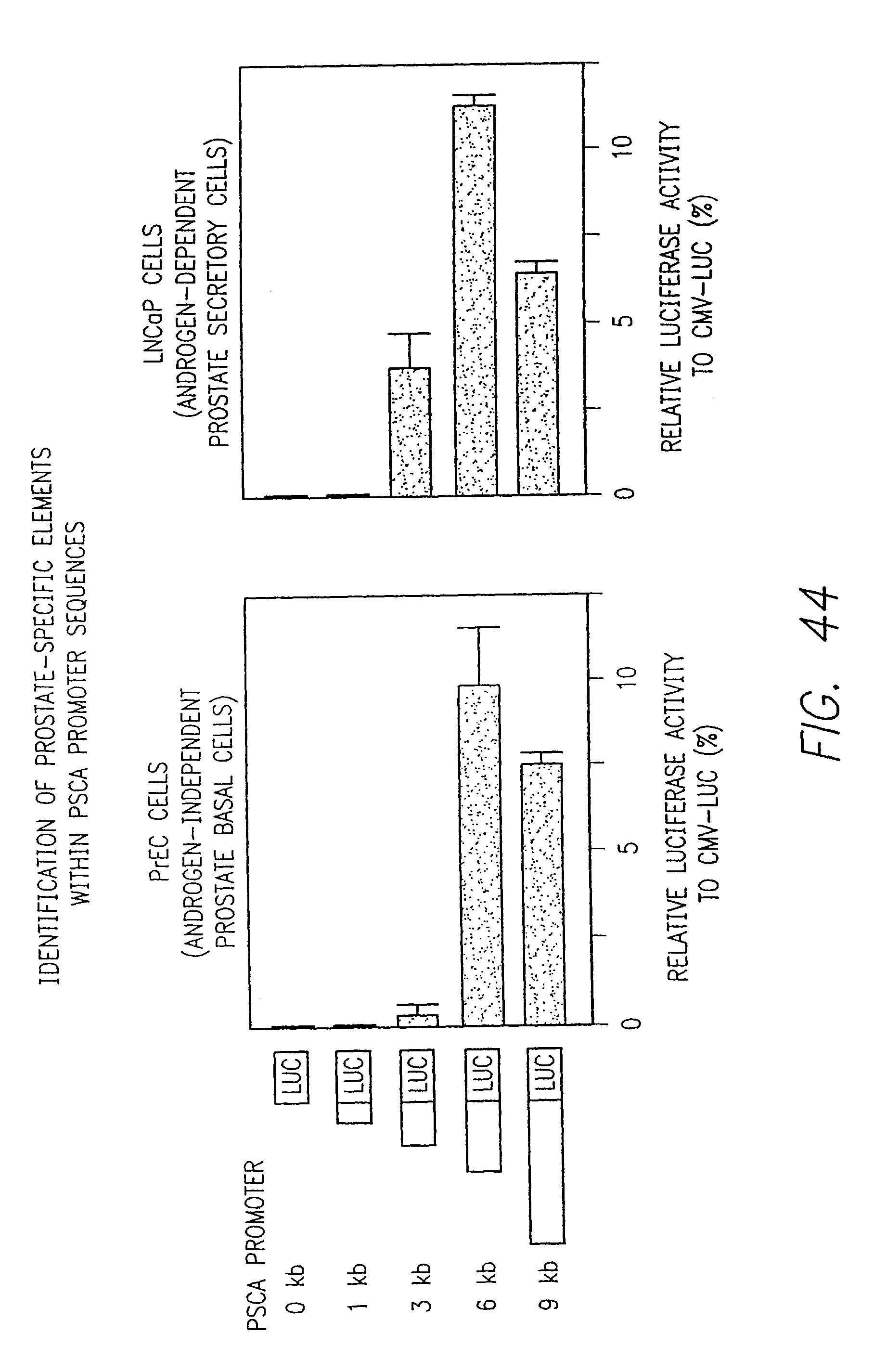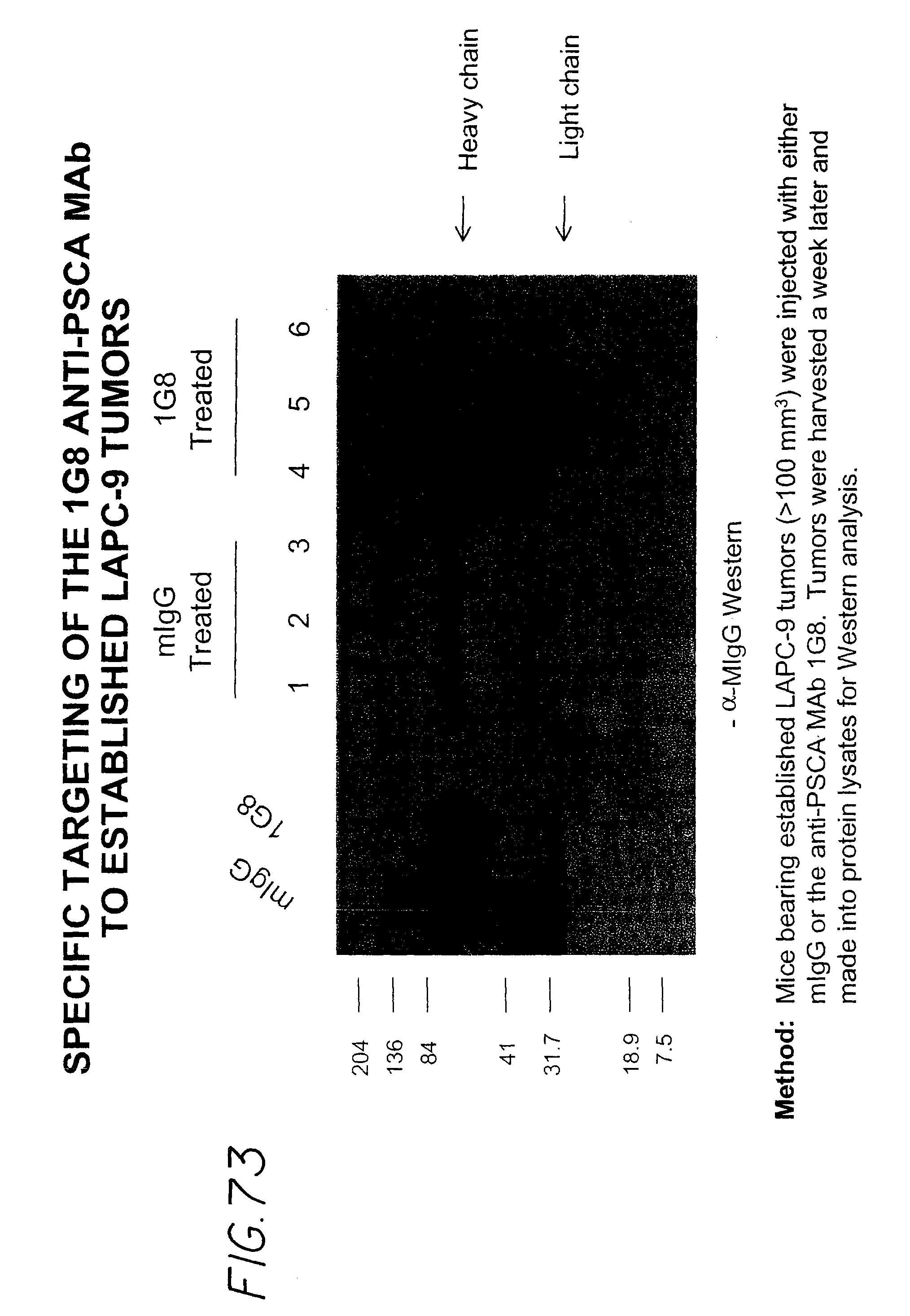 (SEQ ID NO: 14) 5′ primer - GGAGAATTCATGGCACTGCCCTGCTGTGCTAC (SEQ ID NO: 15 3′ primer - GGAGAATTCCTAATGGGCCCCGCTGGCGTT. PSCA expression in normal tissues. Staining Tissue Positive Prostate (epithelium) Bladder (transitional epithelium) Placenta (trophoblasts) Colon (neuroendocrine cells) Kidney (tubules and collecting duct)* Negative Kidney (glomeruli) Prostate (stroma) Bladder (smooth muscle) Testis Endometrium Small intestine Liver Pancreas Breast Gallbladder Skeletal muscle Brain Peripheral nerve Bone marrow Thymus Spleen Lung Bronchus Heart *mAb 3E6 reacts with the distal convoluted tubule, while mAb 1G8 reacts with distal tubules and, in some cases, proximal tubules. **subsequent experimental analysis also showed PSCA expression in normal stomach tissue. Example 6
