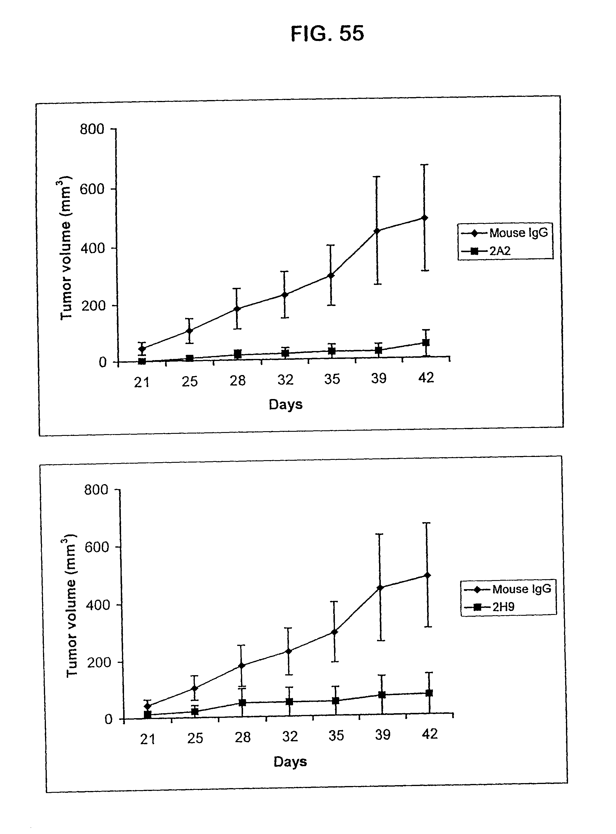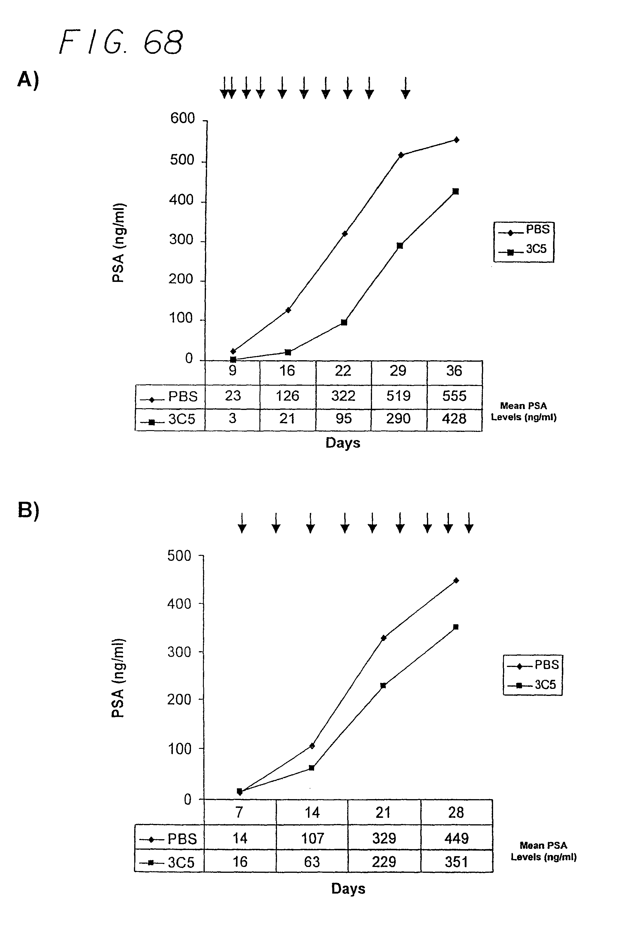 Recorded tumor volume (mm3) measurements DAYS MOUSE #* 32 35 39 42 47 54 61 1 416* 576 578 720 810 1045 1080 2 0 0 0 0 3 100 269.5 450 476 544 648 810 4 0 0 0 0 0 87.5 151.3 5 338 420 800 900 1087 1265 2002 6 216 250.3 504 476 612 850.5 1050 7 252 472.5 637.5 720 720 720 1306 8 336 532 560 693 1080 1365 1617 9 0 160.9 225 294 478 640 900 10 0 0 195 294 341 504 769.5 11 0 0 0 0 0 0 0 12 0 0 0 0 0 0 0 13 0 0 0 0 0 0 0 14 0 0 0 0 0 0 0 15 0 0 0 0 0 0 0 16 0 0 0 0 0 0 0 17 0 0 0 0 0 0 0 18 0 0 0 0 0 0 0 19 0 0 0 0 0 0 0 20 0 0 0 0 0 0 0 *Mice # 1-10 represent the group treated with the mouse IgG control antibody. Mice # 11-20 represents the group treated with the anti-PSCA mAb cocktail. *Tumor volume corresponds to length (L) × width (W) × height (H) measurements in mm. To determine the ellipsoid volume represented in FIG. 1, which accurately represents tumor mass (Tomayko and Reynolds, 1989), we used the formula L × W × H × ½. Anti-PSCA antibody cocktail 2 Amount Monoclonal Antibody Isotype (% of total) 1G8 IgG1 8.0 mg (16.7%) 2H9 IgG1 4.0 mg (8.3%) 2A2 IgG2a 10.0 mg (20.8%) 3C5 IgG2a 8.0 mg (16.7%) 3G3* IgG2a 10.0 mg (20.8%) 4A10 IgG2a 6.0 mg (12.5%) 3E6 IgG3 2.0 mg (4.2%) *One of the monoclonal antibody preparations used to formulate this cocktail, 3G3, demonstrated weak reactivity. Example 19