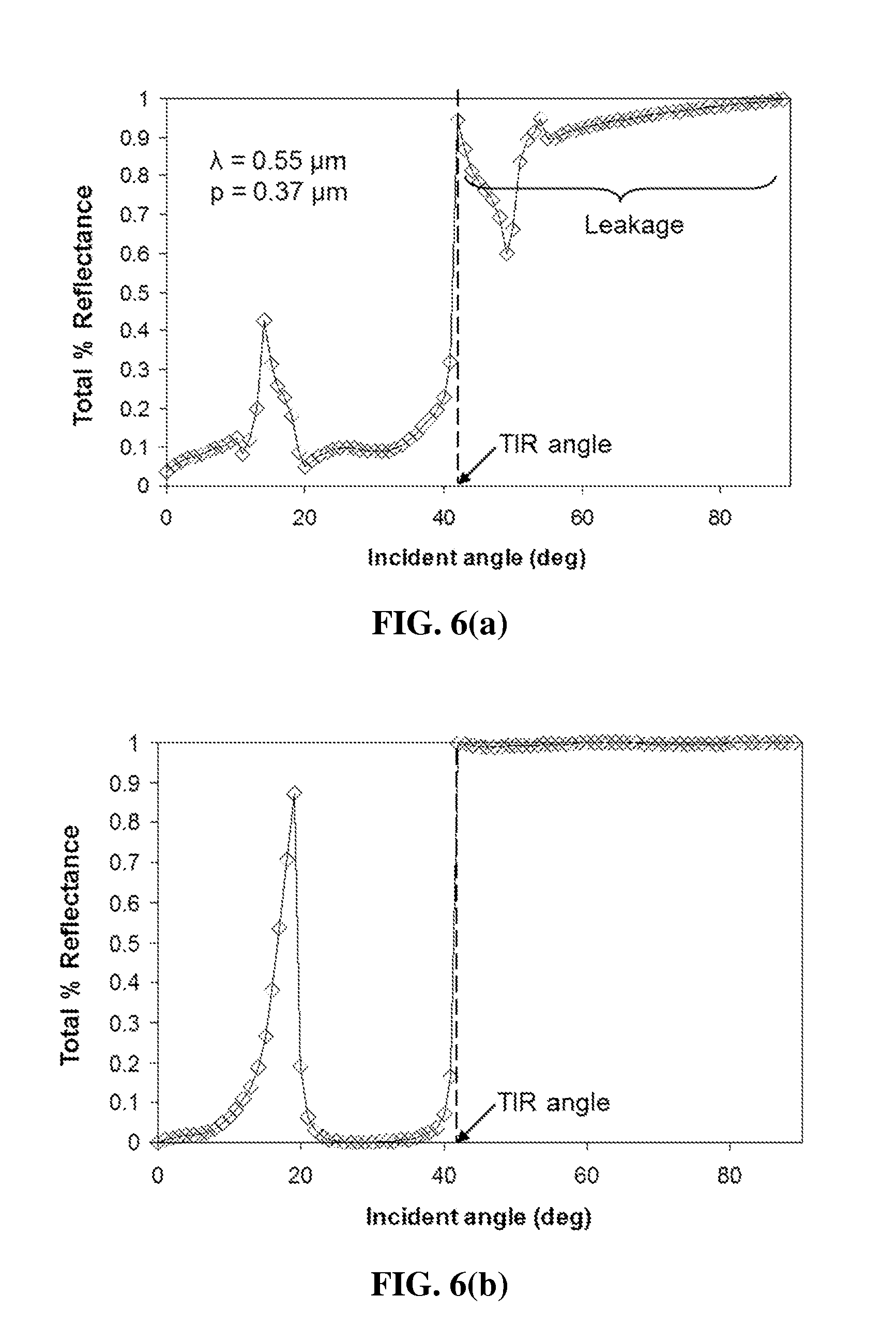 (for coverage of the entire visible spectrum, λ is preferably from 0.38 um to 0.78 um). Equation (1) yields no solution for the diffraction order (non-zero m) for the normal incident angle (θin=0) or near the normal incident angle, such that the light at or near the normal incident angle transmits through the panel without being diffracted. In such a case, objects would be clearly visible when viewed through the exemplary binary grating surface diffuser panel, through either panel sides of the diffuser panel at or near the normal incident angle. Thus, the exemplary diffuser panel would appear to be transparent. On the other hand, for incident angles greater than the total internal reflection angle (or the critical angle), sin−1(1/nin), which are the angles for light waveguided in the diffuser panel, equation (1) yields diffraction orders but only a few (preferably only one). This diffraction is diffusive, because the light is spread out and can be emitted over the entire panel surface. The exemplary diffuser panel can be used for illumination if light is waveguided in the panel and directed toward the grating surface 102 at an oblique angle. For an illustrative example: If λ/p=1.5 and nd=1 (air), nin=1.5 (acrylic) satisfying λ/(nd+nin)<p<λ, the grating equation of equation (1) can rewritten as