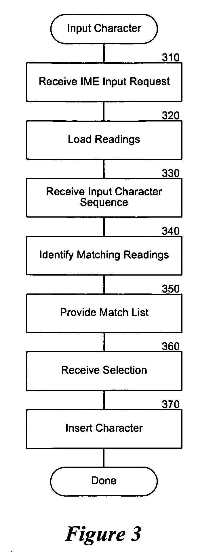 In block 350, the component provides to the application user a list of one or more language characters associated with one or more readings that have matching sequences of keyboard characters. For example, the component may display a graphical drop down list visually depicting the possible language character matches. The list may include language characters from both static and dynamic readings. In block 360, the component receives from the application user a selection of a particular language character from the list. For example, the application user may click on the selection with a mouse or other cursor. In block 370, the component inserts the selected language character into the document. The component may optionally loop to block 330 to receive additional character sequences. After block 370, these steps conclude.