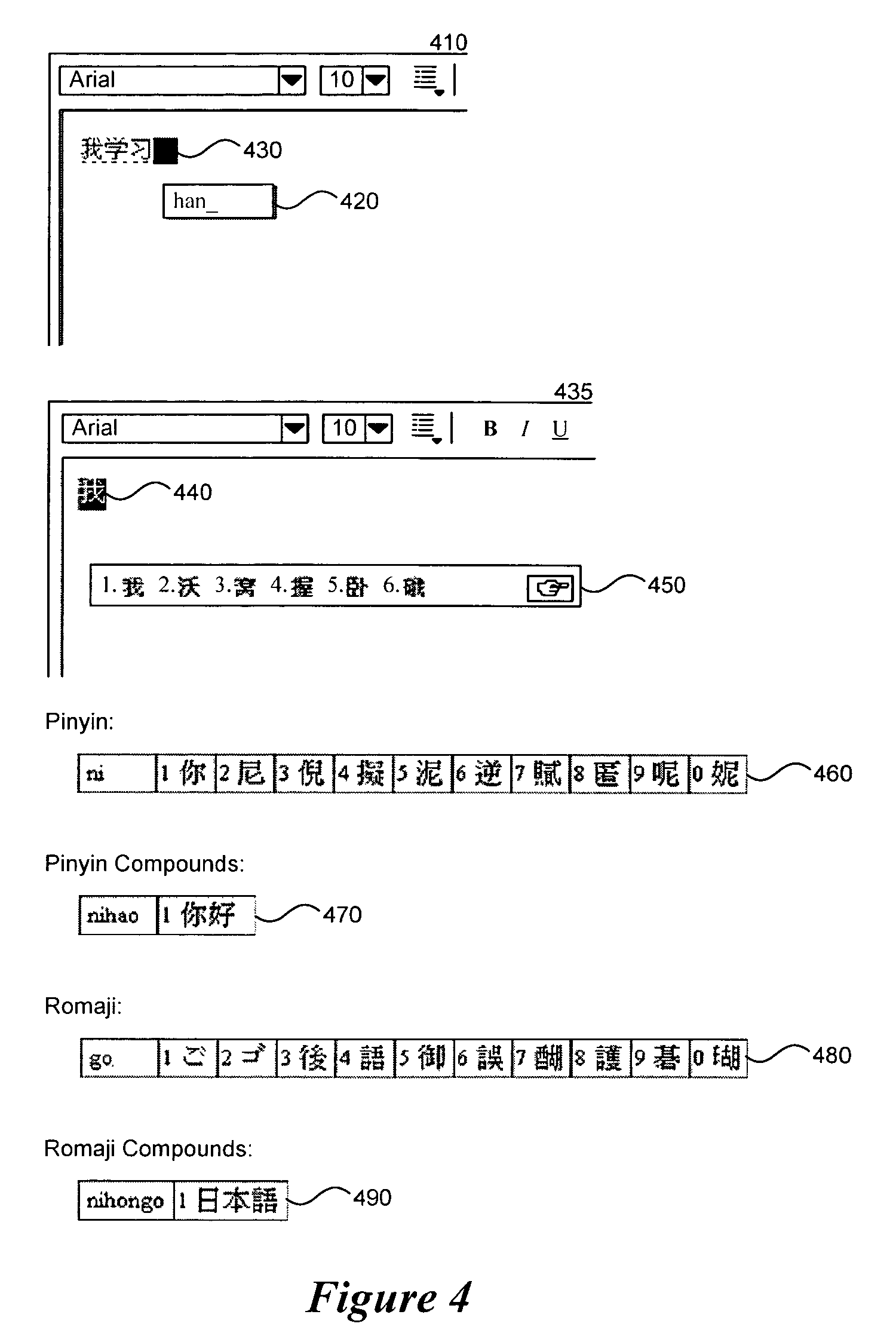 The display 460 illustrates an example entry “ni” using the Chinese Pinyin system. Pinyin is the official Romanization system for Mandarin Chinese. It was promulgated in 1958 and has been a United Nations standard since 1977. The display 470 illustrates Pinyin compounds that may be accepted by the IME. When the IME accepts compounds, the keyboard characters entered by the user are matched with multiple language characters in the dictionary (in this case “ni” and “hao”). The display 480 illustrates a similar process using Romaji. Romaji is the Romanization of Japanese characters. A user types the pronunciation of a word in Hepburn (or other) Romanization and selects the appropriate language character. For example, display 480 illustrates the language characters with matching readings for the keyboard character sequence “go.” The display 490 illustrates Romaji compounds where the sequences “ni,” “hon,” and “go” are each matched to separate language characters. Compounds relieve the user from having to perform the character selection process after entering each keyboard sequence, and thus can save time.