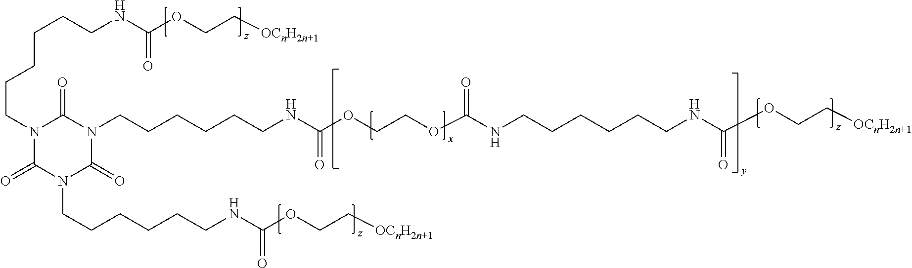 By way of example, mention may be made here of 2-decyl-1-tetradecanol as suitable alcohol. In one embodiment, mixtures of ethoxylated C16-C18-fatty alcohols are used in order to introduce sections T into the polyurethanes. In one embodiment, a linear, nonionic compound of the structural formula RO(CH2CH2O)xH, where R is a linear C16-C18-alkyl radical, and where x=3, 5, 7, 8, 11, 13, 18, 25 or 80, and in certain specific embodiments, x=11, is used as at least one of the alcohols used. Commercially, such an ethoxylated, linear fatty alcohol is available, for example, as Lutensol® AT11. In one embodiment of the invention, mixtures of ethoxylated linear and ethoxylated branched long-chain alcohols, in particular mixtures of the aforementioned types, are used. In a further embodiment, ethoxylated iso-C13-oxo alcohols or mixtures thereof are used in order to introduce sections T into the polyurethanes. In one embodiment, a branched, nonionic compound of the structural formula RO(CH2CH2O)xH, where R is a C13-alkyl radical, and in certain specific embodiments, an iso-C13-alkyl radical, and where x=3, 5, 6, 6.5, 7, 8, 10, 12, 15 or 20, and in certain specific embodiments, x=10, is used as at least one of the alcohols used. Commercially, such an ethoxylated, alkyl-branched alcohol is available, for example, as Lutensol® TO10. In a further embodiment, mixtures comprising ethoxylated C16-C18-fatty alcohols and ethoxylated iso-C13-oxo alcohols are used in order to introduce sections T into the polyurethanes. In a further embodiment, the above-described alcohols of the general formula (4) or (5) in EP 761780 A2, p. 4, are used in their ethoxylated form in order to introduce sections T into the polyurethanes. It is of course possible to additionally also introduce other sections T into the polyurethanes. The hydrophobic sections T can of course also be introduced into the polyurethanes through any desired mixtures of the aforementioned ethoxylated alcohols. By means of the process according to one or more embodiments of the invention, as is customary in the case of polymerization reactions, mixtures of different polymers are obtained, in the present case thus mixtures of different polyurethanes. The term “polyurethane” used here can refer either to any individual polyurethane molecule or to the totality of the polyurethane molecules obtainable by the process according to one or more embodiments of the invention. The polyurethanes obtainable according to the invention are, in certain specific embodiments, mixtures which comprise the described polyurethane structures. Accordingly, the preparation of mixtures of polyurethanes, the terminal hydrophobic sections T of which are branched and/or unbranched alkyl radicals is also in accordance with the invention. The preparation of mixtures which comprise polyurethanes which comprise both branched and unbranched terminal, hydrophobic sections T is also in accordance with the invention. At least some of the polyurethane molecules obtainable by the process according to one or more embodiments of the invention comprise allophanate segments. The invention thus also provides a process according to one or more embodiments of the invention where at least some of the resulting polyurethanes comprise allophanate segments. At least some of the polyurethane molecules obtainable by the process according to one or more embodiments of the invention comprise isocyanurate segments. The invention thus also provides a process according to one or more embodiments of the invention where at least some of the polyurethanes comprise isocyanurate segments. Hydrophilic Sections S In the polyurethanes obtainable by the process according to one or more embodiments of the invention, to the terminal hydrophobic sections T are attached hydrophilic sections S. In the polyurethanes, the sections S, independently of one another, may be identical or different. The sections S, in certain embodiments, comprise radicals of alkylene oxides. In one specific embodiment, the number is in the range from 2 to 150 alkylene oxide radicals, and in a more specific embodiments, in the range from 2 to 100 alkylene oxide radicals, and in certain even more specific embodiments, in the range from 2 to 50 alkylene oxide radicals. In certain embodiments, the hydrophilic sections S comprise or consist of ethylene oxide radicals. In one specific embodiment, the hydrophilic sections S comprise ethylene oxide radicals (EO units), the number of which is in the range from 2 to 150 EO units, and in a specific embodiment, in the range from 2 to 100 EO units and in an even more specific embodiment, in the range from 2 to 50 EO units. In one specific embodiment, the sections S consist of 2 to 50, and in a specific embodiment, 2 to 25 EO units. In another embodiment, the sections S consist of 25 to 100, and in a specific embodiment, 40 to 100 EO units. The number of EO units per molecule of ethoxylated alcohol is also referred to as degree of ethoxylation. The sections S can likewise comprise longer-chain alkylene oxide radicals, with the proviso that the sections S must be hydrophilic overall. The hydrophilicity can be controlled for example via the fraction of EO units in the sections S. Hydrophobic Sections D To each hydrophilic section S is attached at least one hydrophobic section D. Here, a section S may also be present in the interior of the molecule of the polyurethanes according to the invention. In this case, this section S is connected not like an edge-position section S directly to a section D and a section T, but on at least two sides to sections D. In a specific embodiment, a section S is connected in the interior of the molecule on both sides to one section D in each case. For all edge-position sections S, it is the case that they are directly connected to an end-position section T. Should a section S be branched to a low extent, then it can be directly connected at two or more positions to hydrophobic s