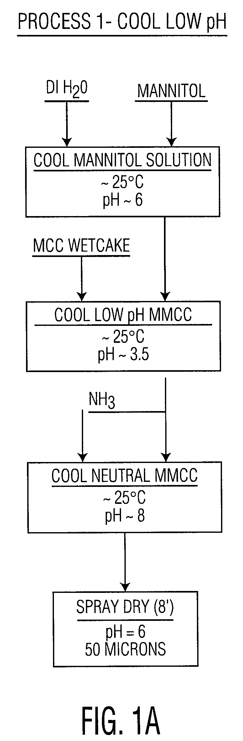 FIGS. 1A and 1B show processes used to prepare co-processed MCC/mannitol.