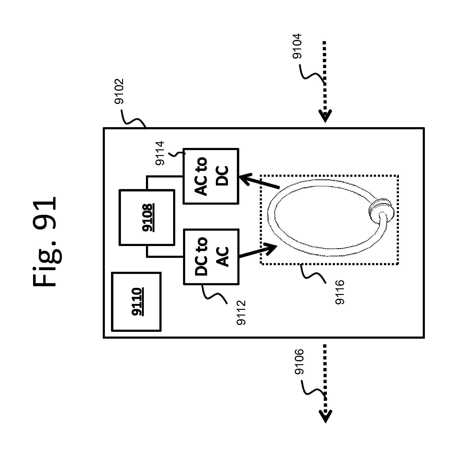 Topologies for Preservation of Mode Profile (High-Q) The resonator structure may be designed to be connected to the generator or the load wirelessly (indirectly) or with a hard-wired connection (directly). Consider a general indirectly coupled matching topology such as that shown by the block diagram in The combination of A and the inductive element 2802 may form a resonator 102, which in isolation may support a high-Q resonator electromagnetic mode, with an associated current and charge distribution. The lack of a wired connection between the external circuit, Z0and B, and the resonator, A+(R,L), may ensure that the high-Q resonator electromagnetic mode and its current/charge distributions may take the form of its intrinsic (in-isolation) profile, so long as the degree of wireless coupling is not too large. That is, the electromagnetic mode, current/charge distributions, and thus the high-Q of the resonator may be automatically maintained using an indirectly coupled matching topology. This matching topology may be referred to as indirectly coupled, or transformer-coupled, or inductively-coupled, in the case where inductive coupling is used between the external circuit and the inductor loop. This type of coupling scenario was used to couple the power supply to the source resonator and the device resonator to the light bulb in the demonstration of wireless energy transfer over mid-range distances described in the referenced Next consider examples in which the inductive element may include the inductive element and any indirectly coupled systems. In this case, as disclosed above, and again because of the lack of a wired connection between the external circuit or the coupled systems and the resonator, the coupled systems may not, with good approximation for not-too-large degree of indirect coupling, affect the resonator electromagnetic mode profile and the current/charge distributions of the resonator. Therefore, an indirectly-coupled matching circuit may work equally well for any general inductive element as part of a resonator as well as for inductive elements wirelessly-coupled to other systems, as defined herein. Throughout this disclosure, the matching topologies we disclose refer to matching topologies for a general inductive element of this type, that is, where any additional systems may be indirectly coupled to the low-loss inductive element, and it is to be understood that those additional systems do not greatly affect the resonator electromagnetic mode profile and the current/charge distributions of the resonator. Based on the argument above, in a wireless power transmission system of any number of coupled source resonators, device resonators and intermediate resonators the wireless magnetic (inductive) coupling between resonators does not affect the electromagnetic mode profile and the current/charge distributions of each one of the resonators. Therefore, when these resonators have a high (unloaded and unperturbed) Q, their (unloaded and unperturbed) Q may be preserved in the presence of the wireless coupling. (Note that the loaded Q of a resonator may be reduced in the presence of wireless coupling to another resonator, but we may be interested in preserving the unloaded Q, which relates only to loss mechanisms and not to coupling/loading mechanisms.) Consider a matching topology such as is shown in The high-Q resonator electromagnetic mode may be such that the profile of the voltage distribution along the inductive element has nodes, namely positions where the voltage is zero. One node may be approximately at the center of the length of the inductive element, such as the center of the conductor used to form the inductive element, (with or without magnetic materials) and at least one other node may be within A. The voltage distribution may be approximately anti-symmetric along the inductive element with respect to its voltage node. A high Q may be maintained by designing the matching topology (A, B, C) and/or the terminal voltages (V1, V2) so that this high-Q resonator electromagnetic mode distribution may be approximately preserved on the inductive element. This high-Q resonator electromagnetic mode distribution may be approximately preserved on the inductive element by preserving the voltage node (approximately at the center) of the inductive element. Examples that achieve these design goals are provided herein. A, B, and C may be arbitrary (namely not having any special symmetry), and V1 and V2 may be chosen so that the voltage across the inductive element is symmetric (voltage node at the center inductive). These results may be achieved using simple matching circuits but potentially complicated terminal voltages, because a topology-dependent common-mode signal (V1+V2)/2 may be required on both terminals. Consider an ‘axis’ that connects all the voltage nodes of the resonator, where again one node is approximately at the center of the length of the inductive element and the others within A. (Note that the ‘axis’ is really a set of points (the voltage nodes) within the electric-circuit topology and may not necessarily correspond to a linear axis of the actual physical structure. The ‘axis’ may align with a physical axis in cases where the physical structure has symmetry.) Two points of the resonator are electrically symmetric with respect to the ‘axis’, if the impedances seen between each of the two points and a point on the ‘axis’, namely a voltage-node point of the resonator, are the same. B and C may be the same (C=B), and the two terminals may be connected to any two points of the resonator (A+(R,L)) that are electrically symmetric with respect to the ‘axis’ defined above and driven with opposite voltages (V2=−V1) as shown in In other examples, C may be chosen to be a short-circuit and the corresponding terminal to be connected to ground (V=0) and to any point on the electric-symmetry (zero-voltage) ‘axis’ of the resonator, and B to be connect