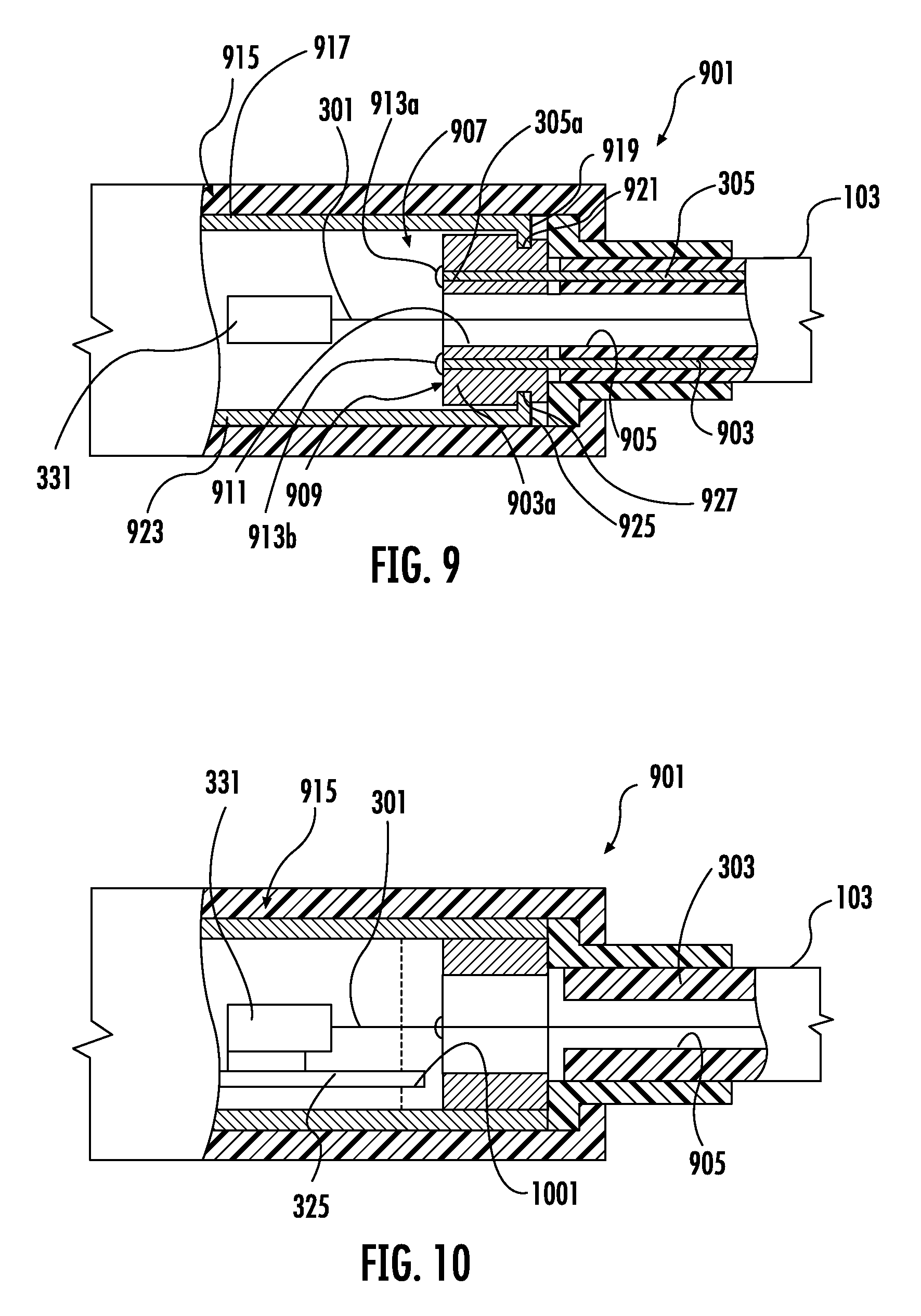 [0051]As shown in FIG. 10, the collar 907 may optionally include a support slot 1001 configured to support an end portion of the circuit board 325. As further illustrated, a TIR block 331 may be provided for interfacing the ends of the optical fibers 301 of the fiber optic cable 103 in a manner that may be similar or identical to the previous described examples.