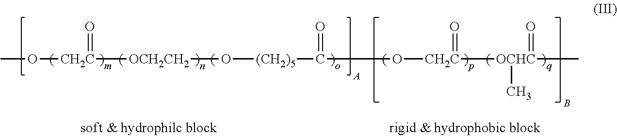R1and R2can be amorphous polyester, amorphous poly ether ester or amorphous polycarbonate; or an amorphous pre-polymer that is obtained from combined ester, ether and/or carbonate groups. R1and R2can contain polyether groups, which can result from the use of these compounds as a polymerization initiator, the polyether being amorphous or crystalline at room temperature. However, the polyether thus introduced will become amorphous at physiological conditions. R1and R2are derived from amorphous pre-polymers or blocks A and B, respectively, and R1and R2are not the same. R1and R2can contain a polyether group at the same time. In a specific embodiment, only one of them will contain a polyether group; z is zero or a positive integer; R3is a polyether, such as poly(ethylene glycol), and may be present (z≠0) or not (z=0). R3will become amorphous under physiological conditions; R4is an aliphatic C2-C8alkylene group, optionally substituted by a C1-C10alkylene, the aliphatic group being linear or cyclic, wherein R4can specifically be a butylene, —(CH2)4-group, and the C1-C10alkylene side group can contain protected S, N, P or O moieties; x and y are both positive integers, which can both specifically be at least 1, whereas the sum of x and y (x+y) can specifically be at most 1000, more specifically at most 500, or at most 100. Q1-Q6 are linking units obtained by the reaction of the pre-polymers with the multifunctional chain-extender. Q1-Q6 are independently amine, urethane, amide, carbonate, ester or anhydride. The event that all linking groups Q are different being rare and not preferred. Typically, one type of chain-extender can be used with three pre-polymers having the same end-groups, resulting in a copolymer of formula (1) with six similar linking groups. In case pre-polymers R1and R2are differently terminated, two types of groups Q will be present: e.g. Q1 and Q2 will be the same between two linked pre-polymer segments R1, but Q1 and Q2 are different when R1and R2are linked. Obviously, when Q1 and Q2 are the same, it means that they are the same type of group but as mirror images of each other. In copolymers of formula (2) and (3) the groups Q1 and Q2 are the same when two pre-polymers are present that are both terminated with the same end-group (which is usually hydroxyl) but are different when the pre-polymers are differently terminated (e.g. PEG which is diol terminated and a di-acid terminated ‘tri-block’ pre-polymer). In case of the tri-block pre-polymers (R1R2R1and R2R1R2), the outer segments should be essentially free of PEG, because the coupling reaction by ring opening can otherwise not be carried out successfully. Only the inner block can be initiated by a PEG molecule. The examples of formula (1), (2) and (3) show the result of the reaction with a di-functional chain-extender and di-functional pre-polymers. With reference to formula (1) the polyesters can also be represented as multi-block or segmented copolymers having a structure (ab)n with alternating a and b segments or a structure (ab)r with a random distribution of segments a and b, wherein ‘a’ corresponds to the segment R1derived from pre-polymer (A) and ‘b’ corresponds to the segment R2derived from pre-polymer (B) (for z=0). In (ab)r, the a/b ratio (corresponding to x/y in formula (1)) may be unity or away from unity. The pre-polymers can be mixed in any desired amount and can be coupled by a multifunctional chain extender, viz. a compound having at least two functional groups by which it can be used to chemically link the pre-polymers. Specifically, this is a di-functional chain-extender. In case z≠0, then the presentation of a random distribution of all the segments can be given by (abc)r were three different pre-polymers (one being e.g. a polyethylene glycol) are randomly distributed in all possible ratio's. The alternating distribution is given by (abc)n. In this particular case, alternating means that two equally terminated pre-polymers (either a and c or b and c) are alternated with a differently terminated pre- polymer b or a, respectively, in an equivalent amount (a+c=b or b+c=a). Those according to formula (2) or (3) have a structure (aba)n and (bab)n wherein the aba and bab ‘triblock’ pre-polymers are chain-extended with a di-functional molecule. The method to obtain a copolymer with a random distribution of a and b (and optionally c) is far more advantageous than when the segments are alternating in the copolymer such as in (ab)n with the ratio of pre-polymers a and b being 1. The composition of the copolymer can then only be determined by adjusting the pre-polymer lengths. In general, the a and b segment lengths in (ab)n alternating copolymers are smaller than blocks in block-copolymers with structures ABA or AB. The pre-polymers of which the a and b (and optionally c) segments are formed in (ab)r, (abc)r, (ab)n and (abc)n are linked by the di-functional chain-extender. This chain-extender can specifically be a diisocyanate chain-extender, but can also be a diacid or diol compound. In case all pre-polymers contain hydroxyl end-groups, the linking units will be urethane groups. In case (one of) the pre-polymers are carboxylic acid terminated, the linking units are amide groups. Multi-block copolymers with structure (ab)r and (abc)r can also be prepared by reaction of di-carboxylic acid terminated pre-polymers with a diol chain extender or vice versa (diol terminated pre-polymer with diacid chain-extender) using a coupling agent such as DCC (dicyclohexyl carbodiimide) forming ester linkages. In (aba)n and (bab)n the aba and bab pre-polymers are also specifically linked by an aliphatic di-functional chain-extender, more specifically, a diisocyanate chain-extender. The term “randomly segmented” copolymers refers to copolymers that have a random distribution (i.e. not alternating) of the segments a and b: (ab)r or a, b and c: (abc)r. PEG-PBT polymers One suitable class of biodegradable poly