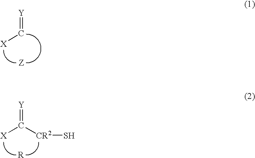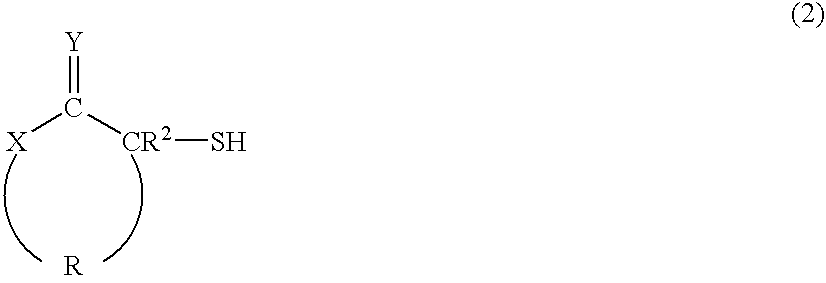 wherein X is a structure selected from the group consisting of —O—, —S—, —NH— and —NR1—; R1is an alkyl group of 1 to 6 carbon atoms; Y is an oxygen atom or a sulfur atom; R2is a hydrogen atom or an alkyl group of 1 to 6 carbons atoms; and R is an alkylene group having a main chain which has 2 to 6 carbon atoms and optionally having one or more mercapto groups;
