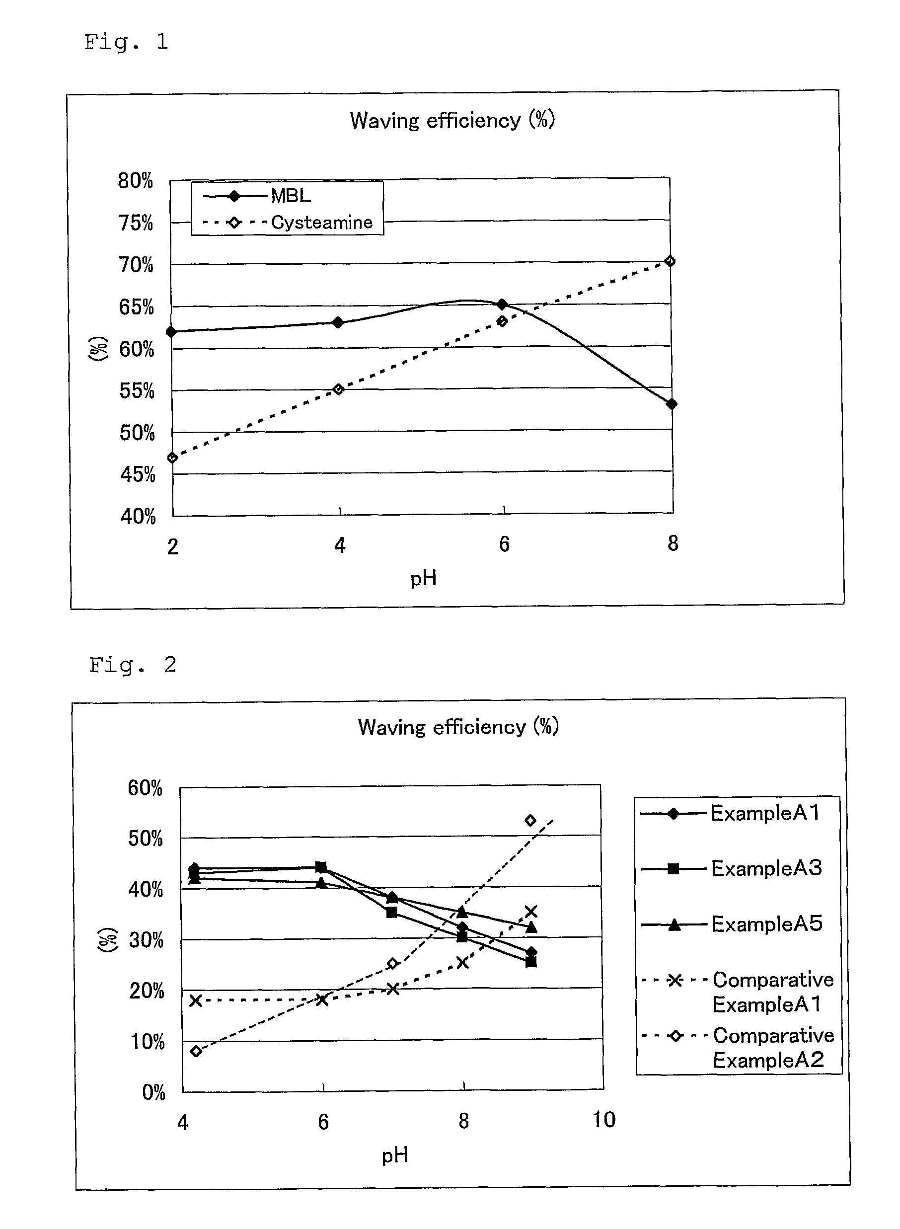 For example, monoglycerol esters of thioglycolic acid have been studied as the keratin reducing substances usable at the above pH range (for example, Patent Document 1). To solve skin problems caused by thioglycolic acid esters, mercaptoglycolic acid amide derivatives and mercaptolactic acid amide derivatives are studied (for example, Patent Documents 2 and 3). Further, cysteamines, which are believed to produce effects under weakly acidic conditions, are also studied (for example, Patent Document 4).