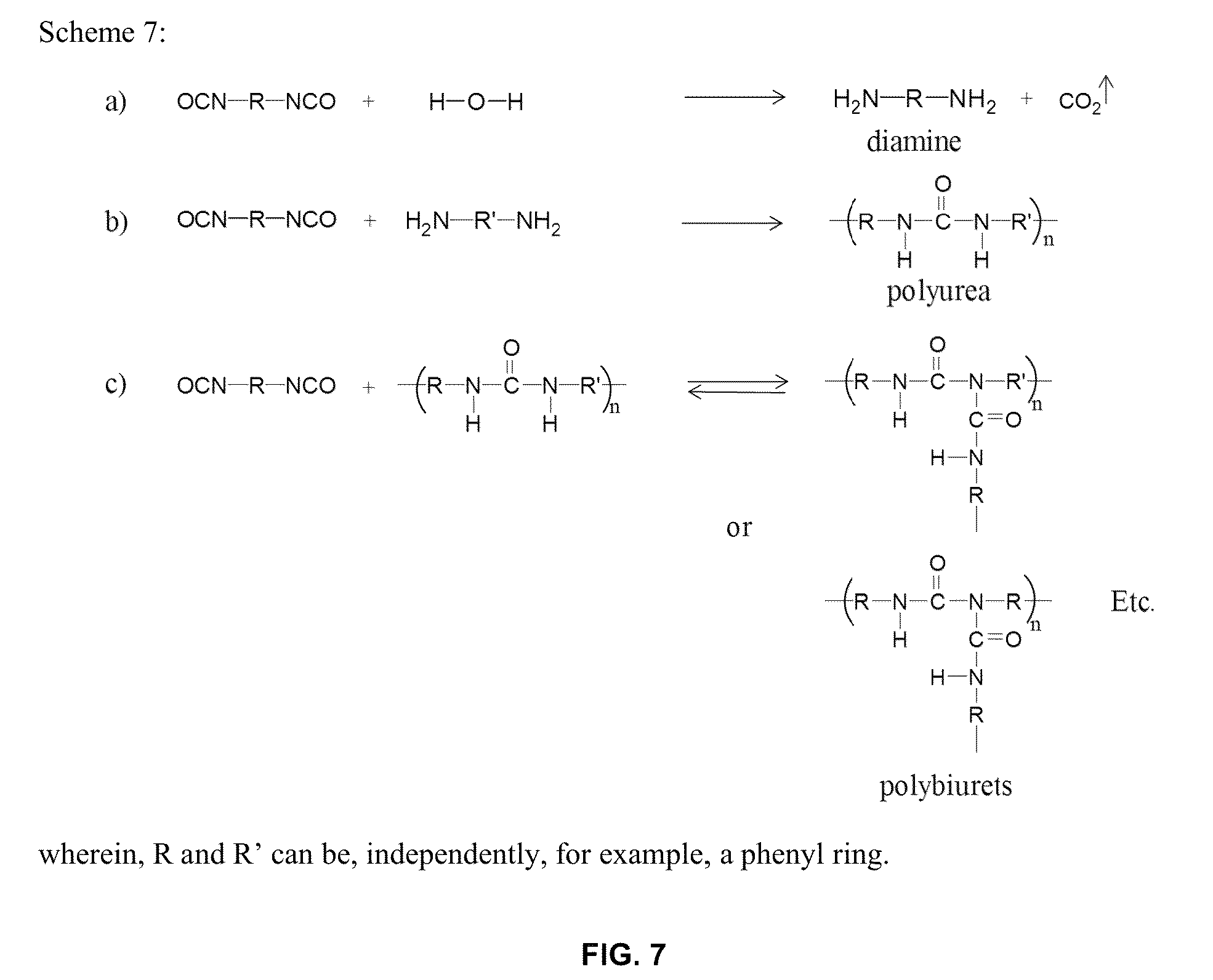 where n is 3 (sample 2). However, an attempt to cross-link the amine-capped PI resulted in failure to gel. As formulated in Eq. 3, the amount of water released from the reaction is much more than the amount of MDI formulated to react with the amine. Shown in Scheme 7 (a-c) (