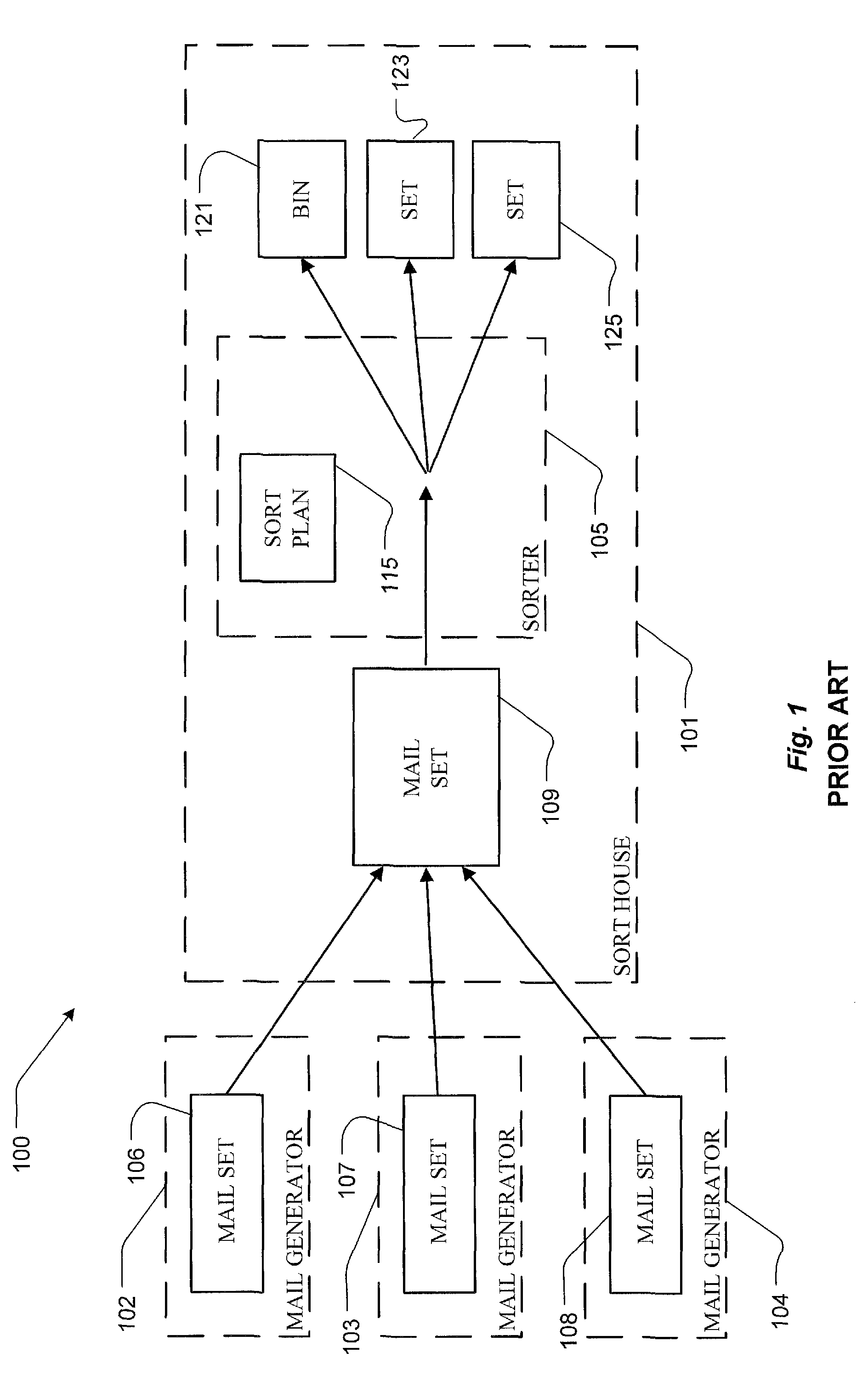 Referring to FIG. 1 in the drawings, a schematic of a conventional planed sorter is illustrated. A typical system 100 to sort mail includes a sort house 101 and various mail generators 102, 103, 104. A sort house 101 is a facility that takes raw mail in to sort into various groupings based upon things such as zip codes and type of mailings. Sort house 101 can provide mail generators, such as mail generator 102, mail generator 103, and mail generator 104, discounts to combine mail streams and sort mail by zip codes. For example, mail generator 102 could be a retailer with a set of catalogs 106. Mail generator 103 could be a credit card company sending credit card statements 107. Mail generator 104 could be a print shop mailing out coupons 108. Typically, sort house 101 includes a sorter 105 and a mail set 109. Mail set 109 is typically comprised of various mail sets 106, 107 and 108 from different mail generators 102, 103, and 108. The sorter 105 processes the mail set 109 based upon the instructions provided in the sort plan 115. Sort plan 115 is generated by a user and typically designates the sorter 105 to sort the mail set 109 based upon widely used zip codes. Sort plan 115 does not change to reflect the composition of the mail set 115. For example sort plan 115 tells the sorter 105 to group certain mailings into certain bins based upon zip codes. There are a limited number of bins, such as bin 121, bin 123, and bin 125 in the sorter 105, sorted mail than does not end up in a bin will be grouped together in a separate holding bin. The more inefficient the sort plan 115, the more likely mail will end up in the holding bin. If the amount of mail in the holding bin is too great the mail in the holding bin will be passed through the sorter 105 in a second pass to further sort the mail. Second passes wastes time and resources.