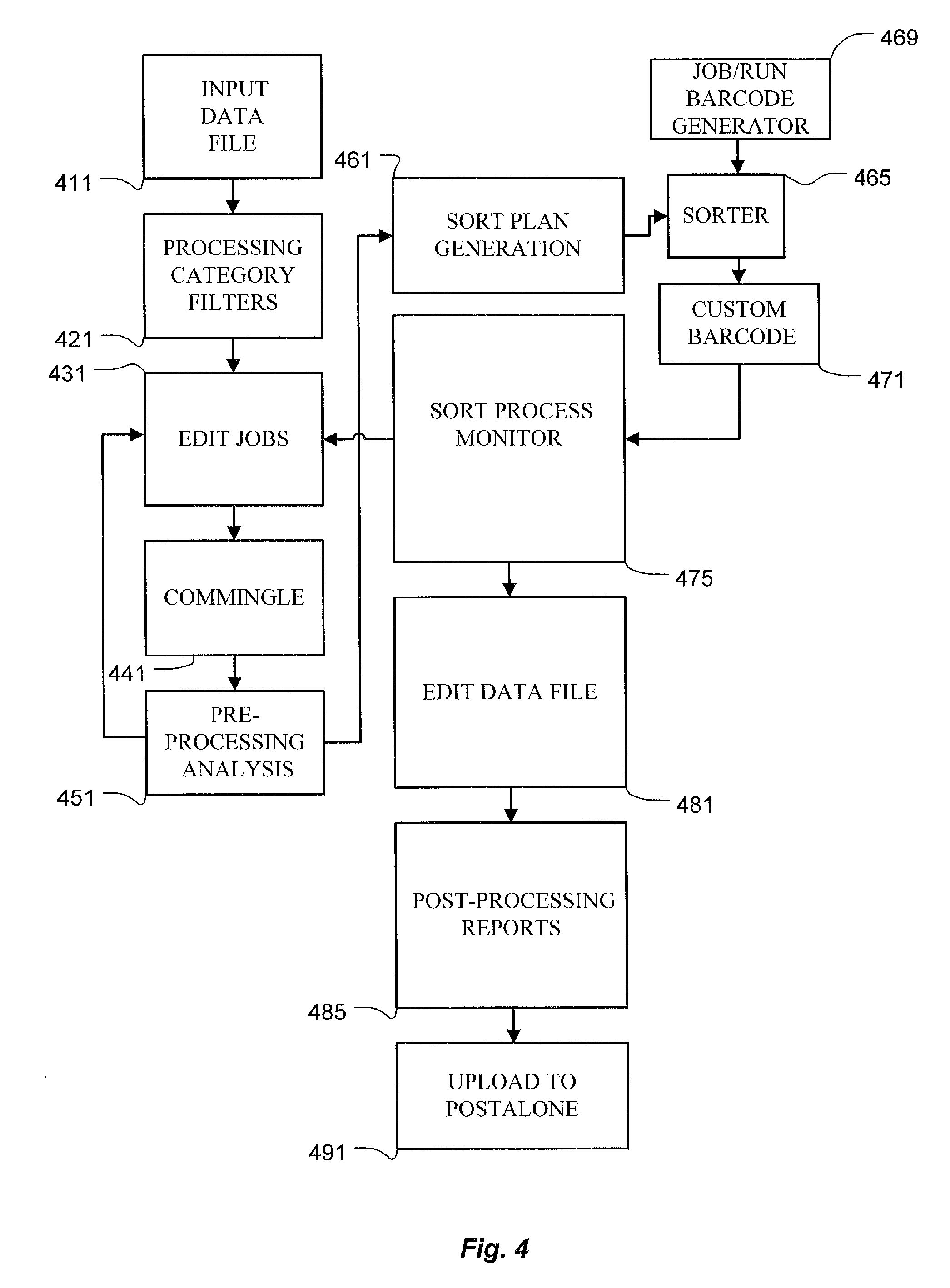 Referring now also to FIG. 4 in the drawings, a flowchart of a preferred embodiment of a method for optimizing a mail document sorting machine according to the present application is illustrated. The method of optimizing a mail document sorting begins with importing or inputting a data file 411, the user is then able to filter 421 the data, the user edits the jobs 431, data is then commingled 441, the user can have some pre-processing analysis completed 451, after the pre-processing analysis 451 the user can either repeat the edit 431 or have the sort plan generated 461. The sort plan is then transferred to the sorter 465. Optional barcodes 469 can be added and provide encoded information easily read 471 by machines. Sort process monitoring 475 is available to the user based upon the sort. During the sort if the progress of the sort doesn't match pre-processing analysis the sort can be terminated and the edit job 431 task can be redone. The ending datafile can be edited 481 based upon the actual sort. The user is able to generate and review post-processing reports 485. Results then are posted 491 to other systems such as postalone.