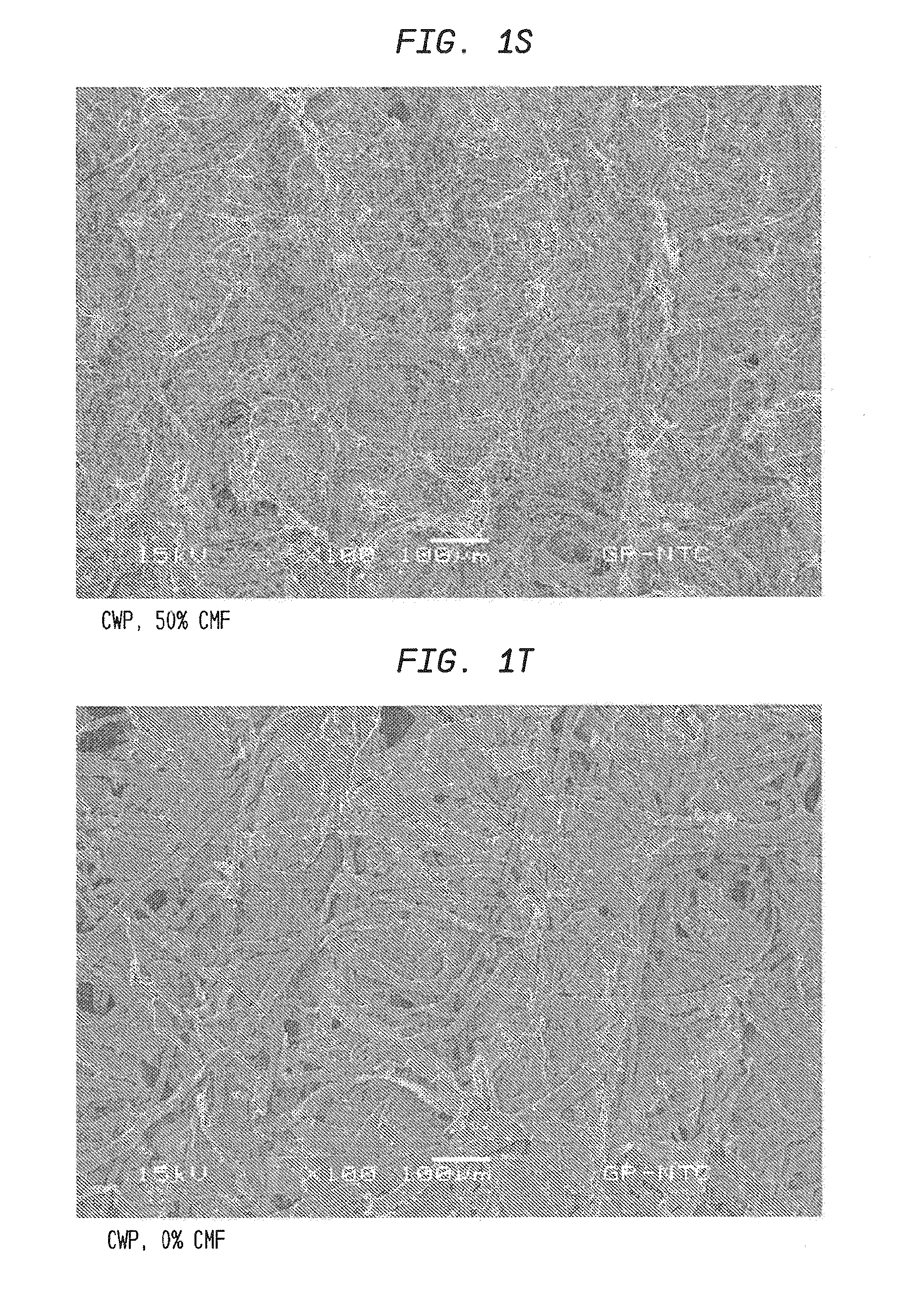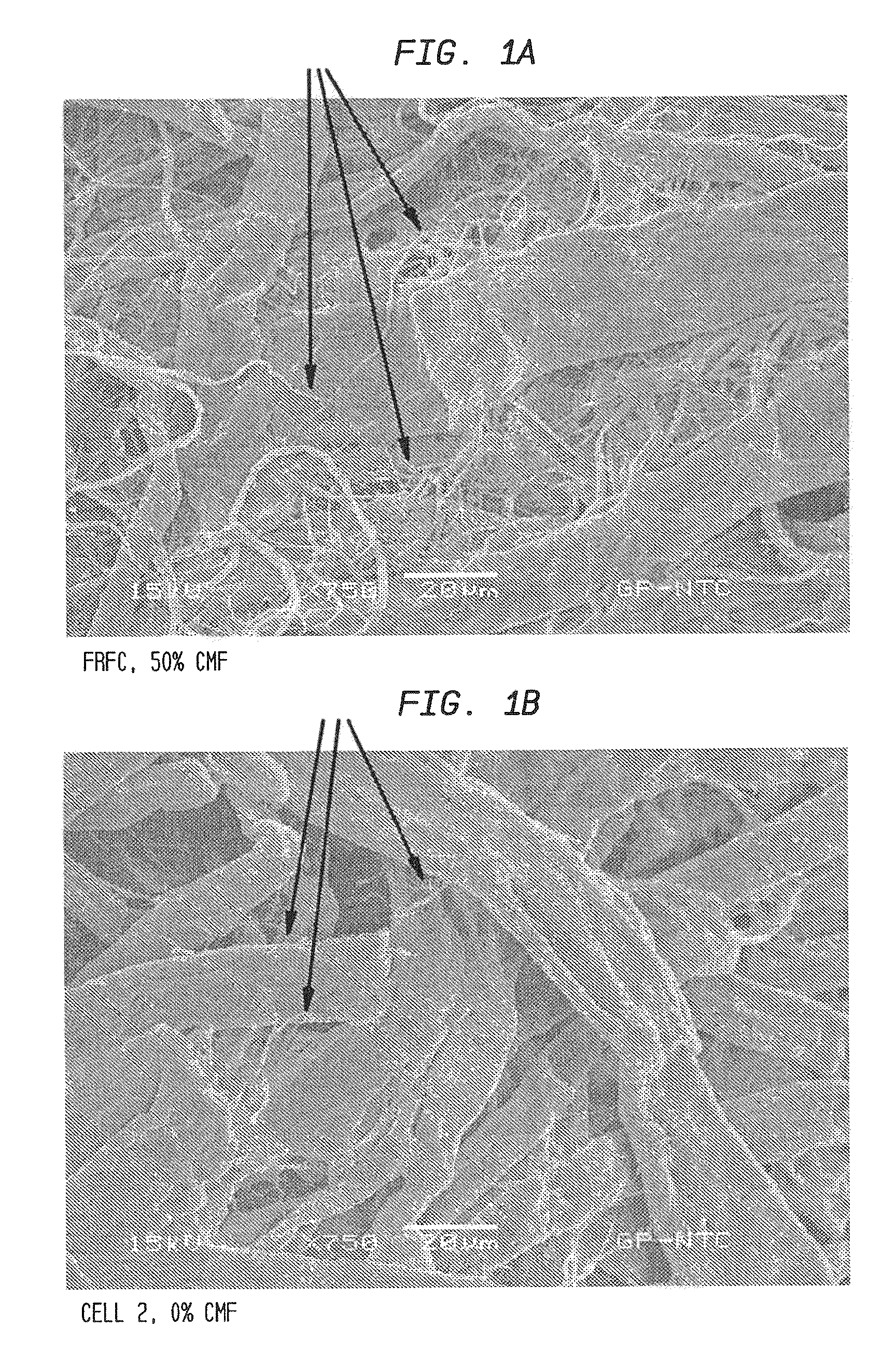 Base-sheet Cells BW CMC Amres Cell NBSK % CMF % lb/R lb/t lb/t Layered Comments 1 100 0 14 0 12 No Control, balanced charge 2 80 20 14 0 12 No 20% CMF, two-ply towel 3 60 40 14 0 12 No 40% CMF, two-ply towel 4 40 60 14 0 12 No 60% CMF, two-ply towel 5 100 0 14 12 40 No Control, high resin 6 80 20 14 12 40 No 20% CMF, two-ply towel, high wet 7 60 40 14 12 40 No 40% CMF, two-ply towel, high wet 8 40 60 14 12 40 No 60% CMF, two-ply towel, high wet 9 60 40 14 12 40 Yes 100% CMF on surface 10 60 40 14 12 40 Yes 100% CMF on surface, calender 11 40 60 14 12 40 No High wet/dry 3 lb/t GP-C in MC 1 and MC 2 12 40 60 14 12 40 No High wet/dry 3 lb/t GP-C, calender 13 60 40 14 12 40 No High wet/dry 3 lb/t GP-C in MC 1 and MC 2 Jet Speed, fpm 2450 Form Roll Speed, fpm 1574 Small Dryer Speed, fpm 1559 Yankee Speed, fpm 1251 Reel Speed, fpm 1190 Jet/Wire Ratio 1.56 Fabric Crepe Ratio 1.25 Reel Crepe Ratio 1.05 Total Crepe Ratio 1.31 Basesheet (perforated polymeric belt creped) Caliper Basis CD 8 Sheet Weight MD MD CD CD CD Wet Tens SAT GM GM Break Tensile CMF Amres ®, mils/ lb/ Tensile Stretch Tensile Stretch Finch Cured Capacity Tensile Modulus Wet/Dry Roll Percent lb/t 8 sht 3000 ft2 g/3 in. % g/3 in. % g/3 in. g/m2 g/3 in. gms/% Unitless 22989 0 12 77.7 14.0 1891 31.7 1556 6.5 345 364 1714 121 0.22 22988 0 12 77.5 14.5 1928 33.7 1539 6.4 317 354 1722 119 0.21 22990 20 12 74.6 14.1 1939 37.3 2068 7.6 554 336 2002 119 0.27 22992 20 12 73.4 14.3 2177 36.1 1886 6.4 561 332 2026 135 0.30 22996 40 12 86.9 14.0 1802 40.3 1931 9.1 486 377 1865 99 0.25 22997 40 12 83.9 14.5 1837 39.1 1766 8.6 544 373 1799 101 0.31 22998 60 12 94.8 13.8 1419 39.2 1324 9.1 445 392 1369 73 0.34 22999 60 12 94.6 14.8 1756 42.2 1340 9.9 520 404 1534 74 0.39 23010 0 40 88.2 14.3 1881 25.3 2490 6.6 924 403 2162 170 0.37 23012 0 40 84.2 14.9 2877 32.7 2086 6.4 696 435 2449 168 0.33 23015 20 40 87.0 14.0 2535 32.3 2701 8.0 1,155 410 2615 165 0.43 23017 20 40 88.2 14.6 2307 31.1 2235 6.3 1,078 410 2266 162 0.48 23019 40 40 89.1 14.5 2833 38.0 2393 8.6 968 399 2602 146 0.40 23020 40 40 93.8 14.6 2640 39.5 2468 9.2 1,147 400 2552 134 0.46 23024 60 40 99.4 14.1 2342 37.6 2216 9.8 1,077 431 2278 117 0.49 23025 60 40 92.0 14.5 2412 36.7 1868 8.6 993 403 2123 119 0.53 23027 40 40 97.1 14.0 2148 38.0 1950 9.3 810 432 2043 112 0.42 23028 40 40 93.4 14.4 2315 37.4 2075 9.2 845 416 2192 118 0.41 23032 60 40 104.1 13.8 2761 36.7 2453 9.3 1,325 473 2602 143 0.54 23034 60 40 70.6 14.4 3286 38.1 3058 9.5 1,378 395 3169 169 0.45 23036 40 strat 40 96.8 14.1 2811 38.2 2973 8.4 1,393 447 2891 159 0.47 Y* 23037 40 strat 40 95.9 13.9 3080 37.1 3047 7.8 1,432 446 3063 177 0.47 Y* 23038 40 strat 40 66.0 12.9 2895 37.7 2999 8.8 1,444 391 2946 163 0.48 Y* 23040 40 strat 40 62.4 13.0 2172 37.9 2315 8.0 1,050 356 2242 129 0.45 Y* *The overall composition of the Yankee side ply is 40% CMF by weight with the Yankee side layer of the headbox issuing substantially 100% CMF. Caliper Basis 8 Sheet MD Softness Weight mils/ Tensile MD CD Tensile CD Description Basesheet CMF Panel lb/3000 ft2 8 sht g/3 in. Stretch % g/3 in. Stretch % 1 P3424.1 22989 22988 0 6.26 28.6 184 3,321 29 2,949 7.4 2 P3425.1 23010 23012 0 4.88 29.6 204 4,057 28 4,547 8.3 3 P3426.1 23033 23032 60 4.73 27.9 227 5,156 31 4,379 9.7 4 P3427.1 23034 23032 60 4.62 28.4 215 5,191 30 4,382 9.6 5 P3428.1 23036 23037 40 5.37 28.0 221 5,007 31 5,082 9.1 6 P3429.1 23038 23040 40 5.75 25.8 185 4,315 30 4,499 8.9 7 P3430.1 23024 23025 60 5.77 28.5 203 4,773 34 3,958 10.4 8 P3431.1 23028 23027 40 7.29 27.7 205 3,791 31 3,624 10.2 9 P3432.053 23020 23019 40 29.2 182 5,696 35 4,999 9.9 10 P3432.083 23020 23019 40 29.2 240 4,487 31 4,032 9.6 11 P3531.053 23028 23027 40 27.8 183 4,413 32 3,970 10.0 12 P3531.083 23028 23027 40 27.7 225 3,825 31 3,143 10.2 13 P3432.1 23020 23019 40 5.14 29.2 205 5,377 35 4,672 11.1 14 P3433.1 22999 22998 60 8.02 28.3 193 3,584 38 3,142 12.4 15 P3434.1 23015 23017 20 4.67 28.8 204 4,761 32 4,895 9.6 16 P3435.1 22997 22996 40 6.75 28.7 186 3,579 36 3,535 11.0 17 P3436.1 22990 22992 20 6.33 29.3 182 3,554 32 3,536 8.3 Wet Tens CD Break GM Finch Tensile SAT SAT Modulus Wet Wipe Wipe Tensile Cured-CD Wet/Dry Capacity Rate SAT GM Extracted Dry Dry g/3 in. g/3 in. Unitless g/m2 g/s0.5 Times g/% Lint % Tops Bottoms 1 3,128 730 0.25 395 0.27 20 212 0.25 19 32 2 4,293 1,380 0.30 440 0.33 17 283 0.22 23 34 3 4,747 2,263 0.52 438 0.09 105 280 0.09 9 9 4 4,764 2,185 0.50 446 0.11 74 278 0.11 12 10 5 5,042 2,262 0.45 468 0.12 69 300 0.19 12 11 6 4,404 1,934 0.43 418 0.14 42 267 0.17 10 9 7 4,345 1,856 0.47 439 0.10 104 230 0.21 11 9 8 3,705 1,494 0.41 415 0.10 79 210 0.10 9 8 9 5,333 1,924 0.39 409 0.11 79 288 0.28 13 13 10 4,252 1,669 0.41 459 0.16 42 245 0.28 23 11 11 4,184 1,677 0.42 393 0.10 78 235 0.09 9 7 12 3,466 1,395 0.44 451 0.12 69 194 0.10 9 10 13 5,011 1,903 0.41 411 0.10 79 251 0.25 10 13 14 3,356 937 0.30 395 0.07 133 154 0.14 5 5 15 4,825 1,745 0.36 430 0.21 25 276 0.21 25 17 16 3,556 1,077 0.30 391 0.09 77 178 0.13 9 9 17 3,545 1,007 0.29 353 0.14 37 216 0.39 15 18