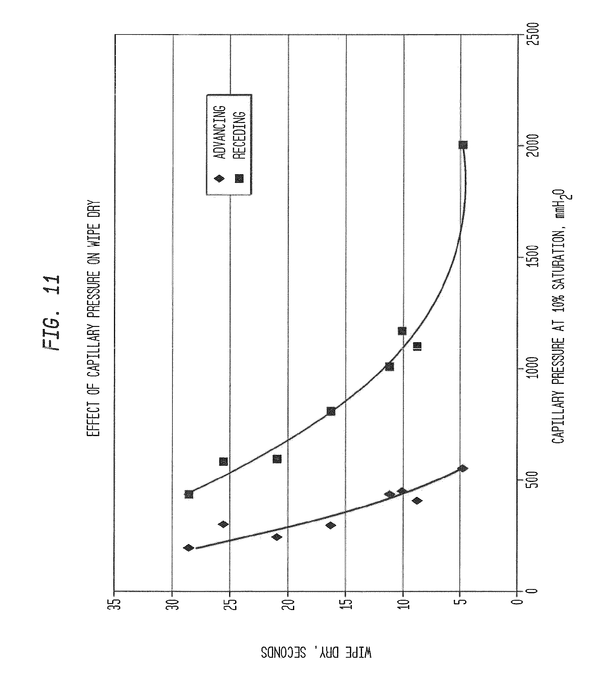 For fresh basesheet and finished product (aged 30 days or less for towel product, aged 24 hours or less for tissue product) containing wet strength additive, the test specimens are placed in a forced air oven heated to 105° C. (221° F.) for five minutes. No oven aging is needed for other samples. The Finch cup is mounted onto a tensile tester equipped with a 2.0 pound (8.9 Newton) load cell with the flange of the Finch cup clamped by the tester's lower jaw and the ends of tissue loop clamped into the upper jaw of the tensile tester. The sample is immersed in water that has been adjusted to a pH of 7.0±0.1 and the tensile is tested after a 5 second immersion time using a crosshead speed of 2 inches/minute (50.8 mm/minute). The results are expressed in g/3 in. or (g/mm), dividing the readout by two to account for the loop as appropriate. Wipe dry times are evaluated using a turntable wipe dry instrument with a spray fluid dispensing instrument, each being as described below. For purposes of this application, two standard test surfaces are used: stainless steel and black glass. To evaluate a sample, the paper is first pre-conditioned and conditioned as described below, the test surface cleaned with Windex® original glass cleaner from S.C. Johnson and Son, Racine, Wis., and then wiped dry with a lint-free wipe. The test sample is folded so that the fold extends in the cross machine direction and centered on the black foam side of the sample head, so that the machine direction runs perpendicular to the shaft (i.e., the machine direction is parallel to the directions of motion) and taped in position at its corners so that the sample's leading edge is the folded edge and the towel sample is flush with the right hand edge of the sample head. The sample head is placed on the test surface and the slack in the sample removed. Windex® original glass cleaner is sprayed on the test surface in an amount of 0.75±0.1 grams in the center of the area not occupied by the test head. The table is rotated for 3 revolutions at 30 to 32 rpm with the head in engagement with the test surface at a load of 1065 g spread over bearing surface dimensions of 23 cm×9.5 cm. After the turntable has made three revolutions, the area on the test surface to which the Windex® original glass cleaner was applied is observed and the elapsed time recorded until all of the Windex® original glass cleaner has evaporated. This time is recorded in seconds as the Wipe Dry Time. To quantify the amount of lint removed from towel, tissue, and related products (Extractable Lint), a Sutherland Rub Tester with 4.0-lb rub block is used. This is discussed above. After the samples to be evaluated are preconditioned at 10 to 35% RH at 22° to 40° C. for 24 hours, then conditioned at 50.0%±2.0% RH and 23.0±1.0° C. for 2 hours, all of the subsequent procedures are performed within the confines of a room maintained at between 48 to 53% RH and a temperature of between 22° C. and 24° C. Two stacks of four 2.25 in.×4.5 in. test strips with 4.5 in. length in the machine direction are cut from the sample with the top (exterior of roll) side up. Two 2.5 in.×6 in. strips of black felt are cut with the 6 in. length in the machine direction, and the top side labeled with sample ID numbers. A baseline reading for the felt is determined by taking one L* color reading on the labeled side of each black felt strip used for testing in the middle of what will be the rubbed area using a GretagMacbeth Spectrophotometer Model Ci5 as discussed above. The “before testing” reading is later compared to the “after testing” reading in the same area of the black felt strip on the same side, so particular care is taken to be sure that comparison are made only between the same felt strips. One L* color reading is taken on the labeled side of each black felt strip, reading the same spot used to obtain the “before testing” value, in the middle of the rubbed area. The “after testing” reading is paired up with the appropriate “before testing” reading to calculate the difference between the two readings—“ΔL*”. For each sample, the average, standard deviation, minimum and maximum test results are recorded as measured to the nearest 0.01 L* unit for both the before testing and after testing values. The difference value of the after reading minus the before reading is indicative of the lint removal by the standardized rubbing procedure. Liquid porosimetry is a procedure for determining the pore volume distribution (PVD) within a porous solid matrix. Each pore is sized according to its effective radius, and the contribution of each size to the total free volume is the principal objective of the analysis. The data reveals useful information about the structure of a porous network, including absorption and retention characteristics of a material. The procedure generally requires quantitative monitoring of the movement of liquid either into or out of a porous structure. The effective radius R of a pore is operationally defined by the Laplace equation: Eight finished product samples were analyzed for pore volume distribution testing. Measurements were performed on the TRI/Autoporosimeter®. The instrument and the PVD methodology are described in the paper “Liquid Porosimetry: New Methodology and Applications” by Dr. B. Miller and Dr. I. Tyomkin, published in the Journal of Colloid and Interface Science, 162, 163-170, (1994), the disclosure of which is incorporated herein by reference. The test liquid was 0.1% TX-100 solution in water, surface tension 30 mN/m. TX-100 is a surfactant. For reference, water at room temperature has a surface tension of 72 dyne/cm. Sample size was 30 cm2. The test started in an advancing mode and finished in a a receding mode. The advancing mode requires good contact with fine porous membrane in the test chamber. Therefore, samples were covered with a multi-pin plate as shown in Data from 1 micron to 500 microns rep