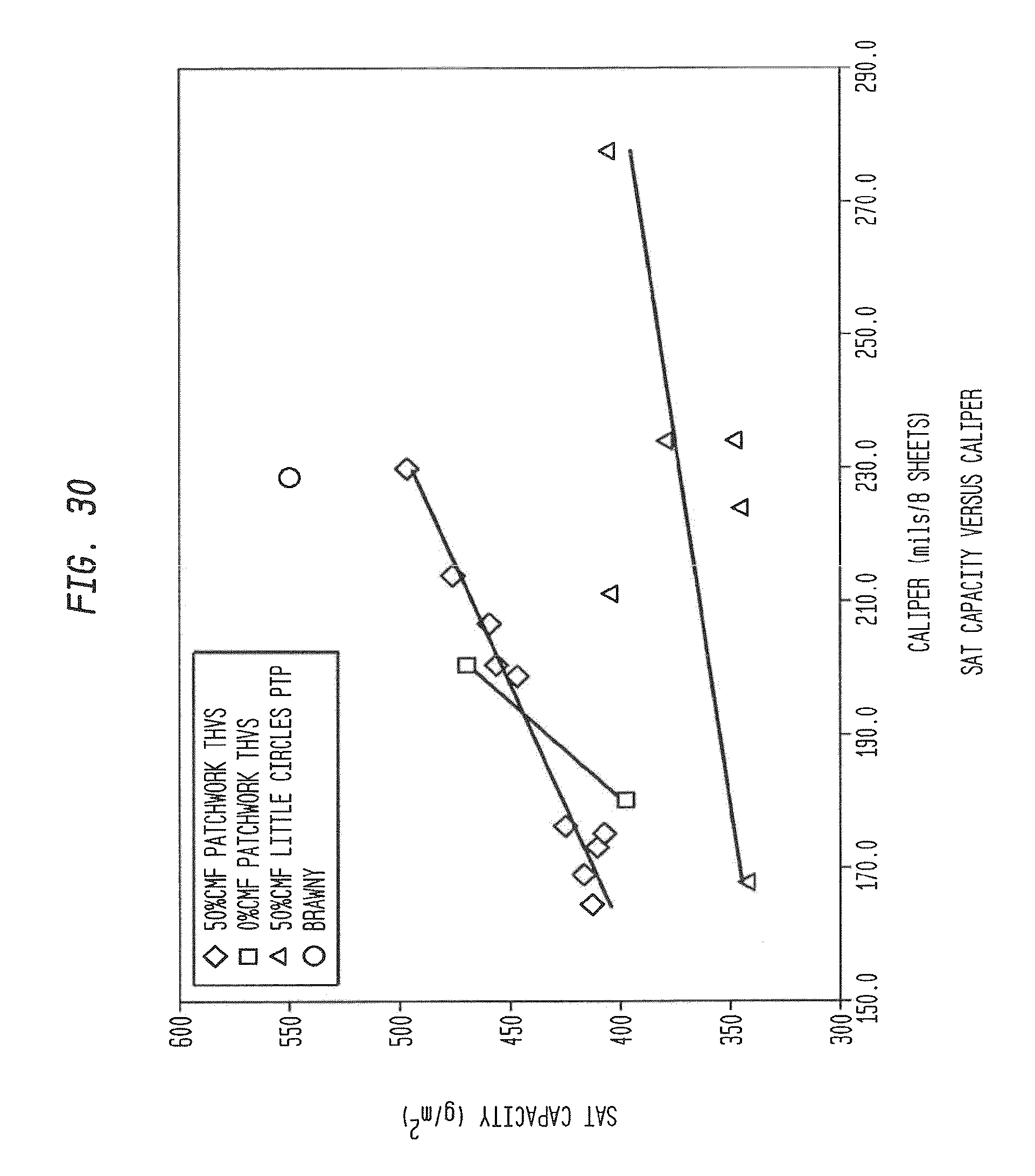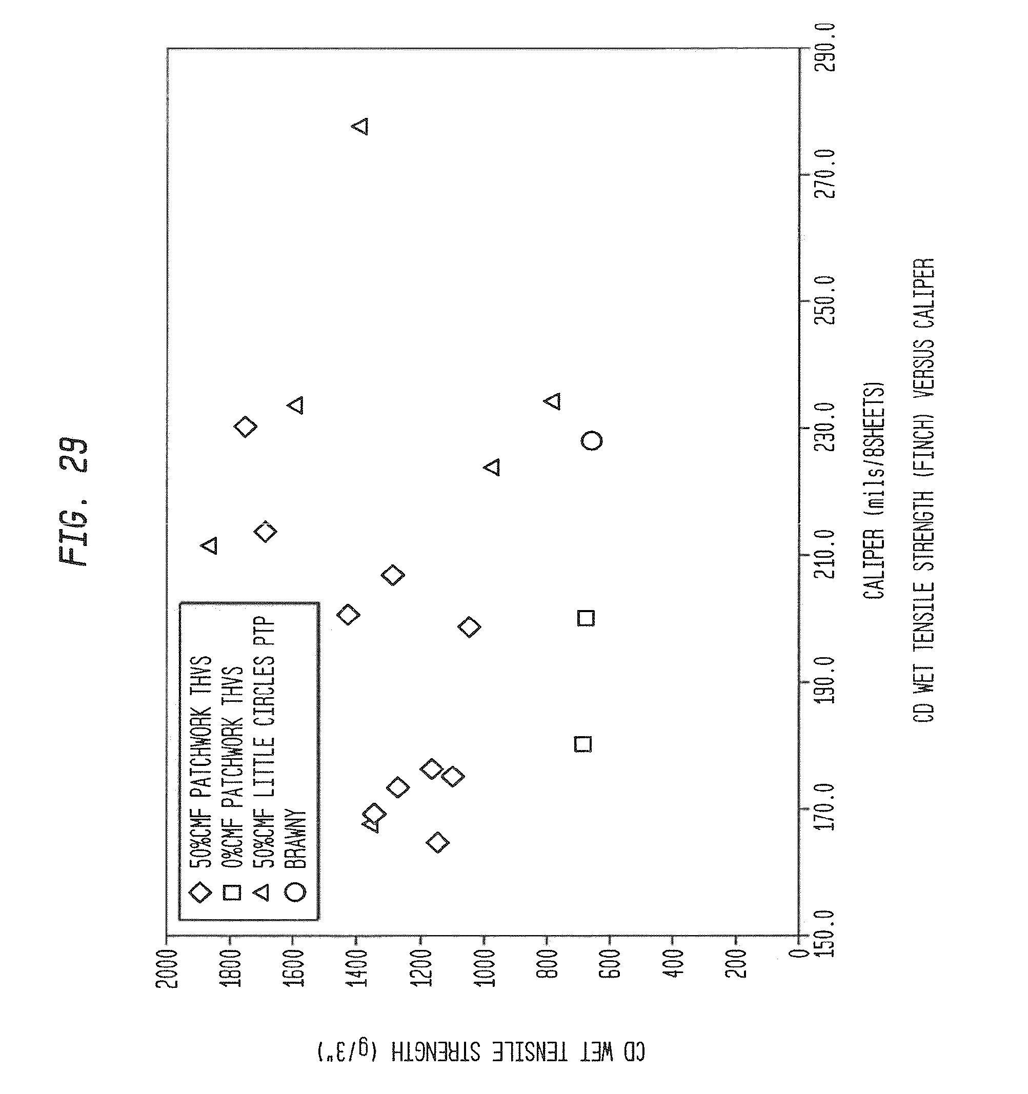 CD Wet Tens 8 Sheet Basis MD CD Finch Emboss TL Caliper Weight Tensile MD Tensile CD Cured- Cell ply 2008-1905 Description Furnish mils/8 sht lb/3000 ft2 g/3 in. Stretch % g/3 in. Stretch % g/3 in. 1 x 14-1 19721 229 50/50 M/A 85.1 15.3 1754 26.4 1638 5.5 587 15-1 19723 239 50/50 M/A 83.2 15.3 1695 23.3 1527 5.8 521 15 lb/ream Control Average (Calendered) 84.1 15.3 1,724 24.9 1,582 5.6 554 2 22-1 19731 1008 50/50 M/A 82.1 11.7 1745 19.8 1454 5.5 504 x 24-1 19733 1030 50/50 M/A 77.1 11.6 2054 20.8 1338 5.1 520 12 lb/ream Control Average (Uncalendered) 79.6 11.7 1,899 20.3 1,396 5.3 512 3 x 29-1 197381140 50/50 95.5 12.6 2059 30.9 1604 6.7 831 M/MCF 30-1 19739 1154 50/50 94.8 12.6 1972 30.6 1526 7.4 699 M/CMF 12 lb/ream Microfiber Average (Uncalendered) 95.1 12.6 2,016 30.8 1,565 7.0 765 4 36-1 19755 155 50/50 110.4 14.5 2791 33.6 2298 7.2 1,075 M/CMF x 37-1 19756 205 50/50 114.6 13.6 2429 37.4 2160 7.2 1,129 M/CMF 12 lb/ream Microfiber Average (Uncal, higher FC) 112.5 14.0 2,610 36.7 1,437 8.8 621 5 x 37-1 19756 205 50/50 114.6 13.6 2429 37.4 2160 7.2 1,129 M/CMF 38-1 19757 216 50/50 105.7 9.9 1,449 36.7 1,437 8.8 621 M/CMF 10 lb/ream Microfiber (Uncal, higher FC) 6 38-1 19757 216 50/50 105.7 9.9 1,449 36.7 1,437 8.8 621 M/CMF x 43-1 19762 310 50/50 M/ 59.4 9.9 1,612 27.1 1,362 8.0 768 CMF 10 lb/ream Microfiber (Calendered) 7 x 41-1 19760 248 50/50 M/ 94.8 10.2 1796 31.2 1550 8.1 791 CMF 42-1 19761 300 50/50 93.2 10.3 1921 29.3 1451 7.8 802 M/CMF 10 lb/ream Microfiber Average (Uncalendered) 94.0 10.2 1859 30.2 1501 7.9 797 GM CD GM Break Tensile Tensile CD Wet Specific Emboss TL Tensile Modulus Ratio Wet/Dry Breaking Bulk, Cell ply 2008-1905 Description Furnish g/3 in. gms/% Dry % Unitless length, m cc/g 1 x 14-1 19721 229 50/50 M/A 1693 142 1.07 0.36 310 10.9 15-1 19723 239 50/50 M/A 1607 140 1.11 0.34 274 10.6 15 lb/ream Control Average (Calendered) 1,650 141 1.09 0.35 292 10.7 2 22-1 19731 1008 50/50 M/A 1590 157 1.21 0.35 346 13.7 x 24-1 19733 1030 50/50 M/A 1657 164 1.54 0.39 361 13.0 12 lb/ream Control Average (Uncalendered) 1,624 160 1.37 0.37 354 13.3 3 x 29-1 197381140 50/50 1816 126 1.29 0.52 530 14.7 M/MCF 30-1 19739 1154 50/50 1734 116 1.30 0.46 446 14.6 M/CMF 12 lb/ream Microfiber Average (Uncalendered) 1,775 121 1.29 0.49 488 14.7 4 36-1 19755 155 50/50 2532 14.6 1.21 0.47 599 14.9 M/CMF x 37-1 19756 205 50/50 2290 14.7 1.13 0.52 670 16.5 M/CMF 12 lb/ream Microfiber Average (Uncal, higher FC) 1,442 81 1.01 0.43 507 20.9 5 x 37-1 19756 205 50/50 2290 141 1.13 0.52 670 16.5 M/CMF 38-1 19757 216 50/50 1,442 81 1.01 0.43 507 20.9 M/CMF 10 lb/ream Microfiber (Uncal, higher FC) 6 38-1 19757 216 50/50 1,442 81 1.01 0.43 507 20.9 M/CMF x 43-1 19762 310 50/50 M/ 1,482 102 1.18 0.56 623 11.7 CMF 10 lb/ream Microfiber (Calendered) 7 x 41-1 19760 248 50/50 M/ 1668 105.2 1.16 0.51 625 18.2 CMF 42-1 19761 300 50/50 1669 111.1 1.32 0.55 628 17.6 M/CMF 10 lb/ream Microfiber Average (Uncalendered) 1669 108 1.24 0.53 626 17.9 M = Northern SW Kraft; A = Aracruz Base Sheet Assignment and Estimated Finished Product Physical Properties Emboss Basesheet Sheet Caliper Roll Diameter CD Wet Tensile Emboss cell Ply Roll # Count (mils/8 sheets) (inches) (“Finch Cup”) (g/3 in.) Penetration 1 x 19721 48 248 ± 5 5.0 ± 0.1 500 65 19723 2 19731 48 float float 500 x 19733 65 3 x 19738 48 float float 750 65 19739 4A 19755 48 float float 1100 x 19756 65 4B 19755 48 max >5.0 >1100 x 19756 60 5A x 19756 48 float float 850 65 19757 5B x 19756 48 max >5.0 >850 60 19757 6A 19757 48 float float 700 65 x 19762 6B 19757 48 float float 700 60 x 19762 7A x 19760 48 float float 800 65 19761 7B x 19760 48 float float 800 60 19761 7C x 19760 48 float float 800 55 19761 Properties of Rolls Converted with THVS Emboss in THVS Mode Cell ID 1 2 3 4A 4B 5A Furnish 50/50 50/50 M/Aracruz M/CMF Basis Weight (lb/3000 ft2) 29.0 23.0 24.4 27.2 26.2 22.0 Caliper (mils/8 sheet) 200 180 199 230 214 207 MD Tensile (g/3 in.) 2539 2487 3599 5713 6007 3638 MD Stretch (%) 19.2 15.6 21.1 25.1 26.3 24.1 CD Tensile (g/3 in.) 2317 1974 2473 3739 3738 2828 CD Stretch (%) 5.4 5.4 7.3 6.9 7.6 8.3 GM Tensile (g/3 in.) 2423 2215 2982 4620 4736 3206 CD Wet Tensile - Finch (g/3 in.) 670 676 1048 1749 1683 1278 CD Tensile Wet/Dry (Unitless) 0.29 0.34 0.42 0.47 0.45 0.45 SAT Capacity (g/m2) 469 399 447 497 476 460 GM Break Modulus (g/%) 242.4 241.9 239.7 346.3 330.3 223.9 GM Modulus (g/% Stretch) 42.0 46.3 37.3 44.8 40.6 34.2 Roll Diameter (in) 4.98 4.78 4.82 5.25 4.89 4.81 Roll Compress Value (%) 19.7 20.4 16.5 20.9 16.4 15.7 Sensory Softness 8.19 6.76 6.19 4.30 4.52 5.54 Wet Extracted Lint (%) 0.069 0.050 0.063 0.076 0.080 0.062 Wipe Dry Top 17 26 14 13 15 15 (Black Glass) Bottom 16 28 12 15 13 17 (s) Average 16 27 13 14 14 16 Wipe Dry Top 18 26 14 16 16 22 (Stainless Steel) Bottom 20 22 15 13 15 14 (s) Average 20 22 15 13 15 14 Wet Lint (Pigskin) - FQA Fiber Count 1601 808 786 884 814 631 (Number) Cell ID 5B 6A 6B 7A 7B 7C Furnish 50/50 M/CMF Basis Weight (lb/3000 ft2) 22.1 19.5 19.4 19.5 19.6 19.6 Caliper (mils/8 sheet) 200 175 165 176 173 169 MD Tensile (g/3 in.) 3856 2554 3051 3539 3680 3971 MD Stretch (%) 24.6 20.9 21.1 21.1 21.1 21.2 CD Tensile (g/3 in.) 3113 2332 2619 2598 2702 2983 CD Stretch (%) 8.3 8.3 8.3 8.0 7.9 8.2 GM Tensile (g/3 in.) 3464 2438 2824 3031 3152 3441 CD Wet Tensile - Finch (g/3 in.) 1418 1095 1141 1162 1263 1343 CD Tensile Wet/Dry (Unitless) 0.46 0.47 0.44 0.45 0.47 0.45 SAT Capacity (g/m2) 456 408 413 424 411 416 GM Break Modulus (g/%) 246.4 187.2 211.4 235.2 246.0 263.1 GM Modulus (g/% Stretch) 33.8 34.3 34.7 34.9 35.9 36.1 Roll Diameter (in) 4.77 4.55 4.35 4.67 4.63 4.34 Roll Compress Value (%) 14.5 14.6 14.3 16.5 17.2 13.5 Sensory Softness 5.26 7.35 6.94 5.75 5.47 5.12 Wet Extracted Lint (%) 0.069 0.055 0.063 0.048 0.048 0.050 Wipe Dry Top 14 15 13 14 17 18 (Black Glass) Bottom 20 19 18 16 20 20 (s) Average 17 17 15 15 18 19 Wipe Dry Top 20 24 21 25 28 21 (Stainless Steel) Bottom 18 18 19 21 27 23 (s) Average 18 18 