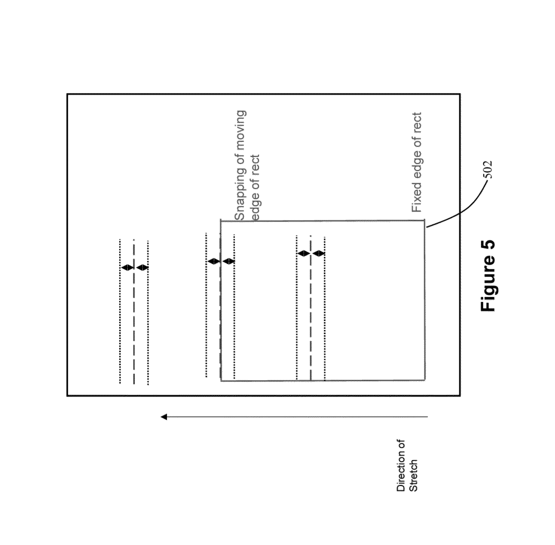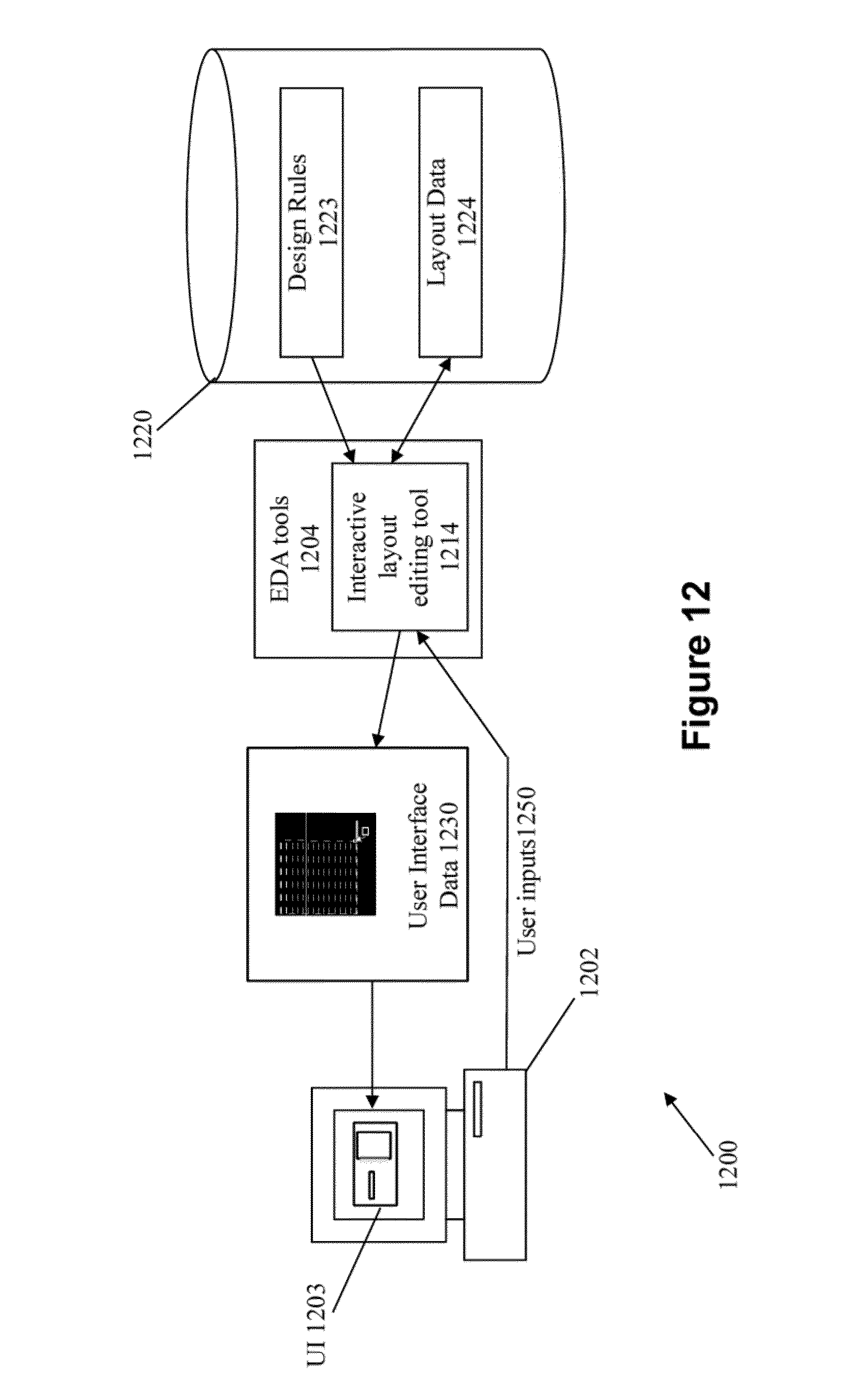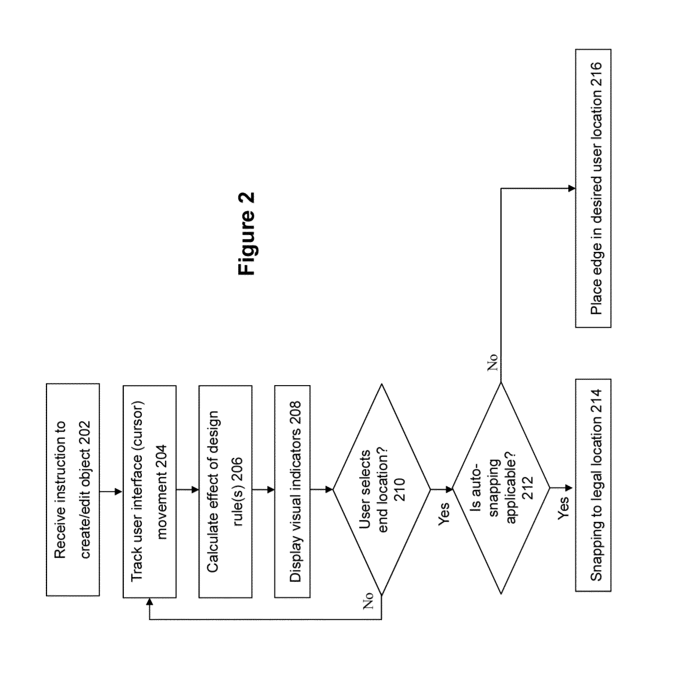At 206, the effects of the applicable rules/constraints (hereinafter collectively referred to as constraints) are considered in light of the user interface actions by the user. As described in more detail below, the effects of the user's actions in the interface are analyzed to the dimensions of the object, and those effects are calculated relative to the constraints. Legal locations and/or dimensions for the object edge will be calculated and identified. At 208, visual indicators are provided to the user in the user interface pertaining to the constraints. The general idea is that when the cursor reaches a certain distance from a legal placement location for an edge, the cursor in the user interface will be snapped to the location that is a legal location. This distance is referred to herein as the “aperture” distance (which may be also referred to herein as “aperture range”, “aperture window”, or just “aperture”). This approach therefore provides a helpful visual indicator to the user reflected by gravitation of the ghosted edge to the correct valid/legal location for that edge. Even if the cursor is still being moved, the cursor location will not visually change from that legal location while the cursor is within the aperture range. However, when the cursor is not within the aperture distance, then the visual location of the cursor on the user interface is not snapped to the legal location and instead moves correspondingly to the movement of the cursor. In addition, in the situation where the cursor is currently within an aperture range (and thus movement of the cursor does not cause the visual location of the cursor to change), and if the cursor is eventually moved far enough along such that the cursor leaves the aperture range, then the visual cursor location on the user interface will jump to that location and will thereafter move correspondingly to the movement of the cursor (at least until it enters another aperture range). The process continues until the user sets the location for the other edge of the object (which is checked at 210). A determination is then made at 212 whether auto-snapping should occur. This determination is made because auto-snapping is not performed for all user actions. Instead, auto-snapping can be configurably performed only for certain circumstances. For example, if the user sets the location for the edge while within the aperture range, then the edge of the object will snap to the legal location that is currently being displayed (214). On the other hand, if the cursor is not currently within the aperture range of a legal location, then the object edge will be placed at the exact location indicted by the user (216). At 304, the applicable rule(s) are identified. For example, as described above, the applicable rules may pertain to allowable width range constraints for objects on certain layers of the design. At 306, dimensions and edge distances are checked with regards to one or more objects in the layout. This may happen in response to actions taken by a user using an interactive editing tool, e.g., based upon movement of a cursor by the user. In some embodiments, this analysis occurs by constructing a data model of the layout, for example by performing a Boolean operation (e.g., the Boolean OR operation) of the shapes in the layout, where movement of the cursor causes a callback to the function for constructing this data model. Distances are checked between the objects in the structure. In addition, the grid of allowable edge locations can be identified relative to the edges on the layout. If the cursor reaches an aperture range (identified at 308), then a determination is made of the correct location for the object edge within that window. This may occur in both, or either, of the vertical and horizontal directions. The information is visually presented to the user using one or more visual cues, such as by using different colorations (e.g., with different colors for valid/legal and invalid/illegal locations), changes in visual cursor behavior, and/or by presenting visual artifacts (such as additional colored lines) that indicate the valid locations. In addition, while the cursor is within the aperture range, the user interface can visually lock in the shape of the object with a ghosted image for the valid object dimensions/edge. If the user moves the cursor within the aperture range, then at 310, gravitation occurs relative to that valid and/or legal location. However, if the edge location is not within the aperture range, then at 312, the object edge does not gravitate to the nearby valid/legal location. This approach therefore provide for configurable gravitation (configuring the gravity and/or aperture range), which greatly facilitates user editing of objects when the user intends to configure an edge to a valid location. However, the approach also allows the user to exactly set an object edge/dimension, even at locations that are not currently valid. The ability to set the aperture to configure this functionality makes this approach non-obtrusive to the user for times when snapping is not desired, and yet greatly increases design efficiencies for times when snapping is desired. As shown in As shown in The same concepts can be applied in any direction. For example, as shown in The inventive approach can be applied in multiple directions. For example, as shown in The inventive approach can also be applied to create or edit polygons. For example, as shown in As illustrated in The invention is also applicable to islands in the layout. Islands are formed when two or more shapes on the same layer overlap or abut. The inventive approach can also be applied to hierarchical islands. A hierarchical island is formed when two or more) shapes on the same layer and belonging to different levels of hierarchy overlap or abut. The electronic designs may be stored in a computer readable storage device 1220. Computer readable storage device 1220 com