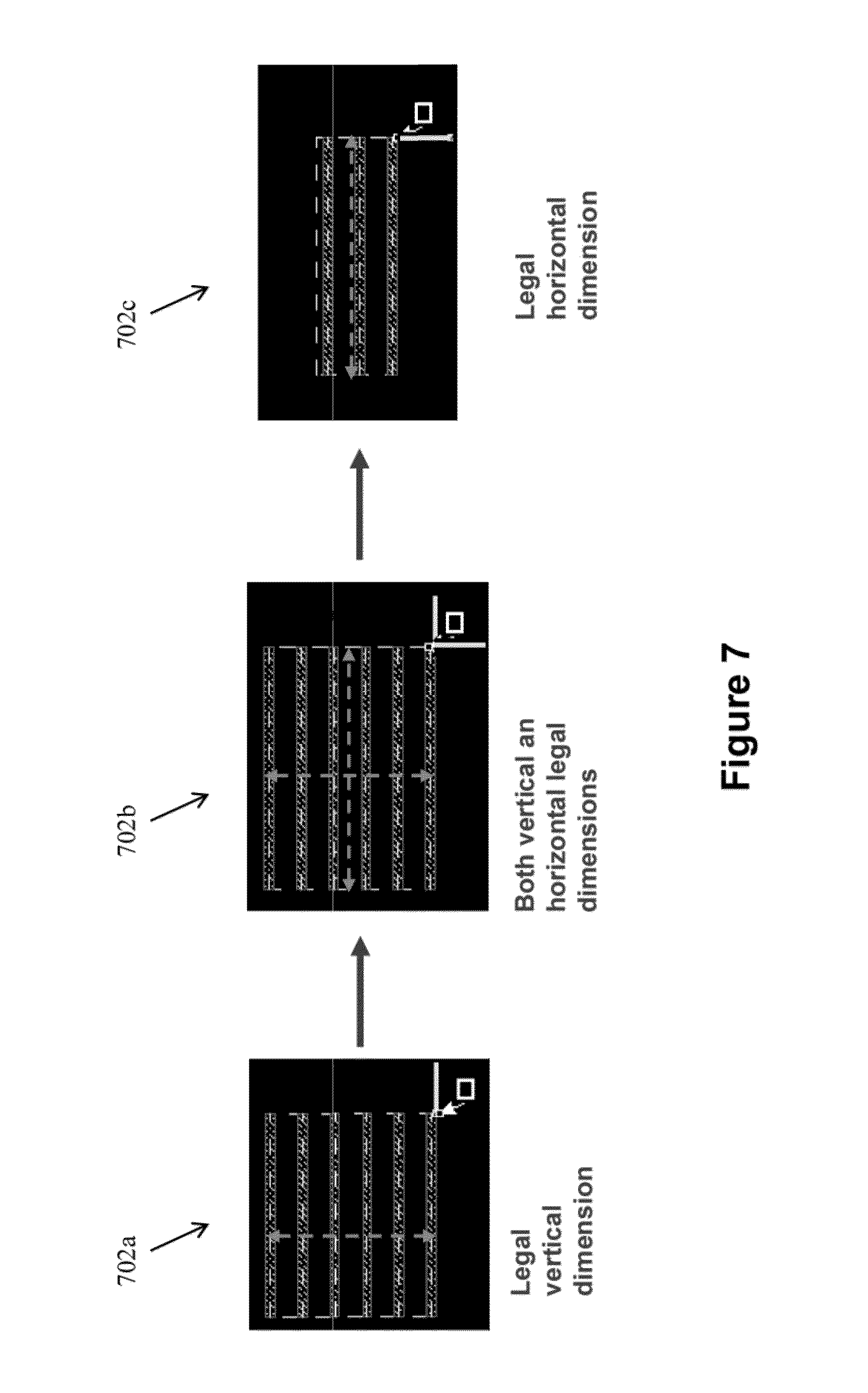 As another example, consider a constraint where the allowed width ranges for “Poly” layers are measured horizontally for (x1 x2 x3 x4 x5 x6 x7 “>=x”) and the allowed width ranges for the “Poly” layer measured vertically are (“>=y”). This constraint can be interpreted as follows: