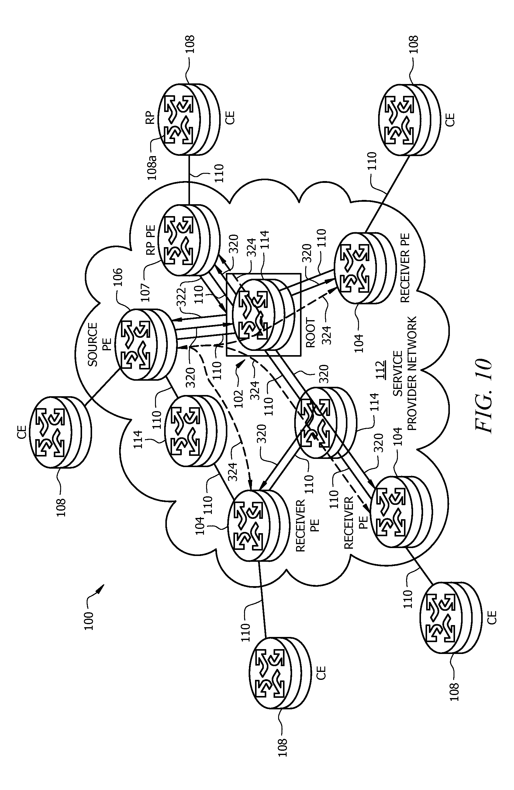 create a protocol independent multicast (PIM) state, wherein the PIM state is an (S, G) state; send a first unicast data message to a rendezvous point (RP) PE router using the PIM state, wherein the first unicast data message is a PIM register message encapsulated as a unicast multiprotocol label switching (MPLS) packet; receive a PIM join message from the RP PE router, wherein the PIM join message triggers creating a second PIM state, wherein the second PIM state is an (S, G) state, wherein S represents one of a source and a source address and G represents one of a group and a sparse mode destination address; send a second unicast data message to the RP PE router via a default multicast distribution tree (MDT) using the second PIM state, wherein the second unicast data message is different from the first unicast data message; receive a PIM register-stop message from the RP PE router, wherein the PIM register-stop message suspends sending the second unicast data message; and send multicast data traffic via the default MDT. 14. The computer program product of 15. The computer program product of 16. The computer program product of monitoring a rate multicast data traffic within the default MDT; determining that the rate exceeds a threshold; sending a MDT join message to at least one receiver PE router in response to determining, wherein the MDT join message comprises an MDT number that identifies a data MDT; receiving a path message from the at least one receiver PE router and thereby forming the data MDT; and sending multicast data traffic via the data MDT. 17. The computer program product of 18. The computer program product of 19. The computer program product of 20. The computer program product of