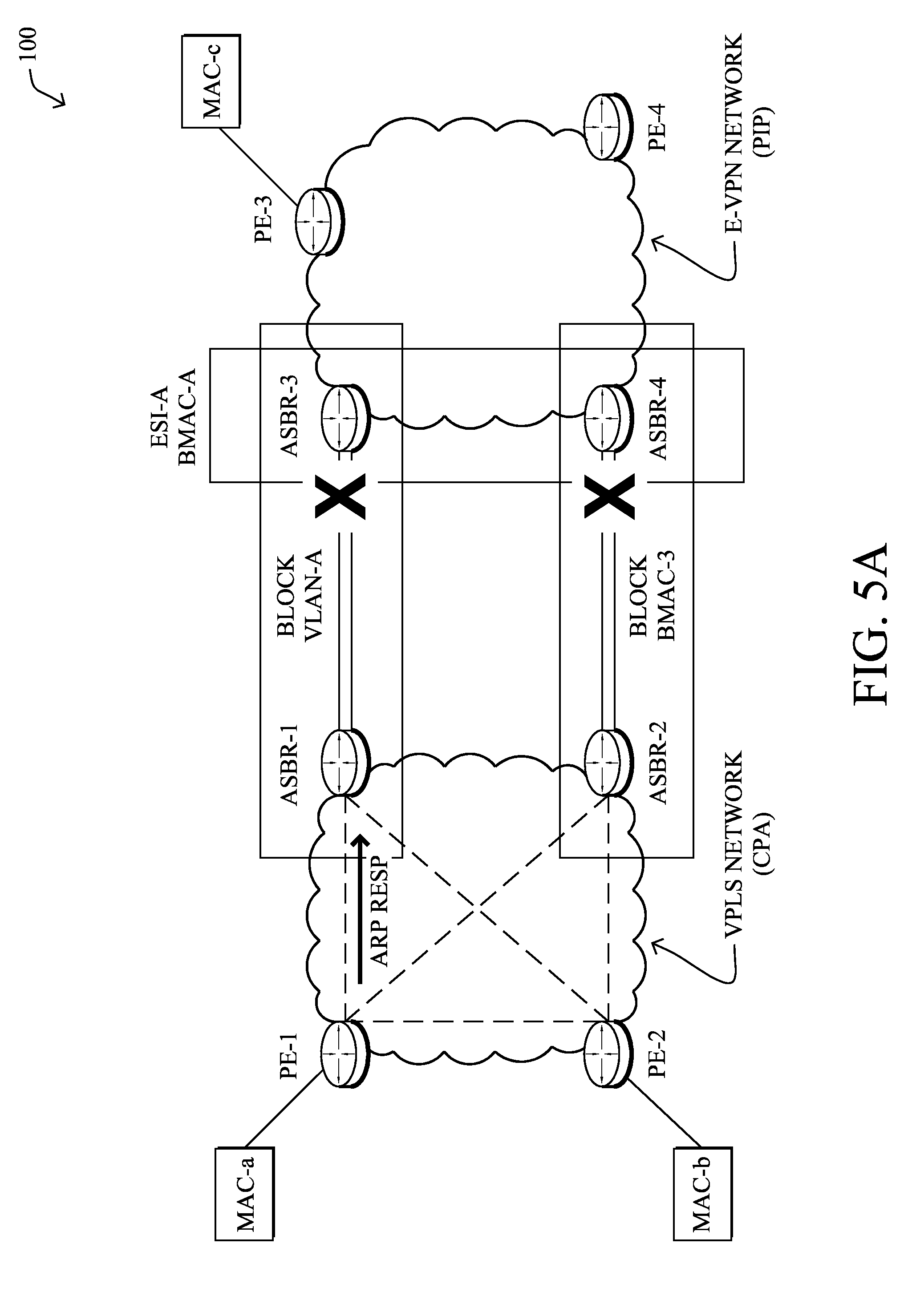 In particular, when applied in the PBB-EVPN to VPLS direction, the ASBRs on the PBB-EVPN side would discover each other via the exchange of the E-VPN Ethernet Segment routes (e.g., per <draft-ietf-12vpn-evpn> mentioned above). Each ASBR may then calculate an IGP shortest path first (SPF) (or shortest path tree, SPT) rooted at its peer(s) (e.g., ASBR3 calculates an IGP SPF rooted at ASBR4, and vice versa). When an ASBR receives a MAC Advertisement route for a given MAC (M1) with next-hop IP address (IP1), it calculates the IGP distance from itself to IP1 as well as the IGP distance from its peer ASBR(s) to IP1. If the ASBR finds that its distance to IP1 is shorter, it designates itself as the DF for traffic sourced from M1. Otherwise, the peer ASBR would be the DF for said MAC address. This effectively ensures that an ASBR which is on the optimal forwarding path of unicast traffic from M1 is also the DF for multi-destination traffic originating from M1. Note that in this PBB-EVPN to VPLS direction, the ASBRs perform DF filtering based on the traffic's source MAC address. Regarding the VPLS to PBB-EVPN direction, the DF election can be on a per-service-instance basis, since the PBB-EVPN PEs will perform control-plane based MAC learning. However, the ASBRs only filter multi-destination traffic in this direction (and not unicast traffic as was the case with MHN). With the techniques described herein, the VPLS PEs' MAC tables will be stable, and shortest-path forwarding is guaranteed (generally) between the two domains. As an example of the techniques herein, The techniques herein may be further illustrated with reference to As an alternative example, The procedure 900 illustratively ends in step 945, though with the ability to continue updating SPF trees, receiving MAC advertisements, receiving traffic on which to perform DF filtering, etc. It should be noted that while certain steps within procedure 900 may be optional as described above, the steps shown in The techniques described herein, therefore, provide for redundancy for inter-AS L2VPN service with optimal forwarding. In particular, the techniques herein support the interconnect of VPLS and (PBB)-EVPN domains with optimal forwarding, while ensuring MAC table stability within the VPLS PEs and also ensuring that no duplicate frame delivery occurs. That is, the techniques herein use an IGP metric to select the shortest path, and extend E-VPN forwarding mechanisms to ensure that known unicast and BUM traffic follow a congruent path for any given source B-MAC for L2VPN services (that employ symmetric link costs). Notably, the techniques described herein operate without requiring that a single edge device be responsible for forwarding traffic on a given VLAN (for both single-destination and multi-destination traffic), as do other current techniques which do not meet the requirements of optimal forwarding based on IGP distance. While there have been shown and described illustrative embodiments that provide redundancy for inter-AS L2VPN service with optimal forwarding, it is to be understood that various other adaptations and modifications may be made within the spirit and scope of the embodiments herein. For example, the embodiments have been shown and described herein with relation to particular types of networks and associated protocols and terminology. However, the embodiments in their broader sense are not as limited, and may, in fact, be used with other types of networks and/or protocols, where suitable. For example, the use of VPLS and PBB-EVPN networks are merely one example implementation, and they are not meant to be limiting to the scope of the embodiments herein. The foregoing description has been directed to specific embodiments. It will be apparent, however, that other variations and modifications may be made to the described embodiments, with the attainment of some or all of their advantages. For instance, it is expressly contemplated that the components and/or elements described herein can be implemented as software being stored on a tangible (non-transitory) computer-readable medium (e.g., disks/CDs/RAM/EEPROM/etc.) having program instructions executing on a computer, hardware, firmware, or a combination thereof. Accordingly this description is to be taken only by way of example and not to otherwise limit the scope of the embodiments herein. Therefore, it is the object of the appended claims to cover all such variations and modifications as come within the true spirit and scope of the embodiments herein.TECHNICAL FIELD