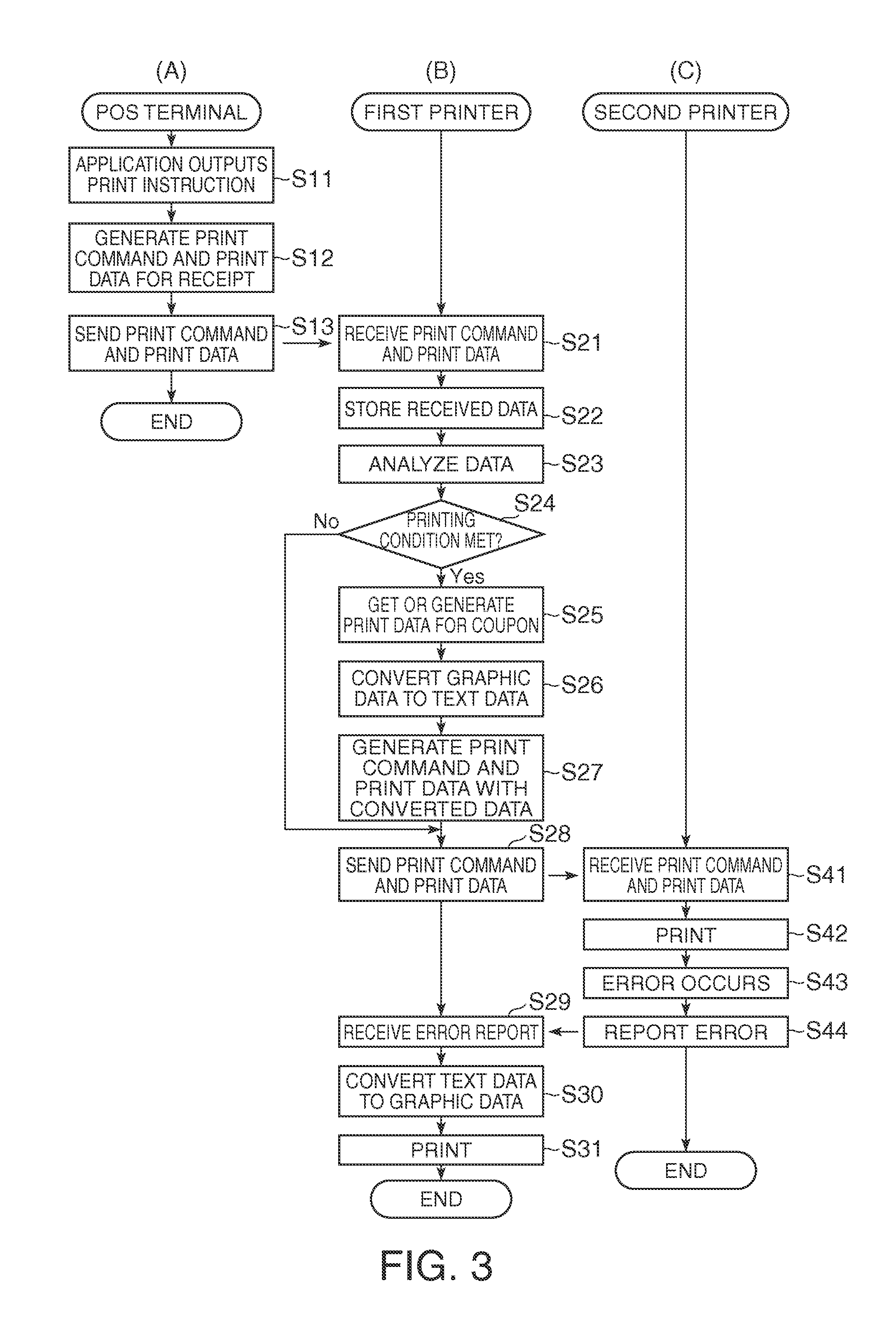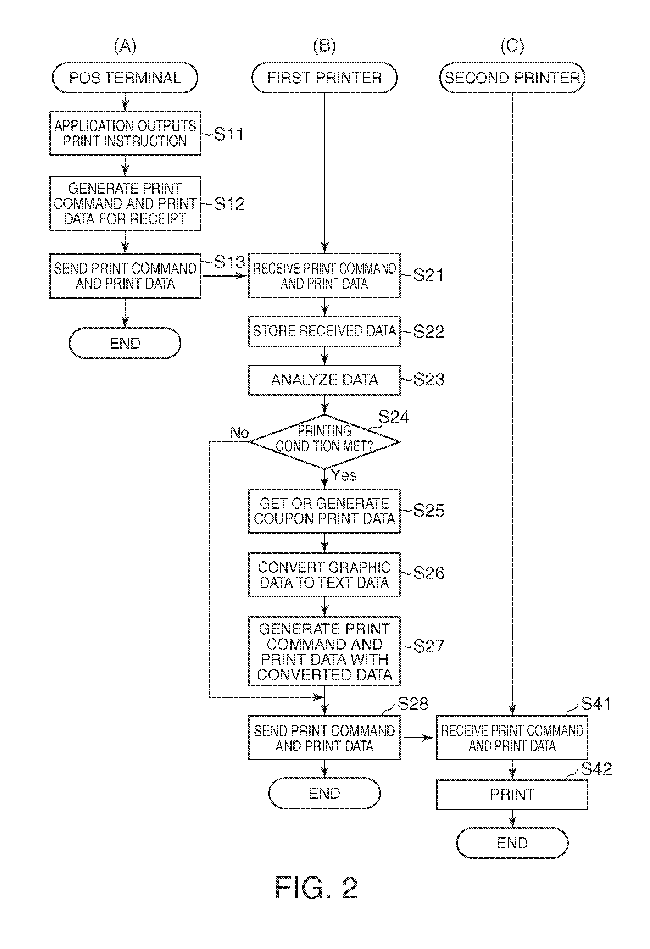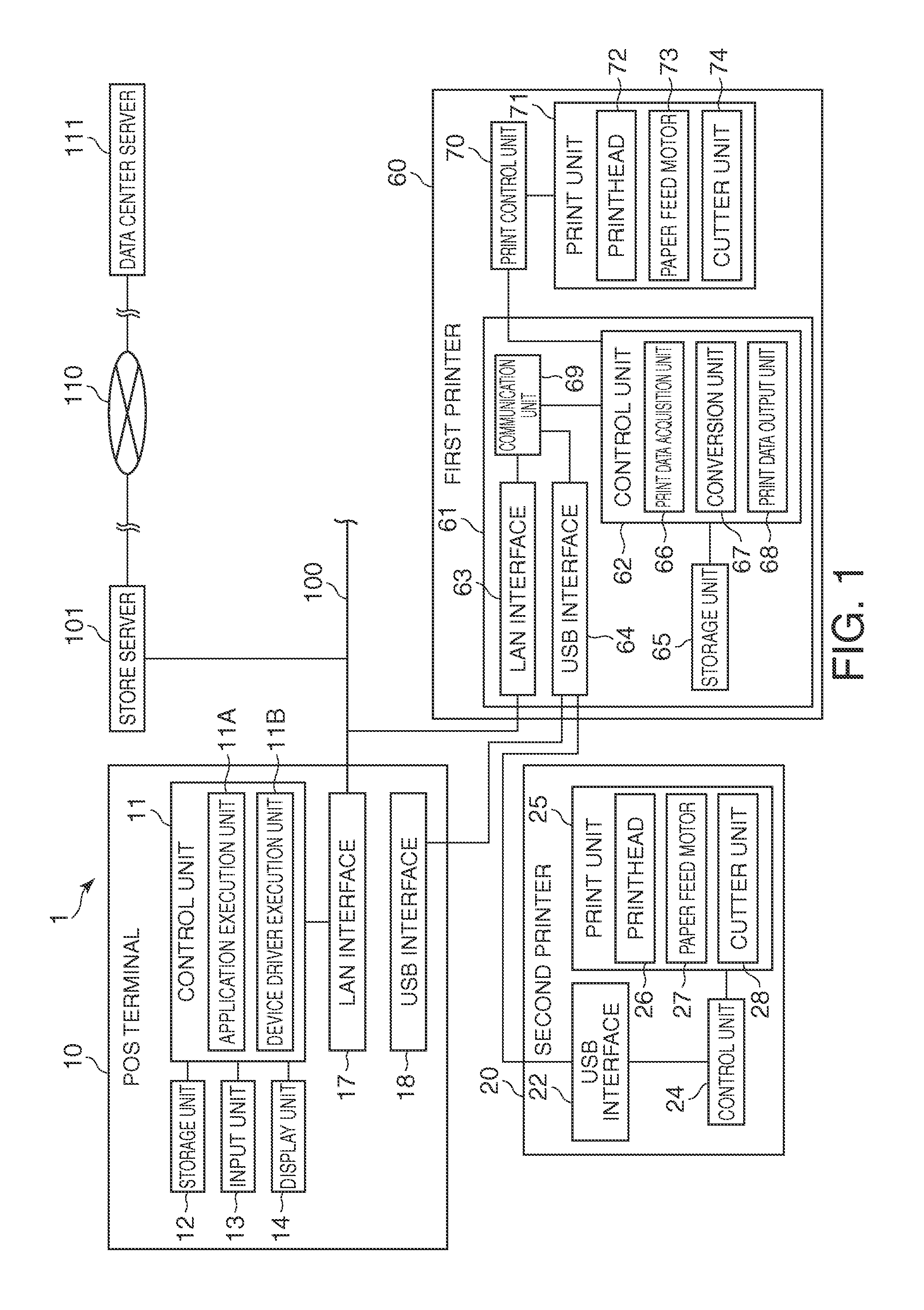 A printer can be connected to a computer or other host device without being limited by the type of data processed by the printer. A POS system 1 has a POS terminal 10 connected to a first printer 60 that has a print unit 71. The print data acquisition unit 66 of the first printer 60 acquires data output by the POS terminal 10. A conversion unit 67 applies at least one of a process of converting graphic data to text data, and a process of converting text data to graphic data, to the data acquired by the data acquisition unit 66, and the conversion unit 67 outputs the resulting converted data.