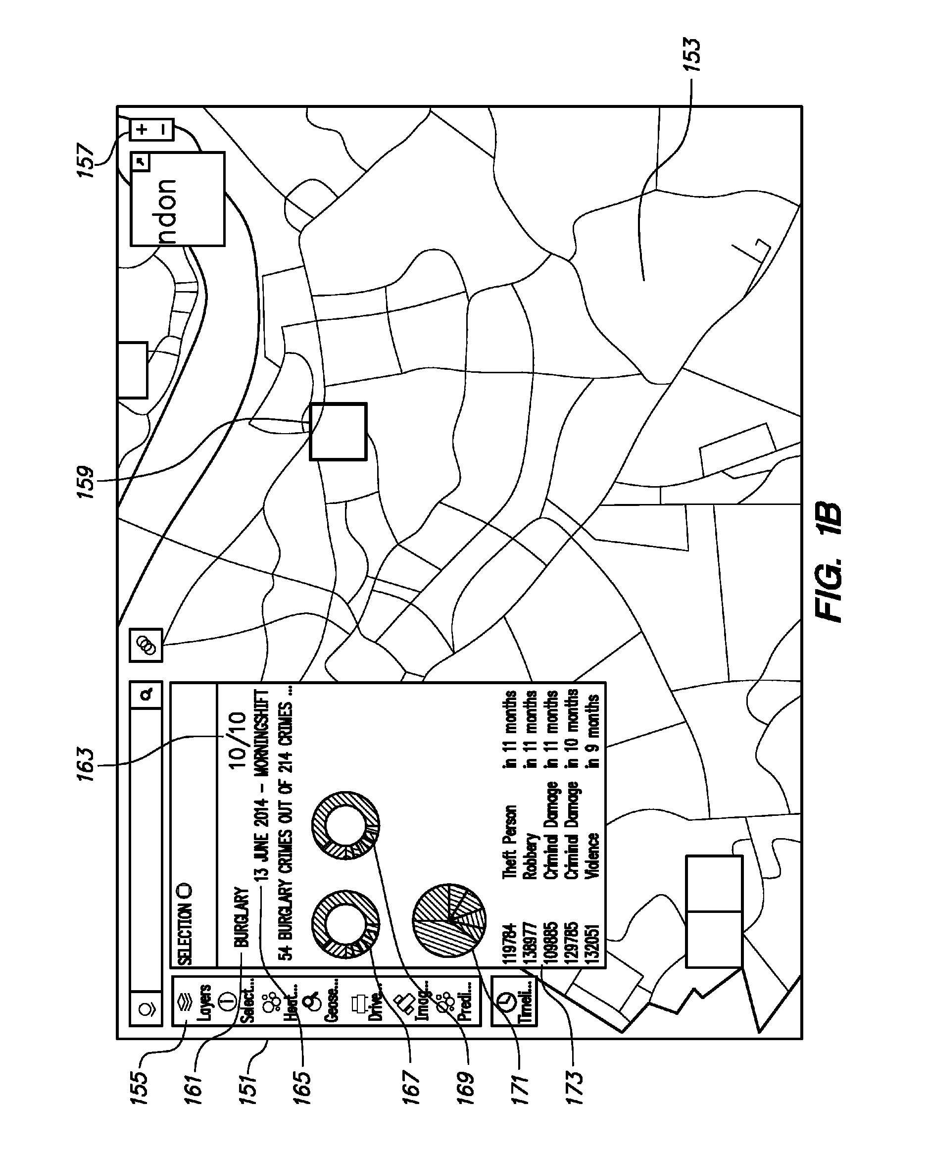 FIG. 1A is a screen shot of a computer graphical user interface showing an example generated crime risk forecast overlay to an interactive geospatial basemap according to an embodiment of the present invention.