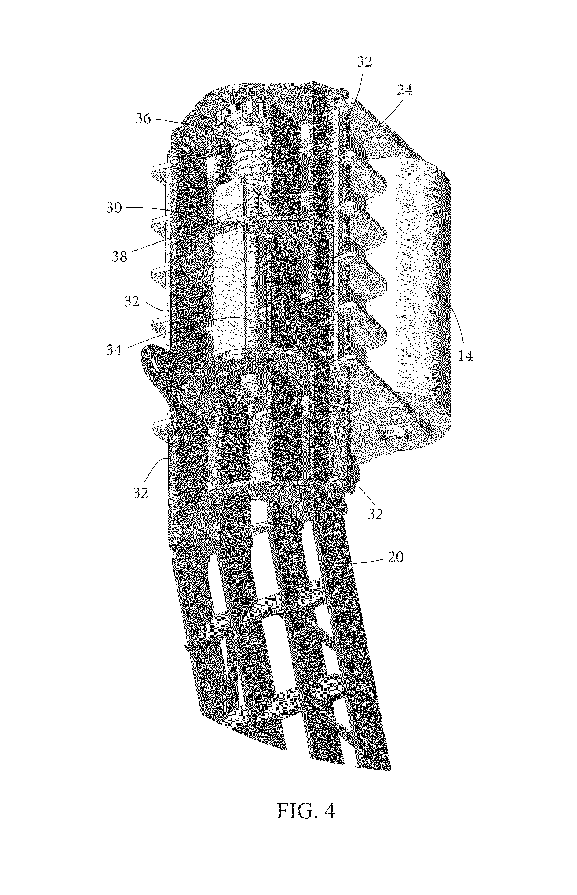 The support structure 12 comprises a base 18, a pair of support arms 20, a pair of adjustable braces 22, a pair of spring biased movable carriages 24, and a hydraulic actuator 26. The support structure 12 (excluding the hydraulic actuator 26) is formed primarily of laser cut pieces of steel that are interlocked with each other and that are thereafter welded together. Each of the support arms 20 comprises a proximal portion 28 that is pivotally attached to the base 18 near the center of the base. In normal operation, the support arms 20 extend upward and outward from the base 18 and are held in that upright configuration by the adjustable braces 22. Each of the adjustable braces 22 is attached to the base 18 and to the distal portion 30 of a respective one of the support arms 20. Each carriage 24 is slideably attached to the distal portion 30 of a respective one of the support arms 20 in a manner such that the carriage is able to translate along an axis relative to the distal portion, but is otherwise constrained by the support arm. Those axes are defined by railing components 32 that secure the carriages 24 to the support arms 20. The distal portion 30 of each support arm 30 also comprises a threaded rod 34, a compression spring 36, and an adjustable spring stop 38 (see FIG. 4). The threaded rod 34 acts as an adjustment screw that repositions the spring stop 38 along the axis of the rod. The compression spring 36 is sandwiched between the spring stop 38 and the carriage 24 in a manner such that movement of the carriage 24 toward the center of the idler assembly 10 relative to the distal portion 30 of the respective support arm 20 is resisted by the spring. Preferably, each compression spring 36 has a stiffness of 2200 lbs/inch and allows for a maximum compression of only one inch. Thus, in normal operation (as is further described below), the carriage 24 is able to move linearly relative to the support arm 20, but only by a relatively small amount.