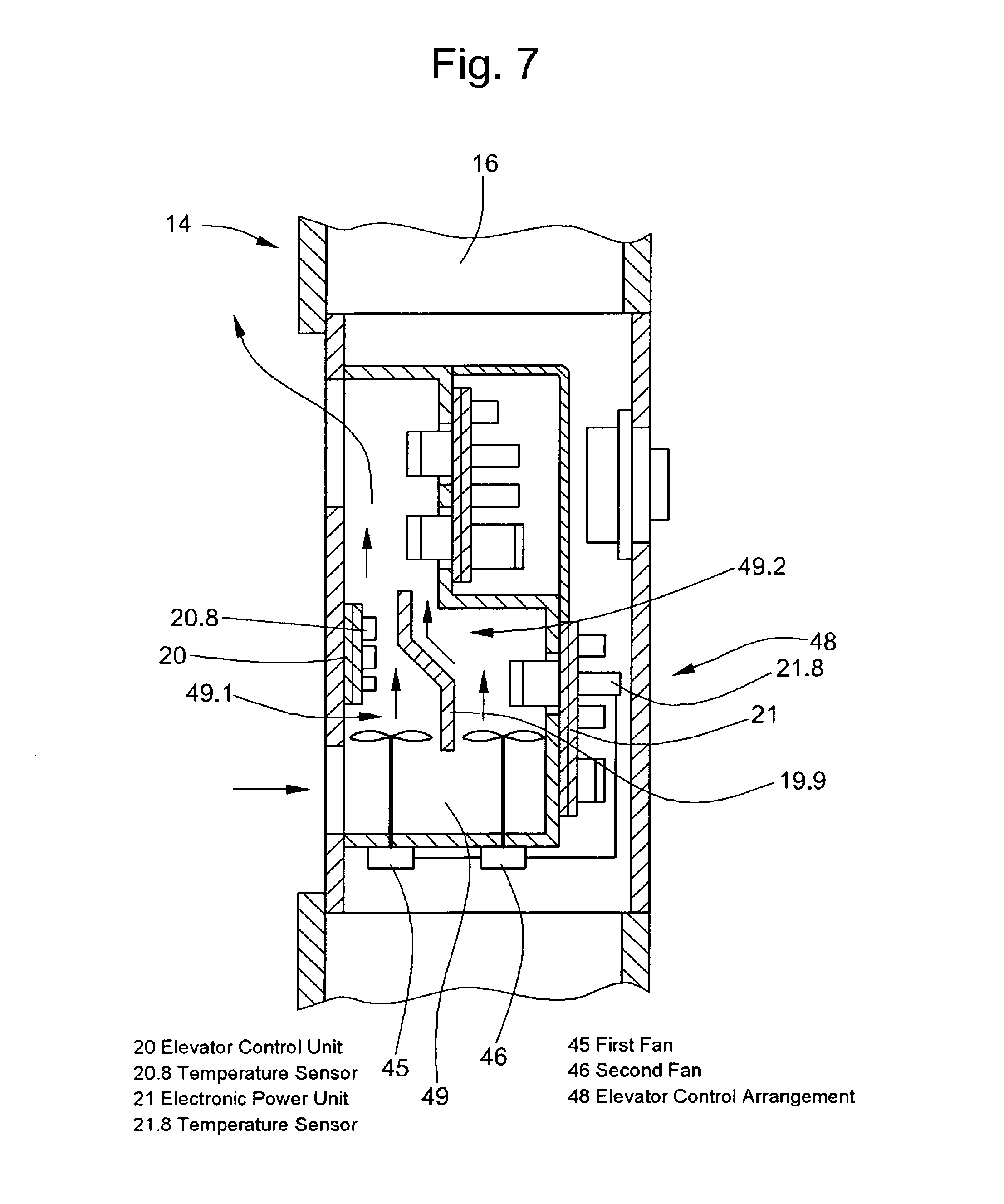 Various means can be employed for dissipation of the waste heat into the elevator shaft 11. For example, through a skillful selection and arrangement of the units 20, 21 the waste heat can be transferred to the main carrier 16.2, which in turn delivers the waste heat to the air in the elevator shaft 11. If the cooling output of the main carrier 16.2 should be insufficient, the main carrier illustrated in An elevator control arrangement 18 incorporated in the chamber 16 of the door frame 14 is illustrated in a first embodiment in Since the main carrier 16.2 and the walls 19.1, 19.2, 19.3 of the cooling air shaft 19 are, for the purpose of shielding the elevator control unit 20 and the electronic power unit 21, made of metal in a given case the circuit boards 20.2, 20.3 thereof have to be arranged at a spacing from the main carrier 16.2 and the walls 19.1, 19.2, 19.3. The gas-tightness can be achieved by means of sealing elements (not illustrated) such as sealing strips, sealing cords, hardenable sealing masses or flat seals. Tightness can, however, also be achieved by further shielding means, for example, a shielding hood 23, such as by way of example covers the elevator control unit 20 in The waste heat is transferred by thermal convection from the cooling bodies 20.1, 21.1 to the air in the cooling shaft 19. The heated air rises in the cooling air shaft 19 towards the outlet opening 16.6 and thereby inducts cool air into the cooling air shaft 19 via the induction opening 16.5. In order that a strong air flow in the cooling air shaft is produced, possibly—as illustrated—the units with the largest output, for example the electronic power unit 21, are arranged in the vicinity of the induction opening 16.5. The use of a fan 25 makes it possible to determine the sequence of units 20, 21 should be cooled first. In the present exemplifying embodiment it is the more temperature sensitive elevator control unit 20. A respective temperature sensor 20.8, 21.8 is arranged in the region of each of the electronic power unit 21 and the elevator control unit 20 in order to monitor the operating temperatures of these units 20, 21. The signals thereof are fed to a regulating device 26, which regulates the rotational speed of the fan motor. Since the door frame 14, the main carrier 16.2 and the walls 19.1, 19.2, 19.3 of the cooling air shaft 19 are made of metal, it is usually necessary for shielding to arrange only one shielding plate 24 between the electronic power unit 21 and the elevator control unit 20 to be as free of any gap as possible. Since no circuit boards with interference sensitive electronic elements are arranged in the cooling air shaft 19, the connecting lines 27, which connect the units 20, 21 together, can be led through the cooling air shaft 19 so that the shielding thereof is effected by the walls 19.1, 19.2, 19.3. A further embodiment of an elevator control arrangement 38 installed in the chamber 16 of the door frame 14 is illustrated in The third difference relates to the arrangement of flow guide plates 34, 35 in the elevator shaft 11. As illustrated, not only the outlet opening 16.6, but also the induction opening 16.5 can be equipped with these. Generally, also only one of the two openings 16.5, 16.6 can have flow guide plates 34, 35. These are arranged to be pivotable and are oriented towards the flow conditions, which prevail in the elevator shaft in the region of the openings 16.5, 16.6 when an elevator cage 39 passes these. The orientation of the flow guide plates 34, 35 has the objective that the air flow, which is indicated by arrows, in the cooling air shaft 19 always has the same flow direction. The flow guide plate 34 of the induction opening 16.5 can be pivoted independently of the flow guide plates 35 of the outlet opening 16.6. In a given case the outlet opening 16.6 and/or the induction opening 16.5 can also be temporarily closed by the flow guide plates 34, 35. Although the disclosed technologies have been described by the illustration of specific exemplifying embodiments, other variants of embodiment can be created with knowledge of the present disclosure, for example in that the features of the individual exemplifying embodiments are combined with one another and/or individual functional units of the exemplifying embodiments are interchanged. For example, flow guide plates can be present in all exemplifying embodiments or the cooling air shafts can have several channels. Correspondingly, in all exemplifying embodiments two or even more fans are usable. The cooling air shaft can obviously also be arranged obliquely or orthogonally to the travel direction of the elevator cage when the space conditions in the door frame permit this. Having illustrated and described the principles of the disclosed technologies, it will be apparent to those skilled in the art that the disclosed embodiments can be modified in arrangement and detail without departing from such principles. In view of the many possible embodiments to which the principles of the disclosed technologies can be applied, it should be recognized that the illustrated embodiments are only examples of the technologies and should not be taken as limiting the scope of the invention. Rather, the scope of the invention is defined by the following claims and their equivalents. We therefore claim as our invention all that comes within the scope and spirit of these claims.CROSS-REFERENCE TO RELATED APPLICATION