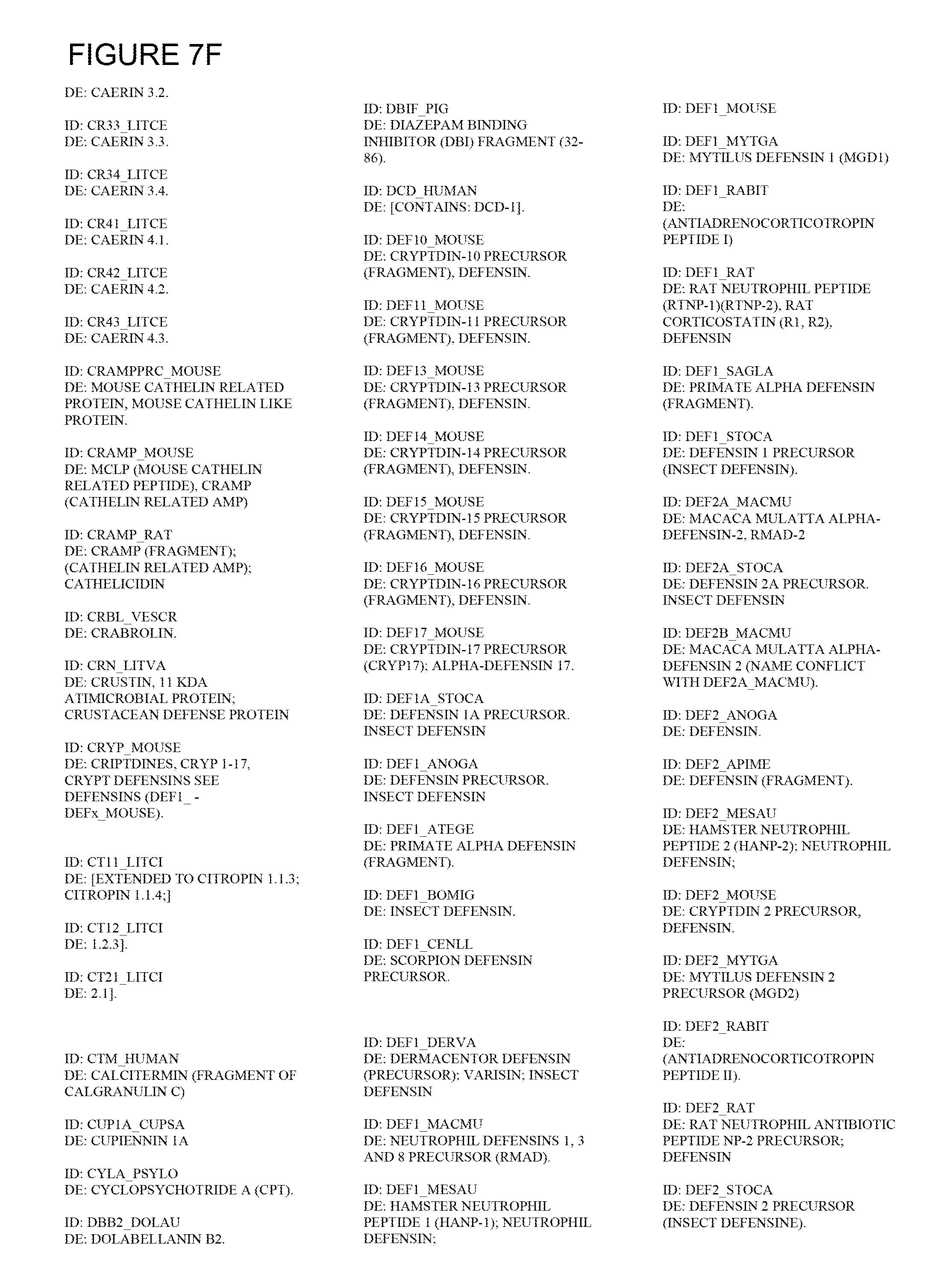 Antimicrobial Peptides SEQ ID NO: Name Organism Sequence 1 lingual antimicrobial mrlhhlllallflvlsagsgftqgvrnsqscrrnkgicvp peptide precursor ircpgsmrqigtclgaqvkccrrk (Magainin) 2 antimicrobial peptide gvlsnvigylkklgtgalnavlkq PGQ 3 Xenopsin mykgiflcvllavicanslatpssdadedndeveryvrgw askigqtlgkiakvglkeliqpkreamlrsaeaqgkrpwi l 4 magainin precursor mfkglficsliavicanalpqpeasadedmderevrgigk flhsagkfgkafvgeimkskrdaeavgpeafadedldere vrgigkflhsakkfgkafvgeimnskrdaeavgpeafade dlderevrgigkflhsakkfgkafvgeimnskrdaeavgp eafadedlderevrgigkflhsakkfgkafvgeimnskrd aeavgpeafadedfderevrgigkflhsakkfgkafvgei mnskrdaeavgpeafadedlderevrgigkflhsakkfgk afvgeimnskrdaeavddrrwve 5 tachyplesin I kwcfrvcyrgicyrrcr 6 tachyplesin II rwcfrvcyrgicyrkcr 7 buforin I msgrgkqggkvrakaktrssraglqfpvgrvhrllrkgny aqrvgagapvylaavleyltaeilelagnaardnkttrii prhlqlavrndeelnkllggvtiaqggvlpniqavllpkt esskpaksk 8 buforin II trssraglqfpvgrvhrllrk 9 cecropin A mnfvrilsfvfalvlalgavsaapeprwklfkkiekvgrn vrdglikagpaiavigqakslgk 10 cecropin B mnfakilsfvfalvlalsmtsaapeprwkifkkiekmgrn irdgivkagpaievlgsakaigk 11 cecropin C mnfykifvfvalilaisigqseagwlkklgkrierigqht rdatiqglgiaqqaanvaatarg 12 cecropin P1 swlsktakklensakkrisegiaiaiqggpr 13 indolicidin ilpwkwpwwpwrr 14 nisin itsislctpgcktgalmgcnmktatchcsihvsk 15 ranalexin flgglikivpamicavtkkc 16 lactoferricin B fkcrrwqwrmkklgapsitcyrraf 17 protegrin-1 rggrlcycrrrfcvcvgrx 18 protegrin-2 ggrlcycrrrfcicvg 19 histatin precursor mkffvfalilalmlsmtgadshakrhhgykrkfhekhhsh rgyrsnylydn 20 histatin 1 dsheerhhgrhghhkygrkfhekhhshrgyrsnylydn 21 dermaseptin alwktmlkklgtmalhagkaalgaaadtisqtq 22 dermaseptin 2 alwftmlkklgtmalhagkaalgaaantisqgtq 23 dermaseptin 3 alwknmlkgigklagkaalgavkklvgaes 24 misgurin rqrveelskfskkgaaarrrk 25 melittin gigavlkvlttglpaliswisrkkrqq 26 pardaxin-1 gffalipkiissplfktllsavgsalsssgeqe 27 pardaxin-2 gffalipkiisspifktllsavgsalsssggqe 28 bactenecin 5 metqraslslgrcslwllllglvlpsasaqalsyreavlr precursor avdqfnersseanlyrlleldptpnddldpgtrkpvsfrv ketdcprtsqqpleqcdfkenglvkqcvgtvtldpsndqf dincnelqsvrfrppirrppirppfyppfrppirppifpp irppfrpplgpfpgrr 29 bactenecin metpraslslgrwslw1111glalpsasaqalsyreavlr precursor avdqlneqssepniyrlleldqppqddedpdspkrvsfrv ketvcsrttqqppeqcdfkengllkrcegtvtldqvrgnf ditcnnhqsiritkqpwappqaarlcrivvirvcr 30 ceratotoxin A sigsalkkalpvakkigkialpiakaalp 31 ceratotoxin B sigsafkkalpvakkigkaalpiakaalp 32 cathelicidin mktqrnghslgrwslvllllglvmplaiiaqvlsykeavl antimicrobial raidginqrssdanlyrlldldprptmdgdpdtpkpvsft peptide vketvcprttqqspedcdfkkdglvkrcmgtvtlnqargs fdiscdkdnkrfallgdffrkskekigkefkrivqrikdf lrnlvprtes 33 myeloid metqrntrclgrwsplllllglvippattqalsykeavlr cathelicidin 3 avdglnqrssdenlyrlleldplpkgdkdsdtpkpvsfmv ketvcprimkqtpeqcdfkenglvkqcvgtvildpvkdyf dascdepqrvkrfhsvgsliqrhqqmirdkseatrhgiri itrpklllas 34 myeloid metqraslslgrwslwllllglalpsasaqalsyreavlr antimicrobial avdqlneksseanlyrlleldpppkeddenpnipkpvsfr peptide BMAP-28 vketvcprtsqqspeqcdfkengllkecvgtvtldqvgsn fditcavpqsvgglrslgrkilrawkkygpiivpiirig 35 myeloid metqrntrclgrwsplllllglvippattqalsykeavlr cathelicidin 1 avdglnqrssdenlyrlleldplpkgdkdsdtpkpvsfmv ketvcprimkqtpeqcdfkenglvkqcvgtvilgpvkdhf dvscgepqrvkrfgrlaksflrmrillprrkillas 36 SMAP 29 metqraslslgrcslwllllglalpsasaqvlsyreavlr aadqlneksseanlyrlleldpppkqddensnipkpvsfr vketvcprtsqqpaeqcdfkengllkecvgtvtldqvrnn fditcaepqsvrglrrlgrkiahgvkkygptvlriiriag 37 BNP-1 rlcrivvirvcr 38 HNP-1 acycripaciagerrygtciyqgrlwafcc 39 HNP-2 cycripaciagerrygtciyqgrlwafcc 40 HNP-3 dcycripaciagerrygtciyqgrlwafcc 41 HNP-4 vcscrlvfcrrtelrvgncliggvsftycctrv 42 NP-1 vvcacrralclprerragfcrirgrihplccrr 43 NP-2 vvcacrralclplerragfcrirgrihplccrr 44 NP-3A gicacrrrfcpnserfsgycrvngaryvrccsrr 45 NP-3B grcvcrkqllcsyrerrigdckirgvrfpfccpr 46 NP-4 vsctcrrfscgfgerasgsctvnggvrhtlccrr 47 NP-5 vfctcrgflcgsgerasgsctingvrhtlccrr 48 RatNP-1 vtcycrrtrcgfrerlsgacgyrgriyrlccr 49 Rat-NP-3 cscrysscrfgerllsgacrlngriyrlcc 50 Rat-NP-4 actcrigacvsgerltgacglngriylccr 51 GPNP Guinea pig rrcicttrtcrfpyrrlgtcifqnrvytfcc 52 beta defensin-3 mrihyllfallflflvpvpghggiintlqkyycrvrggrc avlsclpkeeqigkcstrgrkccrrkk 53 theta defensin-1 rcictrgfcrclcrrgvc 54 defensin CUA1 mkssmkmfaalllvvmcllanemggplvveartcesqshk fkgtclsdtncanvchserfsggkcrgfrrrcfctthc 55 defensin SD2 mkssmkmfaalllvvmcllanemggplvveartcesqshk fkgtclsdtncanvchserfsggkcrgfrrrcfctthc 56 neutrophil acycripaclagerrygtcfymgrvwafcc defensin 2 57 4 KDA defensin gfgcpfnqgachrhcrsirrrggycaglfkqtctcyr 58 defensin gfgcpnnyqchrhcksipgrcggycggxhrlrctcyrc 59 defensin AMP1 dgvklcdvpsgtwsghcgssskcsqqckdrehfayggach yqfpsvkcfckrqc 60 defensin AMP1 nlcerasltwtgncgntghcdtqcrnwesakhgachkrgn wkcfcyfnc 61 cysteine-rich mkklvllfalvllafqvqadsiqntdeetkteeqpgekdq cryptdin-1 avsvsfgdpqgsalqdaalgwgrrcpqcprcpscpscprc homolog prcprckcnpk 62 beta-defensin-9 qgvrnfvtcrinrgfcvpircpghrrqigtclgpqikccr 63 beta-defensin-7 qgvrnfvtcrinrgfcvpircpghrrqigtclgprikccr 64 beta-defensin-6 qgvrnhvtcriyggfcvpircpgrtrqigtcfgrpvkccr rw 65 beta-defensin-5 qvvrnpqscrwnmgvcipiscpgnmrqigtcfgprvpccr 66 beta-defensin-4 qrvrnpqscrwnmgvcipflcrvgmrqigtcfgprvpccr 67 beta-defensin-3 qgvrnhvtcrinrgfcvpircpgrtrqigtcfgprikccr sw 68 beta-defensin-10 qgvrsylscwgnrgicllnrcpgrmrqigtclaprvkccr 69 beta-defensin-13 sgisgplscgrnggvcipircpvpmrqigtcfgrpvkccr sw 70 beta-defensin-1 dfaschtnggiclpnrcpghmiqigicfrprvkccrsw 71 coleoptericin slqggapnfpqpsqqnggwqvspdlgrddkgntrgqieiq nkgkdhdfnagwgkvirgpnkakptwhvggtyrr 72 beta defensin-3 mrihyllfallflflvpvpghggiintlqkyycrvrggrc avlsclpkeeqigkcstrgrkccrrkk 73 defensin C atcdllsgfgvgdsacaahciargnrggycnskkvcvcrn 74 defensin B gfgcpndypchrhcksipgryggycggxhrlrctc 75 sapecin C atcdllsgigvqhsacalhcvfrgnrggyctgkgicvcrn 76 macrophage mrtlallaaillvalqaqaehvsvsidevvdqqppqaedq antibiotic dvaiyvkehessalealgvkagvvcacrralclprerrag peptide MCP-1 fcrirgrihplccrr 77 cryptdin-2 mkplvllsalvllsfqvqadpiqntdeetkteeqsgeedq avsvsfgdregaslqeeslrdlvcycrtrgckrrermngt crkghlmytlcc 78 cryptdin-5 mktfvllsalvllafqvqadpihktdeetnteeqpgeedq avsisfggqegsalheelskklicycrirgckrrervfgt crnlfltfvfccs 79 cryptdin 12 lrdlvcycrargckgrermngtcrkghllymlccr 80 defensin