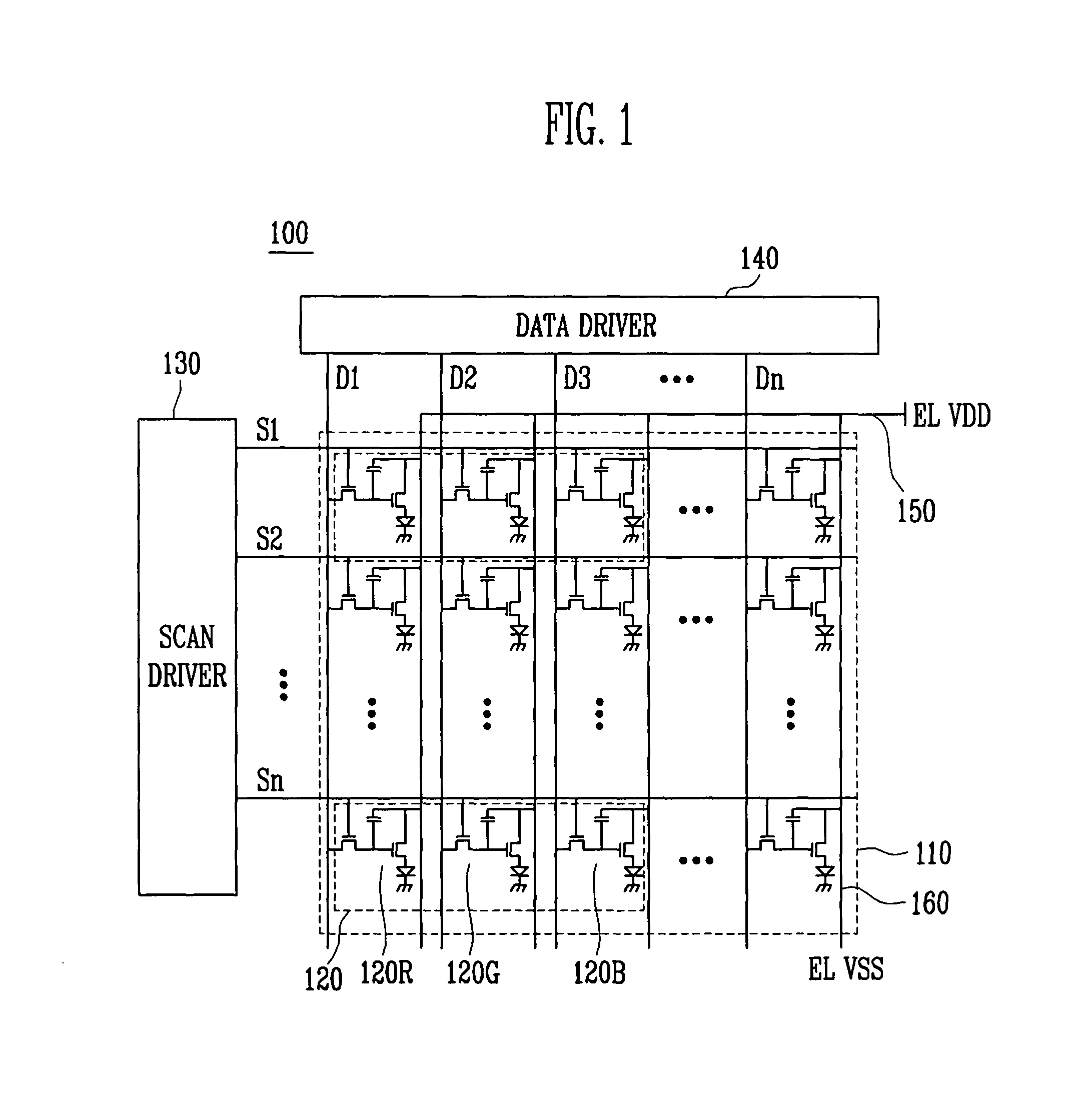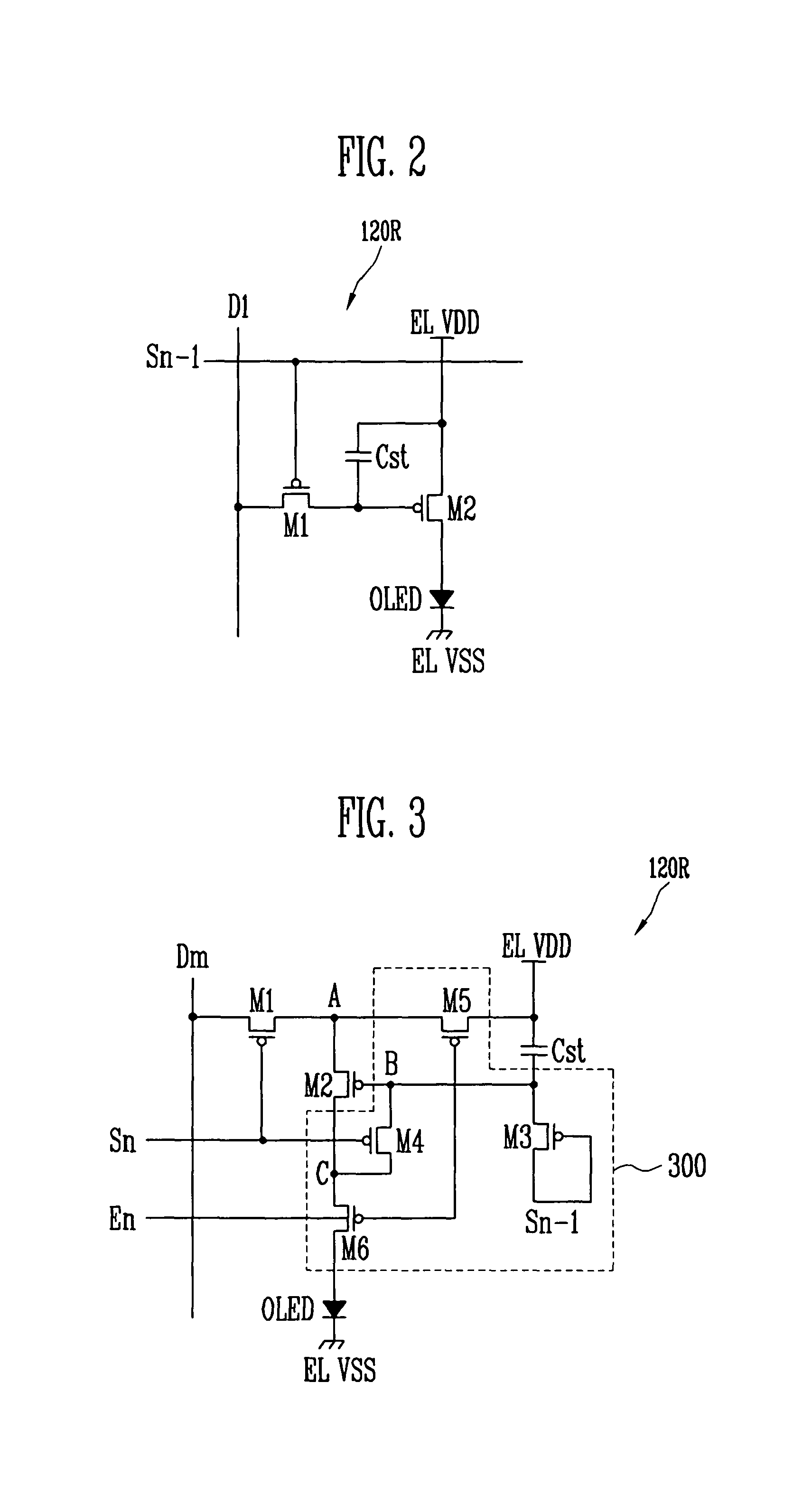 a first Thin Film Transistor (TFT) adapted to respond to the selected signal and to transmit the data signal to an organic light emitting diode; a capacitor electrically connected to the first TFT and adapted to store a voltage corresponding to the transmitted data signal; a second Thin Film Transistor (TFT) connected to the capacitor and adapted to supply the organic light emitting diode with a current corresponding to the data signal selected by the selected signal;