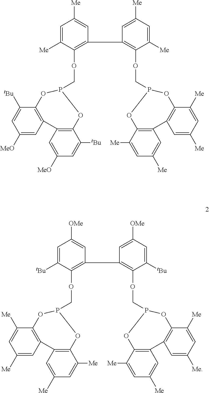 The product was characterized by NMR spectroscopy (Bruker Avance 500 MHz FT-NMR spectrometer). Chemical shifts (6) are reported in ppm. The31P NMR signals were referenced according to: SR31P=SR1H*(BF31P/BF1H)=SR1H*0.4048. (Robin K. Harris, Edwin D. Becker, Sonia M. Cabral de Menezes, Robin Goodfellow, and Pierre Granger, Pure Appl. Chem., 2001, 73, 1795-1818; Robin K. Harris, Edwin D. Becker, Sonia M. Cabral de Menezes, Pierre Granger, Roy E. Hoffman and Kurt W. Zilm, Pure Appl. Chem., 2008, 80, 59-84). By means of31P NMR, the ratio of the two ligands (ligand (1) and ligand (2)) to one another was determined. The unsymmetric ligand (1) is characterized by two phosphorus signals in the range from (δ)=140.6 ppm to (δ)=142.8 ppm, whereas the symmetric ligand (2) has only one phosphorus signal in the range from (δ)=139.1 ppm to (δ)=139.8 ppm.