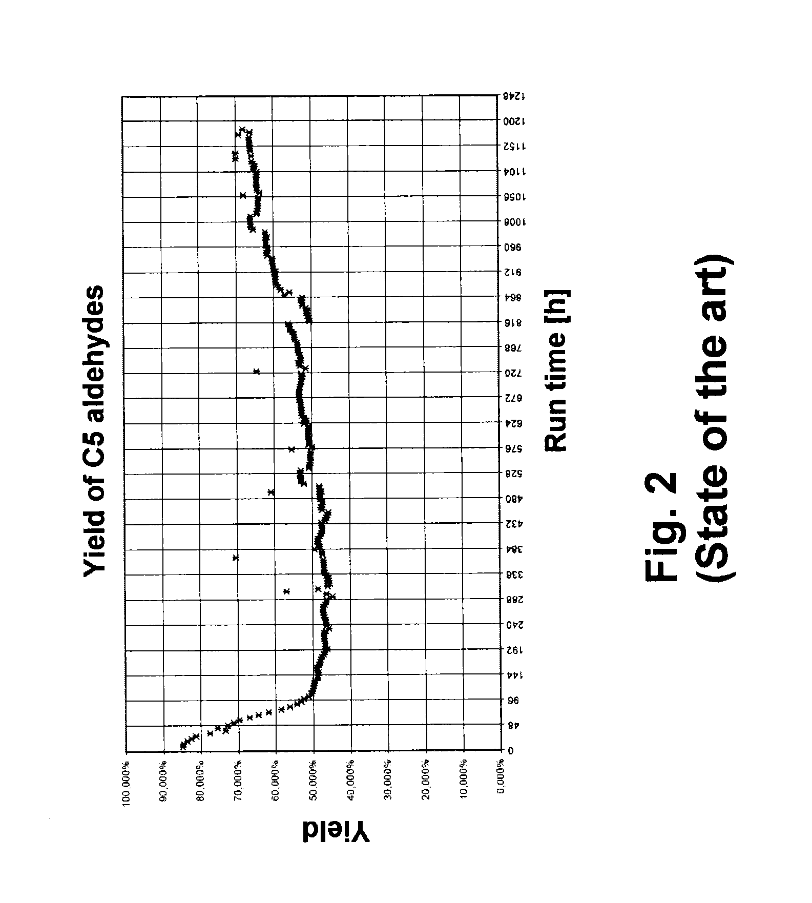 Under the selected reaction conditions, an aldehyde yield between 80% and 90% was established at the start of the reaction. After an operating time of 8000 h, the yield fell to about 65%, caused by the rhodium losses resulting from the sampling. In this case, no foaming of the reaction solution was detectable. The percentage distribution between n-pentanal and 2-methylbutanal, i.e. the regioselectivity, was 92% to 8%.