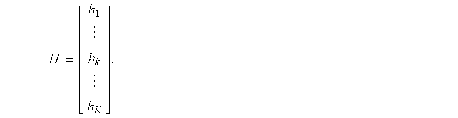 where 0K×1is the vector with all zero entries and H is the channel matrix obtained by combining the channel vectors (hkεC1×M) from the M transmit antennas to the K users as