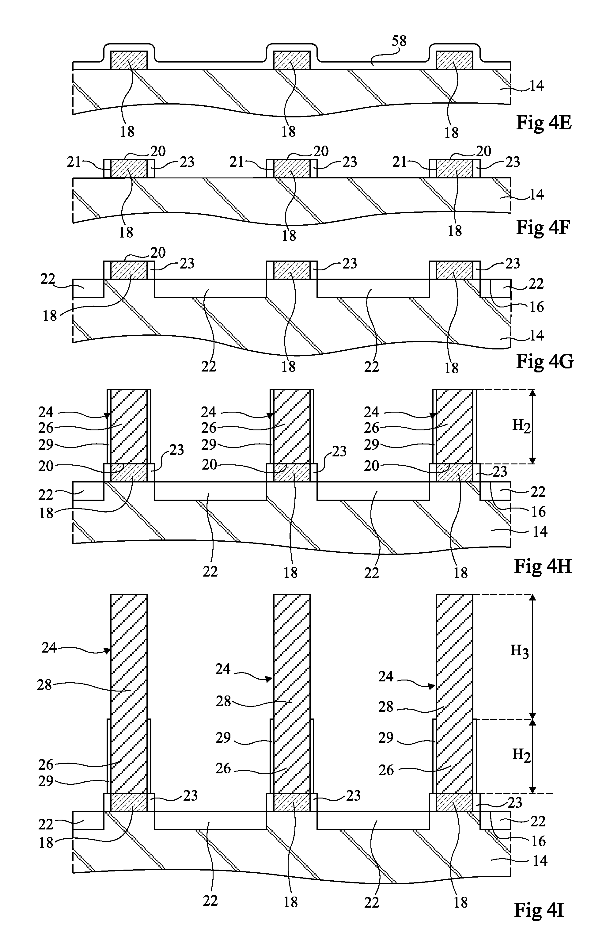 Dielectric region 22 and dielectric portions 23 may be formed in a high-temperature furnace. The oxidation step may be carried out with oxygen or with water vapor. As an example, the oxidation temperature varies from 750 to 1,100° C. for oxidation periods varying from a few minutes to one hour. During the step of forming region 22 and portions 23, portions 52 protect top 20 of each island 18 against the oxidation treatment. Region 22 may partly extend under islands 18. The oxidation conditions are selected so that substrate 14 however remains in electric contact with each island 18. Further, an overthickness may appear at the level of region 22.