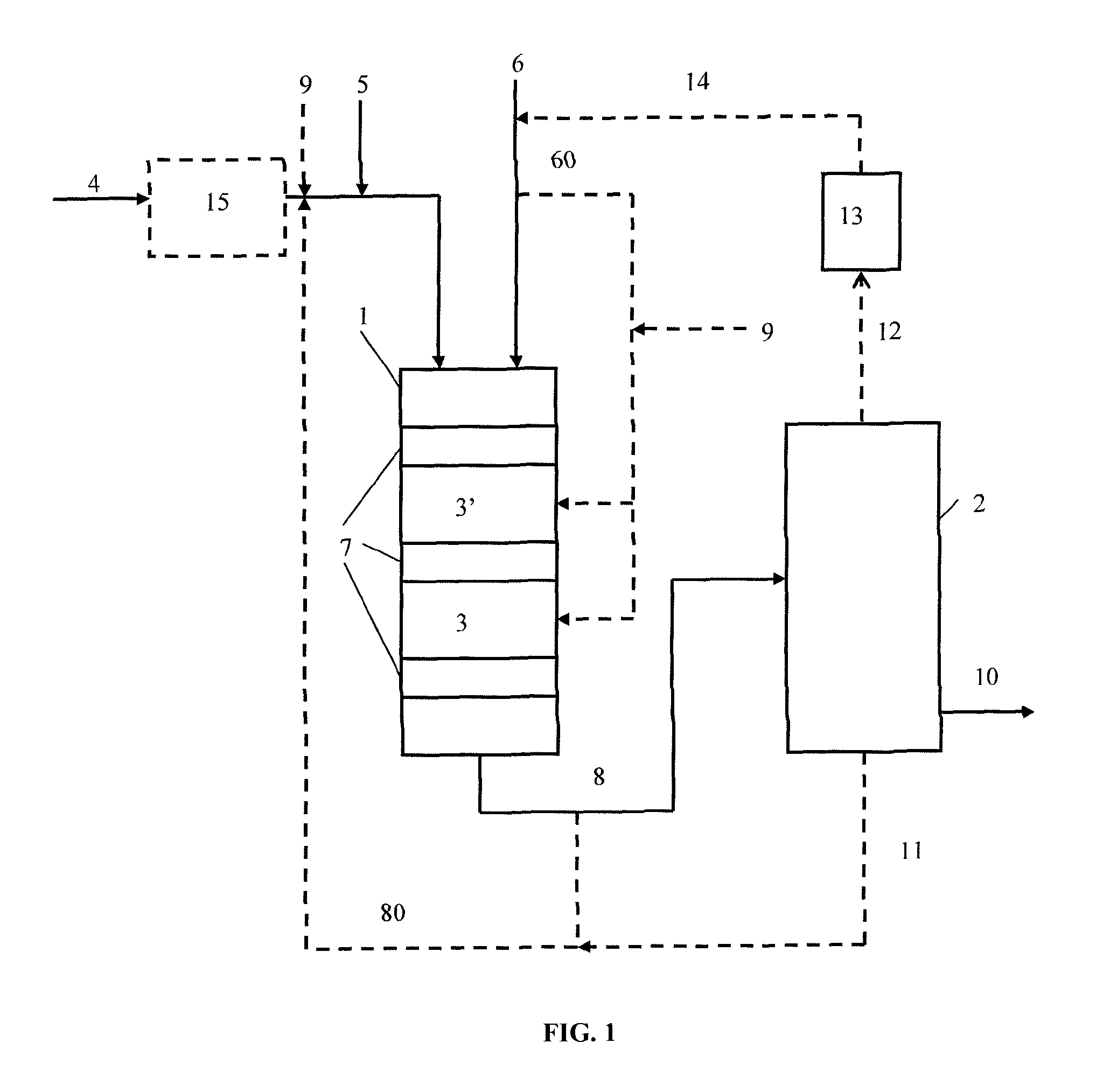 With reference to If desired, a purification section 15 can be arranged in connection with hydroprocessing reactor 1 for purification of CTO prior to its supply to reactor 1, as shown by the dotted line in Hydrogen is supplied via conduit 6 to reactor 1. Conduit 6 is arranged to reactor 1 at an initial end of the reactor. Hydrogen can also be fed to the reactor at one or several positions close to the one or both catalyst layers 3, 3′, as shown by the dotted line 60. A first catalyst layer 3′ and a second catalyst layer 3 are packed in the reactor. The first catalyst layer 3′ is arranged upstream of the second catalyst layer 3. The HDO catalyst is packed in the first catalyst layer 3′, and HI catalyst is packed in the second catalyst layer 3. Hydroprocessing treatment and isomerisation of the feedstock are accomplished in reactor 1. As a main rule, catalytic hydrodeoxygenation and hydrodesulphurization reactions, saturation of olefinic bonds and ring opening of the terpene and tall oil compounds in the feedstock take place in the catalyst layer 3. Isomerisation reactions and cracking of hydrocarbons take place pre-dominantly in the catalyst layer 3′. Guard beds 7 comprising suitable material, such as Al2O3, SiC or glass beads can be arranged in reactor 1. Their task is to act as guard beds against harmful substances in the feed. In Temperatures of the catalyst layers 3′ and 3 are typically about 340° C. and 380° C., respectively. Reactor 1 is operated at a pressure of 50 bar, for example. The two catalyst layers can be diluted with an appropriate medium. The diluting material can be for example material used in the guard beds described above, or another catalyst suitable for hydrogenation. Dilution of the catalysts helps in controlling the exothermic balance of the reaction. In an embodiment, the first catalyst layer 3′ comprises diluted HDO catalyst material, and the second catalyst layer 3 comprises undiluted HI catalyst material. In an embodiment of the invention, one of the catalyst layers 3 and 3′ is omitted and the HDO catalyst and the HI catalyst are mixed together and packed in one layer in reactor 1. Supplementary sulphur can be supplied to reactor 1 via sulphur feed conduit 9. Conduit 9 can be joined to feedstock inlet conduit 4 and/or hydrogen inlet conduit 60. CTO and CST, i.e. the feedstock, are pumped to reactor 1 at a desired speed. Feed rates WHSV (weight hourly spatial velocity) of the two raw materials are proportional to an amount of the catalyst: WHSV is calculated according to the following equation: wherein Vfeed[g/h] means a pumping velocity of the feedstock, and mcatalyst[g] means an amount of the catalyst. WHSV of the feedstock is typically about 0.6. The relation H2feed/feedstock is typically in the range of 1 200 to 1 400 Nl/l. The product stream including a mixture of hydrocarbon components from reactor 1 is recovered via product outlet conduit 8. At least a portion of the product stream can be circulated back to the reactor 1 through product recirculation conduit 80 as shown by the dotted line. In the recirculation, the product can be combined with the feedstock inlet conduit 4 into a single feed flow and supplied to reactor 1. At least a portion of the product stream recovered via product outlet conduit 8 is further supplied to a separator 2 where one or several hydrocarbon fractions are separated. The separator is appropriately a distillation apparatus in which the hydrocarbon fractions are separated based on differences in boiling points. The various hydrocarbon fractions are recovered from the separator via fuel outlet conduit 10. The mixture of hydrocarbon components supplied to the separator also includes a heavy fraction composing mainly of C21to C100+ hydrocarbons having a boiling point of above about 370° C., such as sterolic components and polymers. The heavy fraction is discarded from the separator via conduit 11 and circulated back to hydroprocessing reactor 1. Conduit 11 can be joined to product recirculation conduit 80 as shown in Light gaseous compounds including H2formed in the hydroprocessing treatment can be led via conduit 12 to a hydrogen separator 13. Hydrogen is recovered and circulated via hydrogen circulation conduit 14 back to hydrogen inlet conduit 6. Crude tall oil is fed to the first reactor 1′ via feedstock inlet conduit 4. Conduit 5 for supplying crude sulphate turpentine to the reactor is combined with the feedstock inlet conduit 4 to provide a single unidirectional feedstock flow. A purification section 15 can be arranged in the similar manner as in WHSV of the feedstock to reactor 1′ is typically in the range of about 0.6 to about 1.2, for example about 1. Reactor 1′ is typically operated at a temperature of about 360° C. and under a pressure of about 50 bar. The relation H2feed/feedstock is typically <500 Nl/l. The product obtained from the first reactor 1′ is recovered via pipe 8′ and supplied to the second reactor 1 for isomerisation and cracking. The product stream including a mixture of hydrocarbon components is recovered via product outlet pipe 8 from the second reactor 1. H2feed is supplied to both reactors 1′ and 1 via hydrogen inlet conduit 6. Conduit 6 can enter reactors 1, 1′ at an initial end of the reactors where the feeds via conduits 4 and 8′ enter the reactors. Hydrogen can also be fed to a position of one or both of the catalyst layers in the reactor as shown by the dotted line 60. WHSV of the feedstock to reactor 1 is typically in the range of about 0.75 to about 0.8. Reactor 1 is typically operated at a temperature gradient 410/380/360° C. and under a pressure of about 90 bar. The relation H2feed/feedstock is typically about 735 Nl/l. The product stream including a mixture of hydrocarbon components from reactor 1 is recovered via product outlet conduit 8. At least a portion of the product stream can be circulated back to hydroprocessing reactor 1′ through product recirc