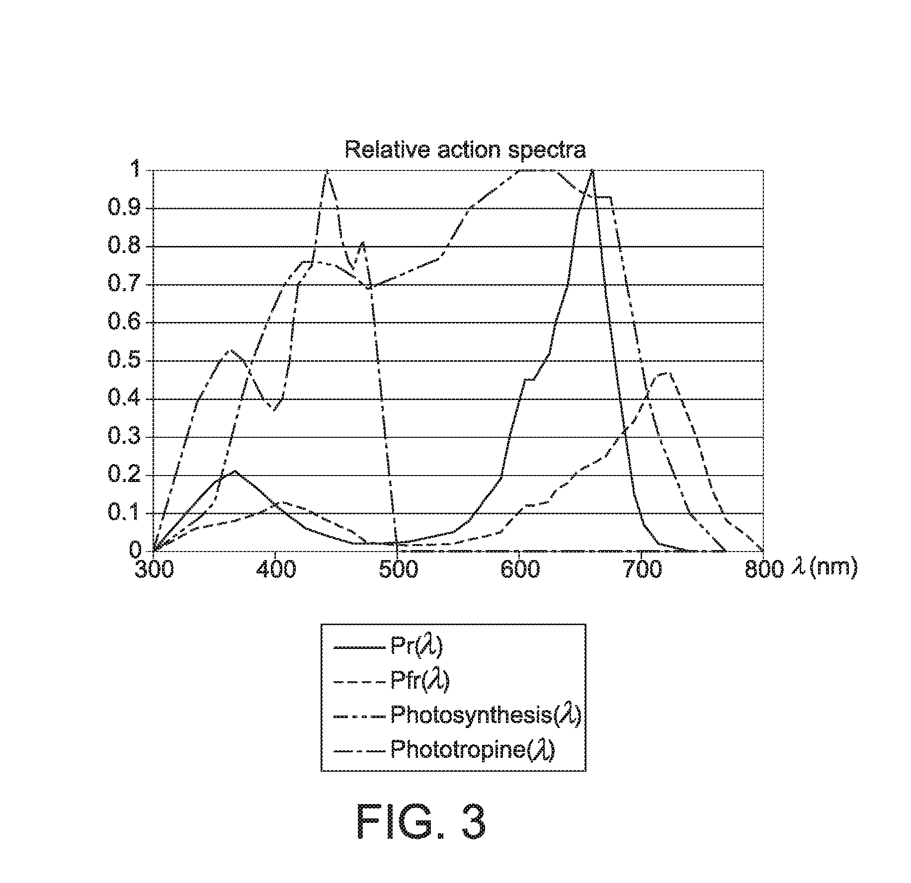 In order to use these values, the action spectra explained above are first normalized. In FIG. 3, the normalized action spectra are plotted. Each action spectrum is in fact normalized such that its maximum value is 1. For the Pfr(λ) action spectrum, the normalization of the Pr(λ) action spectrum is used as these action spectra in practice are interrelated. The values W, X, Y, Z are then normalized into a 4-dimensional normalized space: