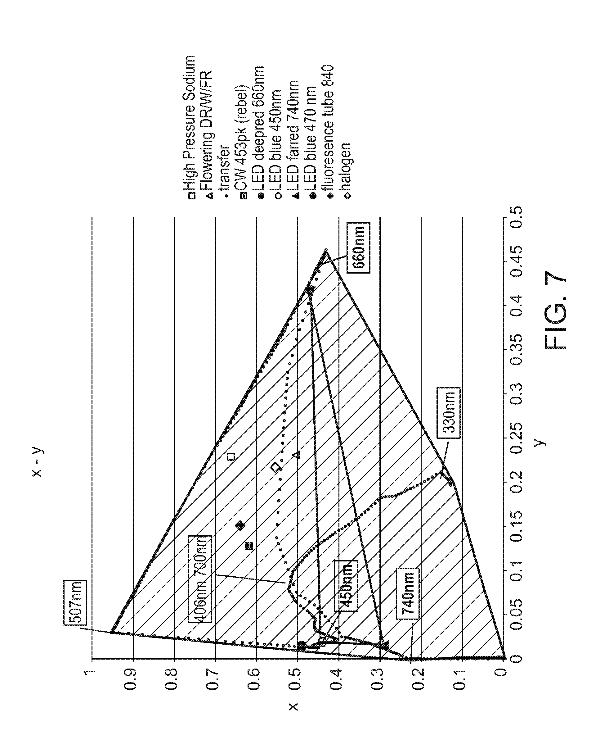 In this example, consider lighting devices that are indicated “LED deepred 660 nm”, “LED farred 740 nm” and “LED blue 450 nm” in FIGS. 7-9. These lighting devices are in fact nearly monochromatic sources. Lines now connect these different lighting devices. These lines in fact bound a triangle in the (x,y) plane. Using these three lighting devices, all the points in this triangle, including the lines, can be realized. In fact, the definition of the horticulture action space is such that the position in and on the triangle corresponds to absolute ratios of the lighting devices. Thus, for instance the position halfway the line connecting “LED blue 450 nm” and “LED deepred 660 nm” correspond with using these lighting devices in a 1:1 ratio, relative to their absolute output in.
