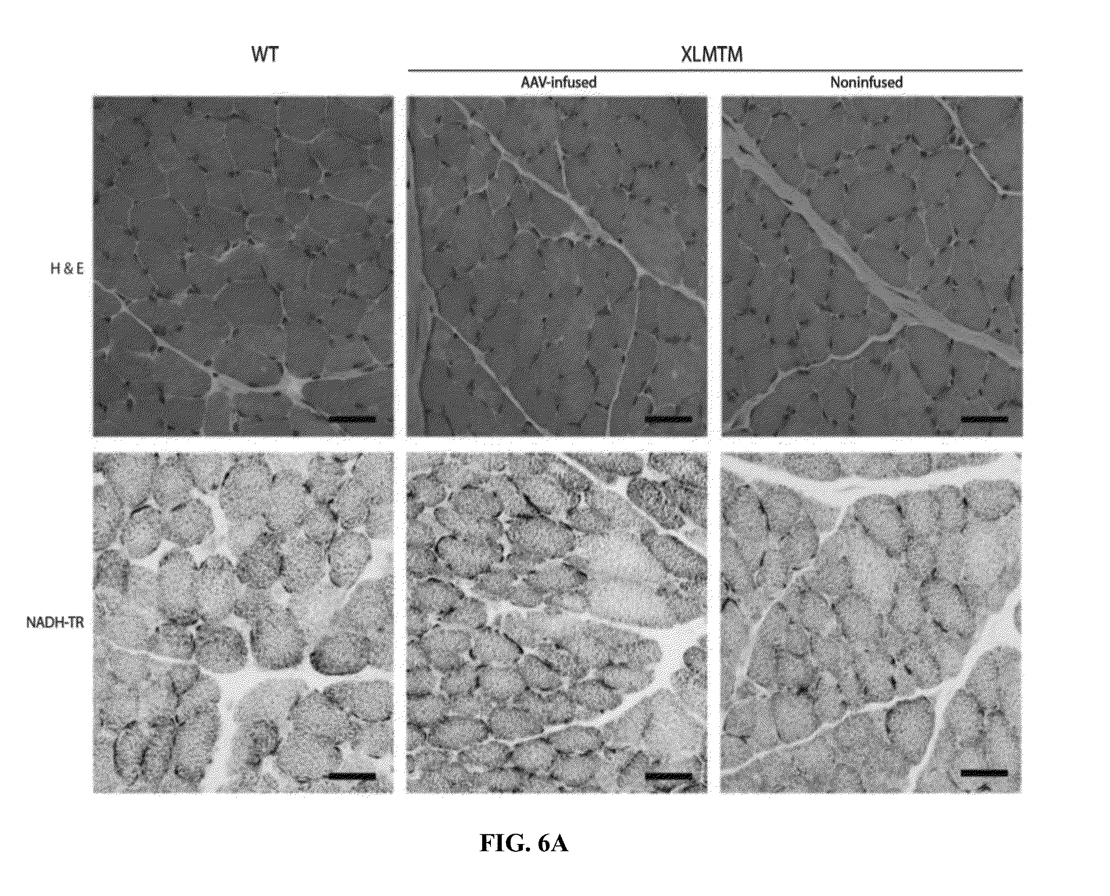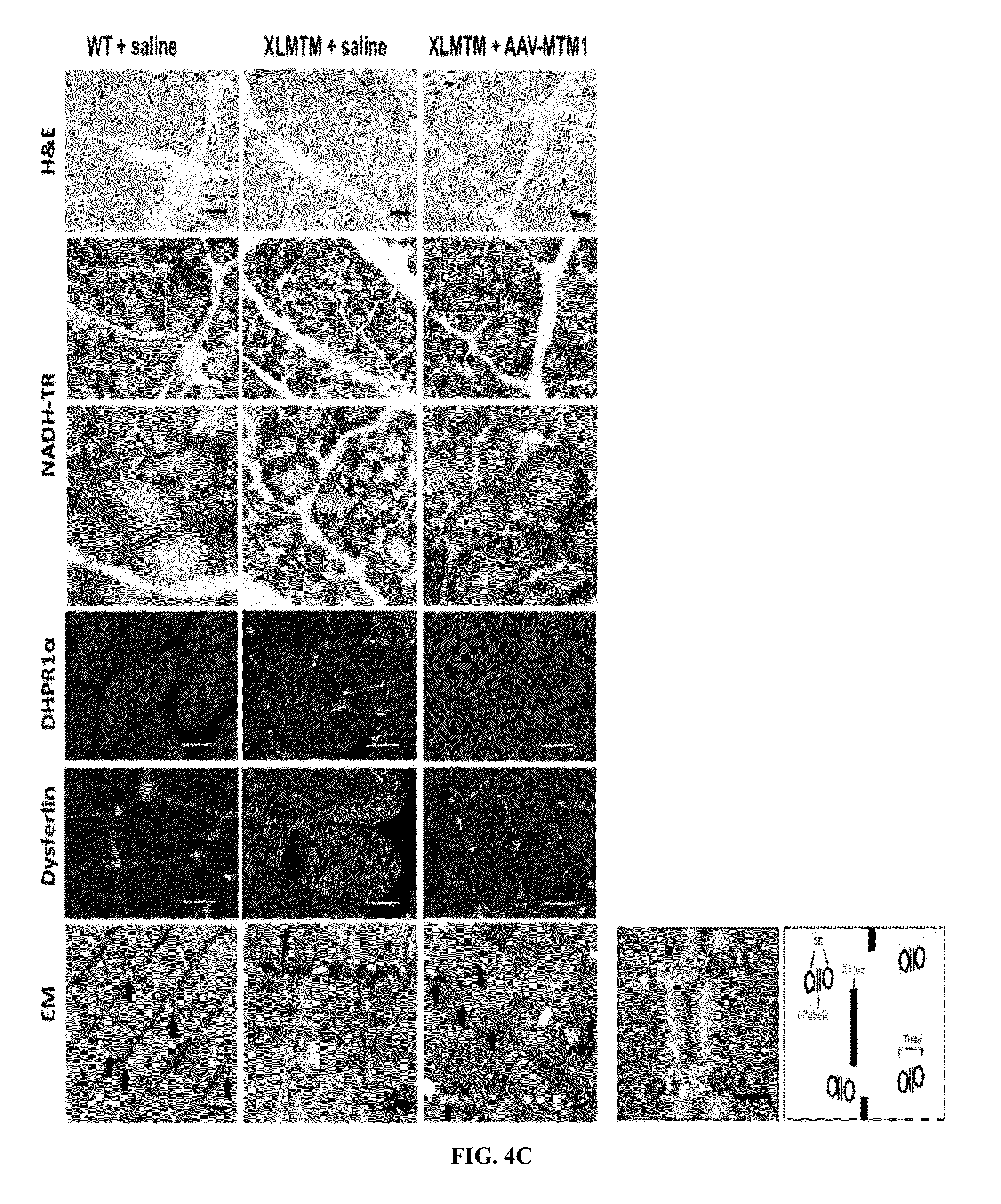 Quantified Histological Findings in Dogs Following Intramuscular Injection XLMTM + XLMTM + WT + saline saline AAV p Value Histological Findings Mean MinFeret 32.0 ± 8.0 17.3 ± 4.1 30.2 ± 3.7 0.06 Fiber Diameter (μm) % Fibers with Central 0 7.5 ± 5.1 5.4 ± 4.0 0.42 Nuclei % Fibers with Central 0 17.1 ± 4.0 4.3 ± 6.6 0.14 Organelle Aggregates % Necklace Fibers 0 3.19 ± 16.8 4 ± 6.7 0.17 Ultrastructural Findings T Tubules/Fiber 10.6 ± 1.5 3.9 ± 2.0 10.2 ± 3.0 0.04 L Tubules/Fiber 0.18 ± 0.01 1.56 ± 0.20 0.18 ± 0.25 0.15 Quantified Histological Findings in Dogs after Intravenous AAV. Mean MinFeret % Fibers with Fiber Diameter % Fibers with Mislocalized (μm) Internal Nuclei Organelles Control (WT) Animals Dog C1 31.0 (8.7-54.9) 0 0 Dog C2 31.1 (4.9-68.8) 0.5 0 Dog C3 26.2 (6.2-44.9) 0.2 0 Experimental Animals Dog 4 Infused Leg 24.8 (3.6-65.0) 1.7 5.6 Non-infused Leg 32.7 (6.0-65.8) 6.3 34.1 Dog 5 Infused Leg 26.2 (5.5-61.4) 0.6 0 Non-infused Leg 37.7 (6.3-73.8) 0.8 0 Dog 6 Infused Leg 22.7 (2.9-53.1) 0.9 0 Non-infused Leg 21.7 (3.1-71.2) 2.0 0 Quantified Histological Findings in Autopsy Tissue at 1 year after infusion. Mean % Fibers % Fibers MinFeret with with Fiber Diameter Internal Mislocalized Muscle (μm) Nuclei Organelles Dog 4 Infused Craniotibialis 38.7 (6.2-97.8) 1.3 0.3 Non-infused Crantiotibialis 30.8 (4.7-137) 9.2 17.3 Infused Vastus Lateralis 30.0 (3.2-96.1) 7.3 11.3 Non-infused Vastus Lateralis 54.1 (4.7-147.1) 4.0 3.3
