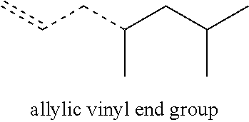 (b) from about 0.1 mol % to 80 mol % (e.g., from about 5 mol % to 70 mol %, from about 10 mol % to about 65 mol %, from about 15 mol % to about 55 mol %, from about 25 mol % to about 50 mol %, or from about 30 mol % to about 80 mol %) of propylene; wherein the vinyl terminated macromonomer has at least 40% allyl chain ends (e.g., at least 50% allyl chain ends, at least 60% allyl chain ends, at least 70% allyl chain ends, or at least 80% allyl chain ends, at least 90% allyl chain ends, at least 95% allyl chain ends) relative to total unsaturation; and, optionally, an isobutyl chain end to allyl chain end ratio of less than 0.70:1, less than 0.65:1, less than 0.60:1, less than 0.50:1, or less than 0.25:1; and further optionally, an allyl chain end to vinylidene chain end ratio of greater than 2:1 (e.g., greater than 2.5:1, greater than 3:1, greater than 5:1, or greater than 10:1); and even further optionally, an allyl chain end to vinylene ratio is greater than 1:1 (e.g., greater than 2:1 or greater than 5:1). Such macromonomers are further described in U.S. patent application Ser. No. 13/072,249, now U.S. Pat. No. 8,399,724, hereby incorporated by reference.