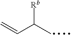 ” represents the polyolefin chain and Rb is a C1 to C38 alkyl group, or a C1 to C20 alkyl group, such as methyl, ethyl, propyl, butyl, pentyl, hexyl, heptyl, octyl, nonyl, decyl, undecyl, dodecyl, and the like. The amount of 3-alkyl chain ends is determined using 13C NMR as set out below.