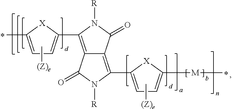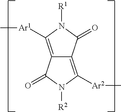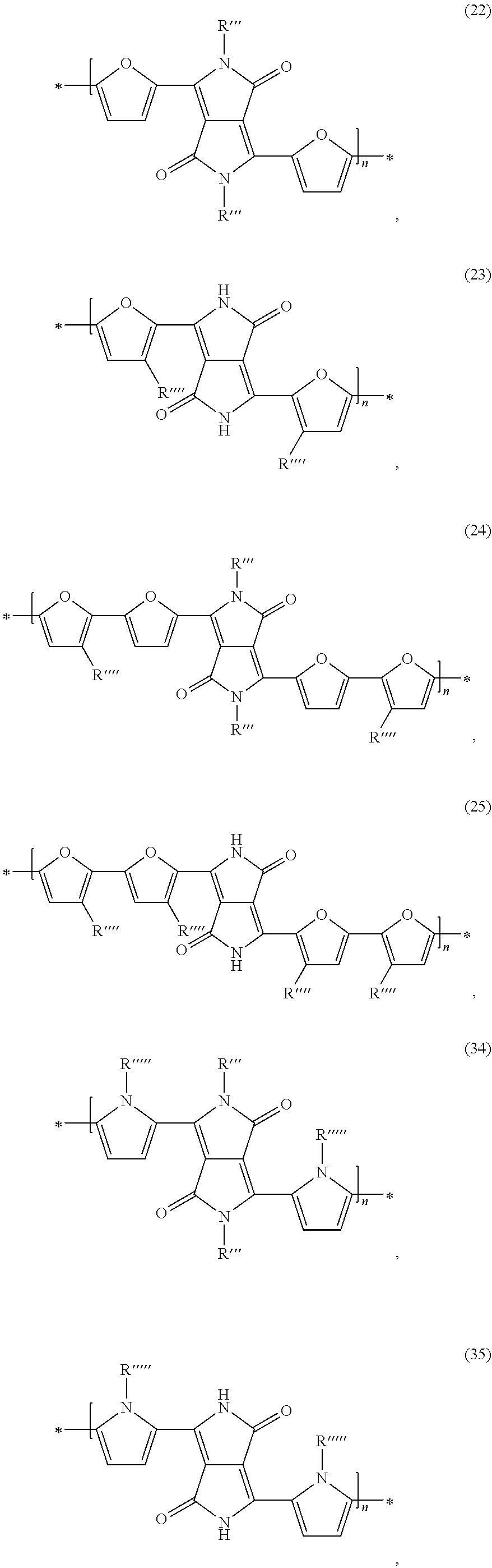 applying a solution and/or dispersion of a polymer in an organic solvent to a suitable substrate and removing the solvent, wherein the polymer comprises one or more (repeating) unit(s) of the formula * x=0.995 to 0.005, y=0.005 to 0.995, and wherein x+y=1. r=0.985 to 0.005, s=0.005 to 0.985, t=0.985 to 0.005, u=0.005 to 0.985, and wherein r+s+t+u=1. A is a group of formula wherein a′ is an integer of 1, or 2, b is an integer of 1, or 2, c is 0, or an integer of 1, or 2, d is 0, or an integer of 1, or 2, e is 0, or an integer of 1, or 2, f is 0, or an integer of 1, or 2, R1and R2are the same or different and are selected from hydrogen, a C1-C100alkyl group, —COOR203, a C1-C100alkyl group which is substituted by one or more halogen atoms, hydroxyl groups, nitro groups, —CN, or C6-C18aryl groups and/or interrupted by —O—, —COO—, —OCO—, or —S—; a C7-C100arylalkyl group, a carbamoyl group, a C5-C12cycloalkyl group, which is substituted one to three times with C1-C8alkyl and/or C1-C8alkoxy, a C6-C24aryl group, which is substituted one to three times with C1-C8alkyl, C1-C8thioalkoxy, and/or C1-C8alkoxy, or pentafluorophenyl, R203is C1-C50alkyl; Ar1and Ar1′ are independently of each other Ar2, Ar2′, Ar3are independently of each other or have the meaning of Ar1, wherein one of X3and X4is N and the other CR99, R99, R104and R104′ are independently of each other hydrogen, halogen, or a C1-C25alkyl group, which is optionally interrupted by one or more oxygen or sulphur atoms, C7-C25arylalkyl, or a C1-C25alkoxy group, R105, R105′, R106and R106′ are independently of each other hydrogen, halogen, C1-C25alkyl, which is optionally interrupted by one or more oxygen or sulphur atoms; C7-C25arylalkyl, or C1-C18alkoxy, R107is C7-C25arylalkyl, C6-C18aryl; C6-C18aryl which is substituted by C1-C18alkyl, C1-C18perfluoroalkyl, or C1-C18alkoxy; C1-C25alkyl; C1-C25alkyl which is interrupted by —O—, or —S—; or —COOR119; R116is hydrogen, C7-C25arylalkyl, C6-C18aryl; C6-C18aryl which is substituted by C1-C18alkyl, C1-C18perfluoroalkyl, or C1-C18alkoxy; C1-C25alkyl; C1-C25alkyl which is interrupted by —O—, or —S—; or —COOR119; R119is C1-C25alkyl, C1-C25alkyl which is substituted by E′ and/or interrupted by D′, C7-C25arylalkyl, C6-C24aryl, C6-C24aryl which is substituted by G, or C7-C25aralkyl, R108and R109are independently of each other H, C1-C25alkyl, C1-C25alkyl which is substituted by E′ and/or interrupted by D′, C7-C25arylalkyl, C6-C24aryl, C6-C24aryl which is substituted by G, C2-C20heteroaryl, C2-C20heteroaryl which is substituted by G, C18alkenyl, C2-C18alkynyl, C1-C18alkoxy, C1-C18alkoxy which is substituted by E′ and/or interrupted by D′, or C7-C25aralkyl, or R108and R109together form a group of formula ═CR110R111, wherein R110and R111are independently of each other H, C1-C18alkyl, C1-C18alkyl which is substituted by E′ and/or interrupted by D′, C6-C24aryl, C6-C24aryl which is substituted by G, or C2-C20heteroaryl, or C2-C20heteroaryl which is substituted by G, or R108and R109together form a five or six membered ring, which optionally is substituted by C1-C18alkyl, C1-C18alkyl which is substituted by E′ and/or interrupted by D′, C6-C24aryl, C6-C24aryl which is substituted by G, C2-C20heteroaryl, C2-C20heteroaryl which is substituted by G, C2-C18alkenyl, C2-C18alkynyl, C1-C18alkoxy, C1-C18alkoxy which is substituted by E′ and/or interrupted by D′, or C7-C25aralkyl, D′ is —CO—, —COO—, —S—, —O—, or —NR112—, E′ is C1-C8thioalkoxy, C1-C8alkoxy, CN, —NR112R113, —CONR112R113, or halogen, G is E′, or C1-C18alkyl, and R112and R113are independently of each other H; C6-C18aryl; C6-C18aryl which is substituted by C1-C18alkyl, or C1-C18alkoxy; C1-C18alkyl; or C1-C18alkyl which is interrupted by —O—, B, D and E are independently of each other a group of the formulas shown below, with the proviso that at least one of (i) D in [A-D], (ii) D in [B-D], (iii) B in [B-D], (iv) E in [A-E], (v) B in [B-E], and (vi) E in [B-E] has the structure or formula IV, with the proviso that in case B, D and E are a group of formula IV, they are different from A, wherein k is 1, l is 0, or 1, r is 0, or 1, z is 0, or 1, a is an integer of 1, or 5, g is an integer of 1, or 2, h is an integer of 1, or 2, i is 0, or an integer of 1, or 2, j is 0, or an integer of 1, or 2, k is 0, or an integer of 1, or 2, l is 0, or an integer of 1, or 2, R1′ and R2′ have independently of each other the meaning of R1, Ar8, Ar8′, Ar9, Ar9′, Ar10and Ar10′ have independently of each other the meaning of Ar2, Ar4, Ar5, Ar6and Ar7are independently of each other a group of formula wherein one of X5and X6is N and the other is CR14, Ar20is an arylene group, or a heteroarylene group, each of which is optionally substituted, R118has the meaning of R116, R12and R12′ are independently of each other hydrogen, halogen, C1-C25alkyl, which is optionally interrupted by one, or more oxygen, or sulphur atoms, C1-C25alkoxy, C7-C-25arylalkyl, or R13is a C1-C10alkyl group, or a tri(C1-C8alkyl)silyl group, R14, R14′, R15, R15′, R17and R17′ are independently of each other H, or a C1-C25alkyl group, which is optionally interrupted by one or more oxygen atoms; R18and R18′independently of each other hydrogen, halogen, C1-C25alkyl, which is optionally interrupted by one or more oxygen or sulphur atoms, C7-C25aralkyl, or C1-C25alkoxy, R19is hydrogen, C7-C25aralkyl, C6-C18aryl; C6-C18aryl which is substituted by C1-C18alkyl, or C1-C18alkoxy; or C1-C25alkyl, which is optionally interrupted by one or more oxygen or sulphur atoms; and R20and R20′ are independently of each other hydrogen, C7-C25aralkyl, C1-C25alkyl, which is optionally interrupted by one, or more oxygen, or sulphur atoms, X7is —O—, —S—, —NR115—, —Si(R117)(R117′)—, —C(R120)(R120′)—, —C(═O)—, X8is —O—, or —NR115—; R100and R100′ are independently of each other H