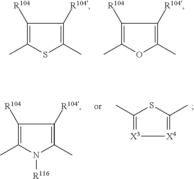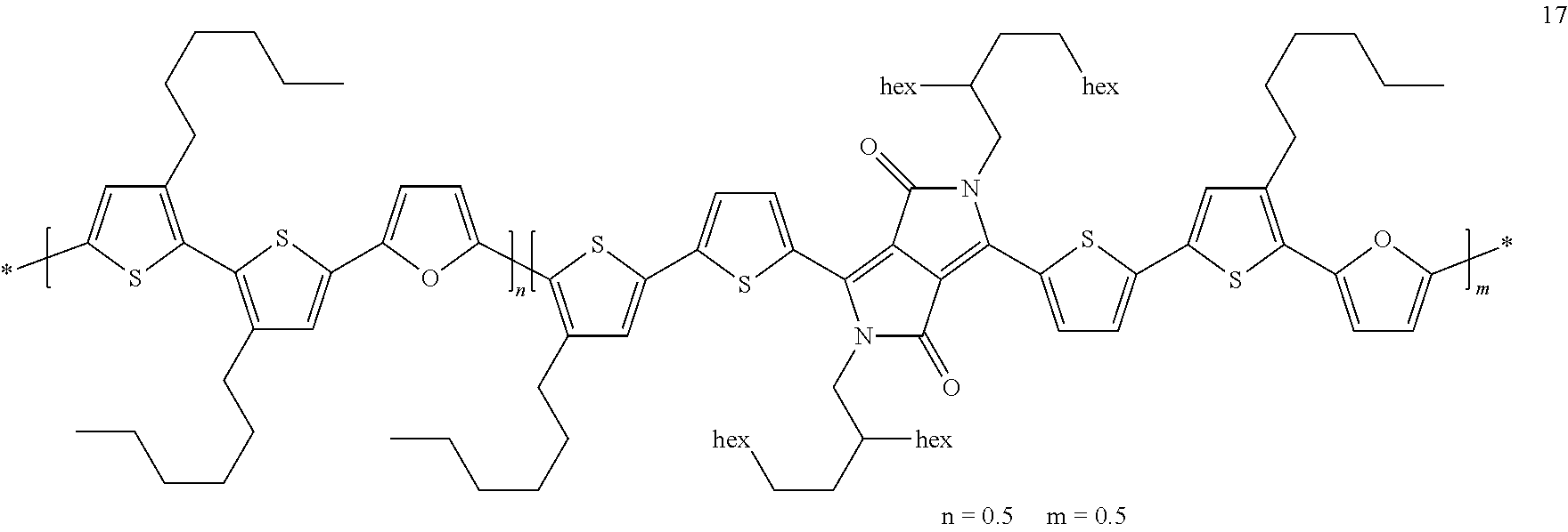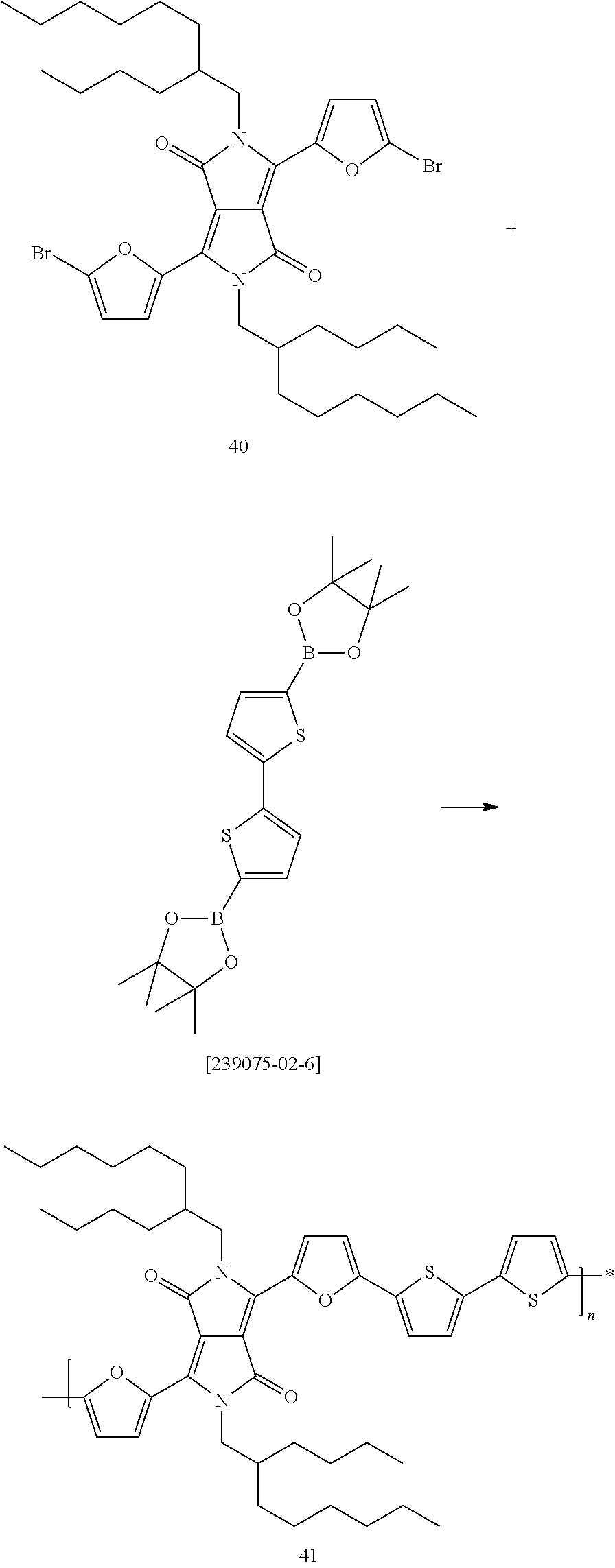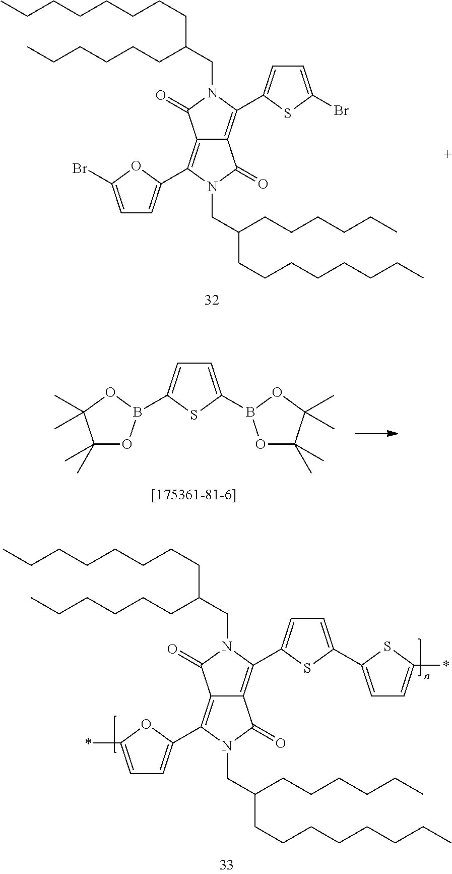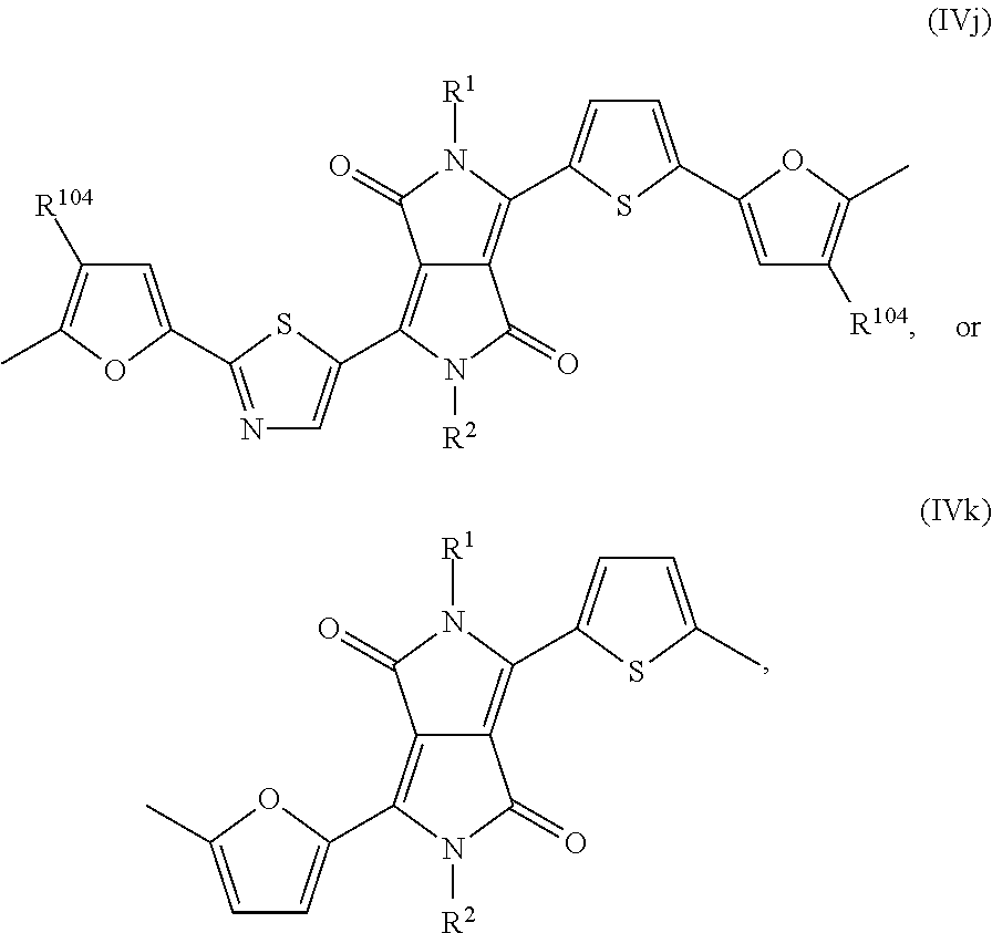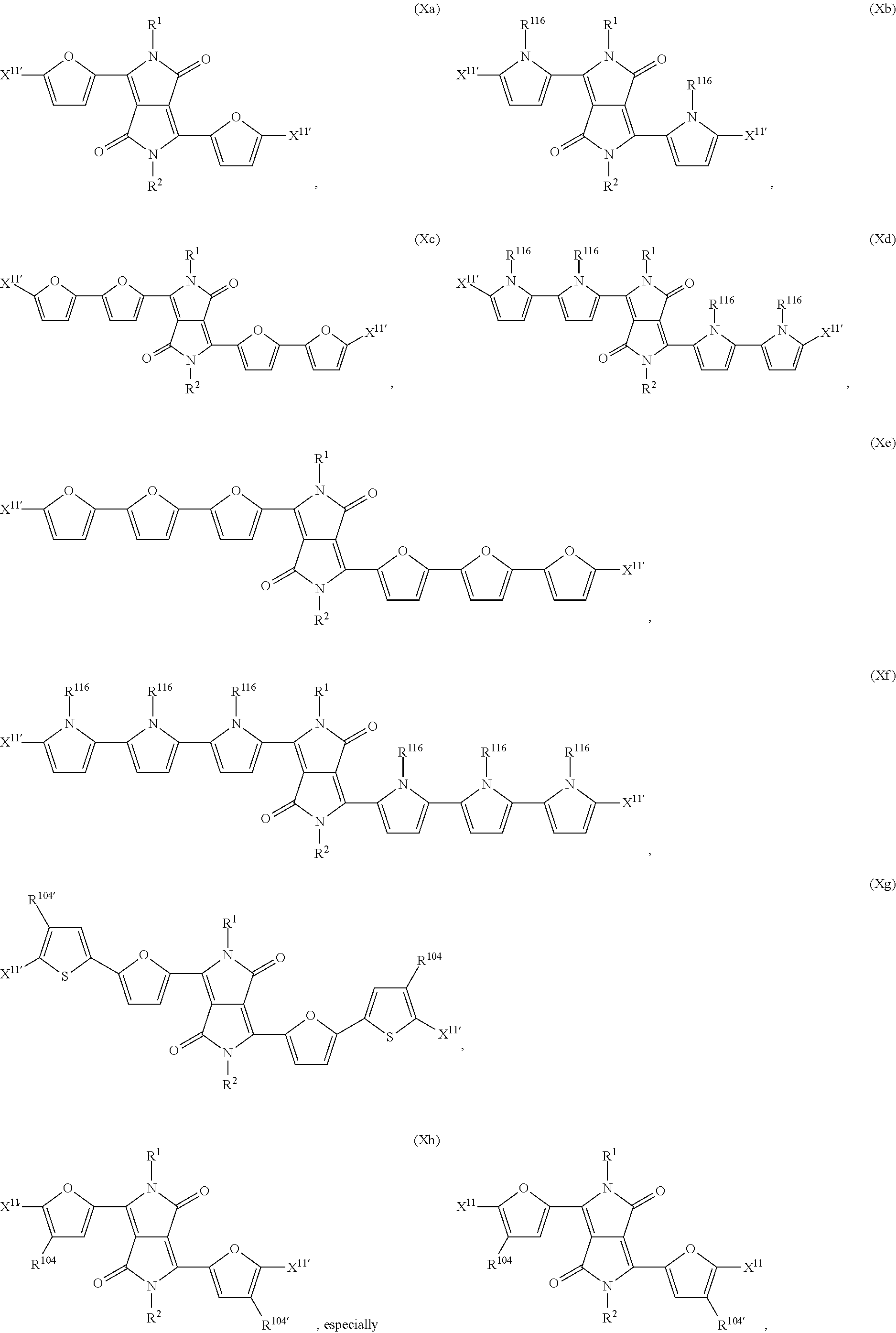 wherein x=0.995 to 0.005, y=0.005 to 0.995, especially x=0.2 to 0.8, y=0.8 to 0.2, and wherein x+y=1; A is a group of formula IVa, IVc, IVe, IVg, IVh, IVi, IVj, or IVk, R1and R2are a C1-C35alkyl group, especially a C8-C35alkyl group, R104is a C1-C25alkyl group, especially a C4-C25alkyl, which may optionally be interrupted by one or more oxygen or sulphur atoms, B and D are independently of each other a group of formula Va, Vb, Vc, especially Ve, Vf, Vh, Vi, Vj, Vk, Vl, Vm, Vn, Vo, Vp, Vq, Vr, Vs, Vu, Vv, Vw, Vx, especially Vy, Vz, or Va′. The polymers of the formula IIa have especially a weight average molecular weight of 10,000 to 1,000,000, very especially 10,000 to 100,000 Daltons. The polymer structure represented by formula * In another preferred embodiment the present invention is directed to polymers, comprising repeating units of the formula