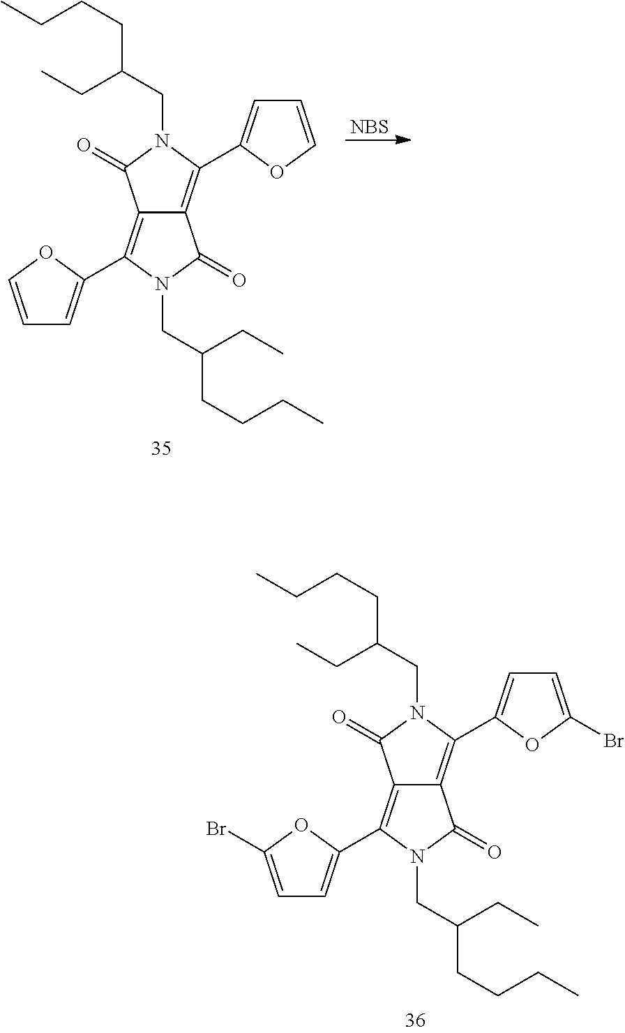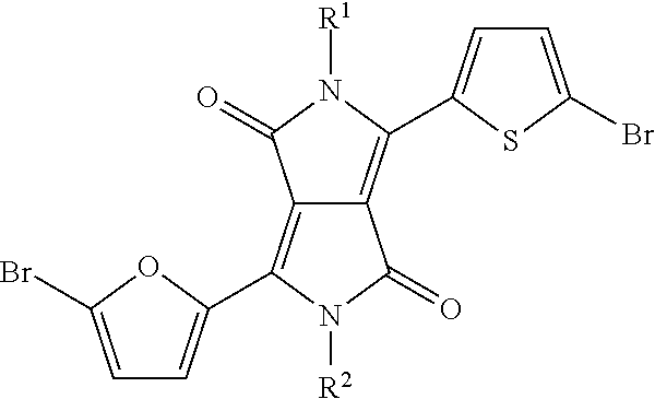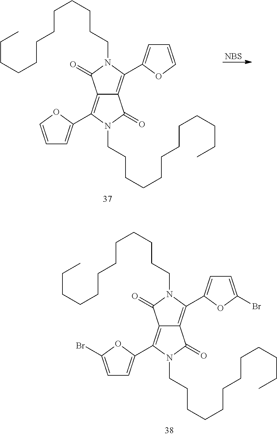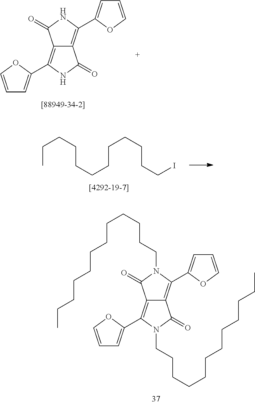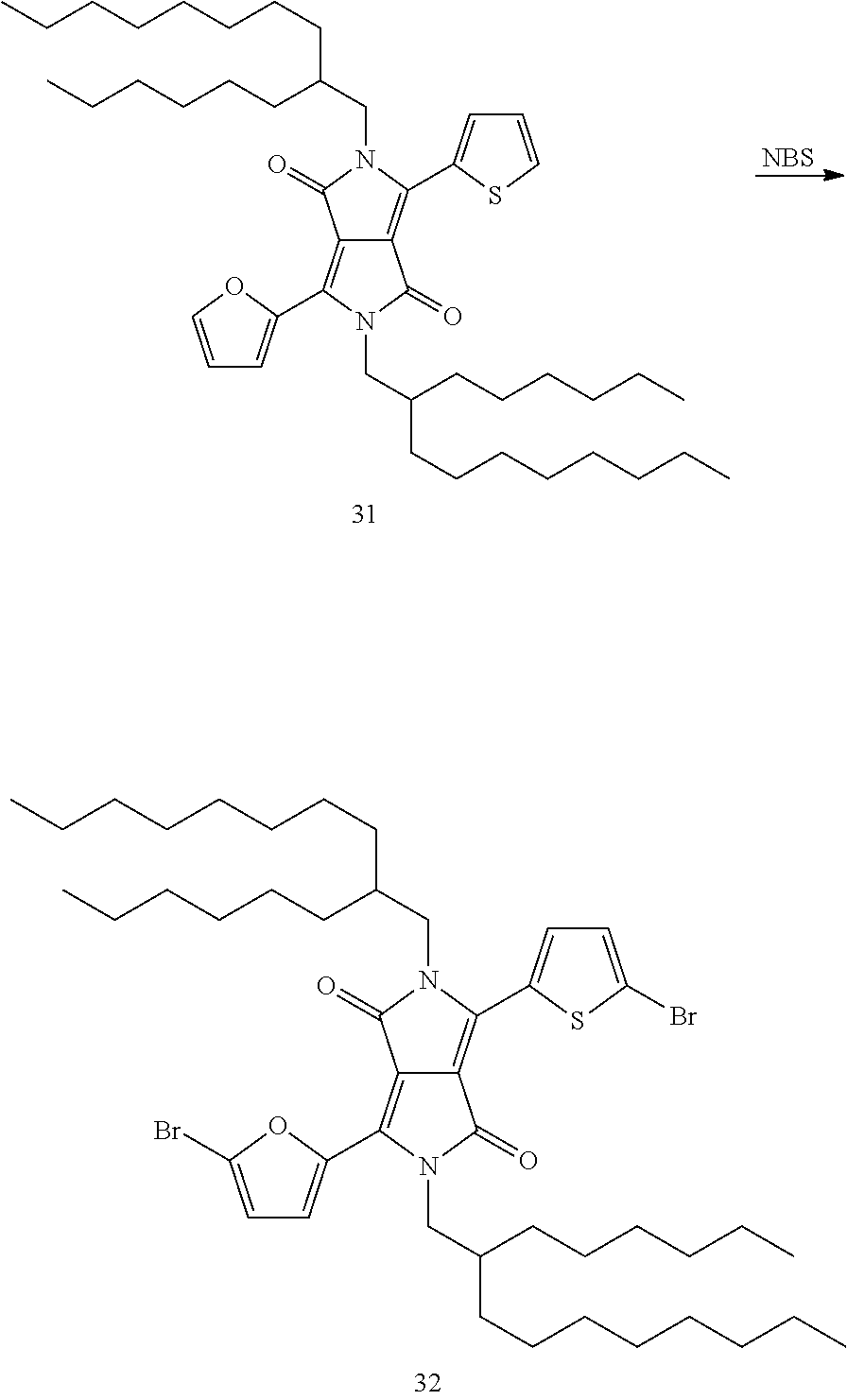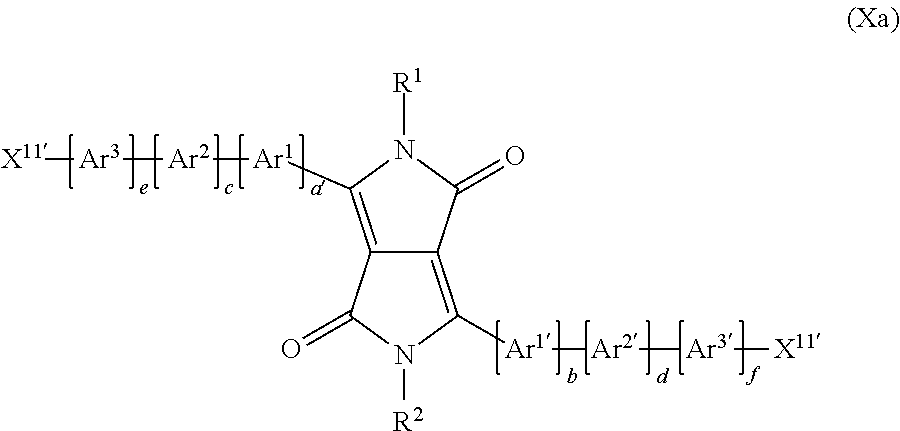 wherein x=0.995 to 0.005, y=0.005 to 0.995, especially x=0.2 to 0.8, y=0.8 to 0.2, and wherein x+y=1; A is a group of formula IVa, IVc, IVe, IVg, IVh, IVi, IVj, or IVk, R1and R2are a C1-C35alkyl group, especially a C8-C35alkyl group, R104is a C1-C25alkyl group, especially a C4-C25alkyl, which may optionally be interrupted by one or more oxygen or sulphur atoms, B and D are independently of each other a group of formula Va, Vb, Vc, especially Ve, Vf, Vh, Vi, Vj, Vk, Vl, Vm, Vn, Vo, Vp, Vq, Vr, Vs, Vu, Vv, Vw, Vx, especially Vy, Vz, or Va′. The polymers of the formula IIa have especially a weight average molecular weight of 10,000 to 1,000,000, very especially 10,000 to 100,000 Daltons. The polymer structure represented by formula * In another preferred embodiment the present invention is directed to polymers, comprising repeating units of the formula
