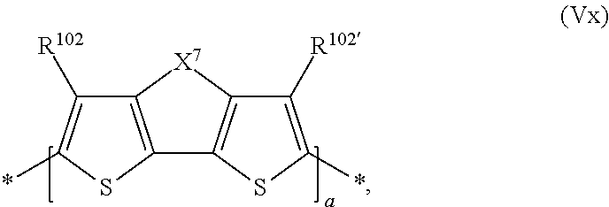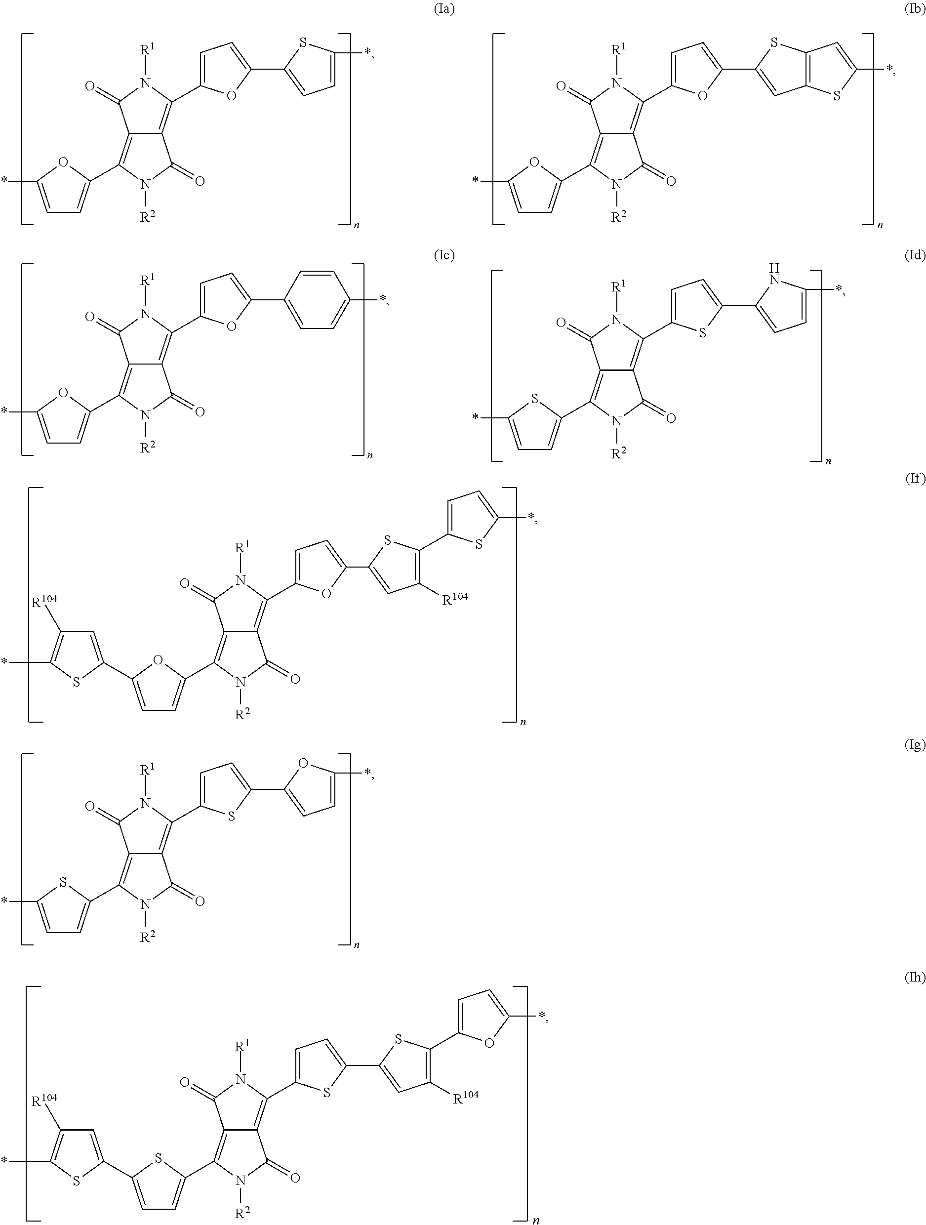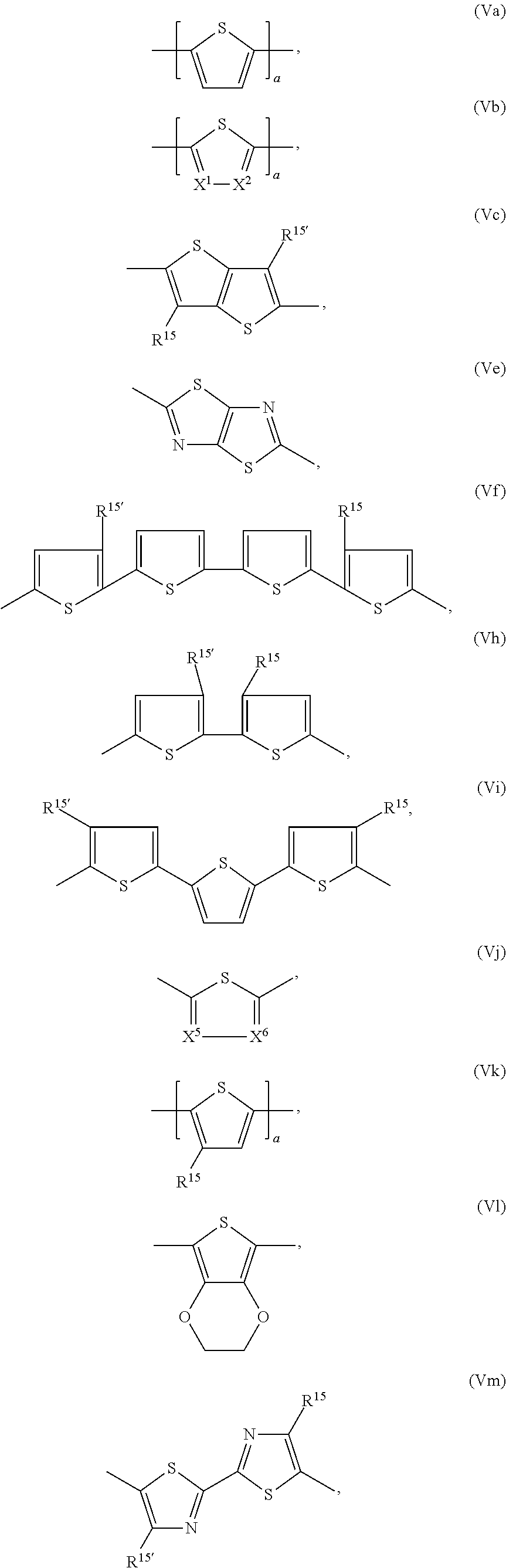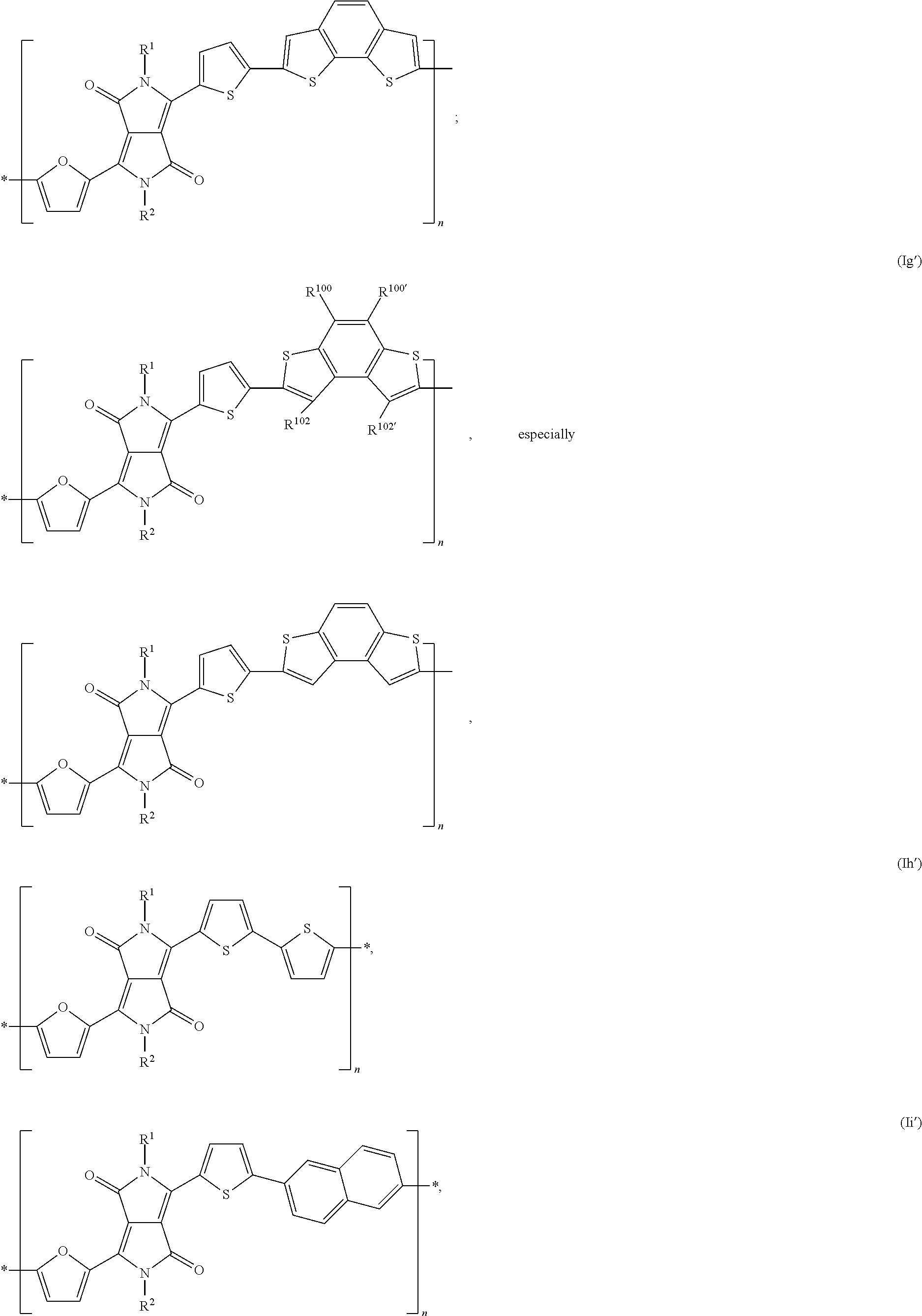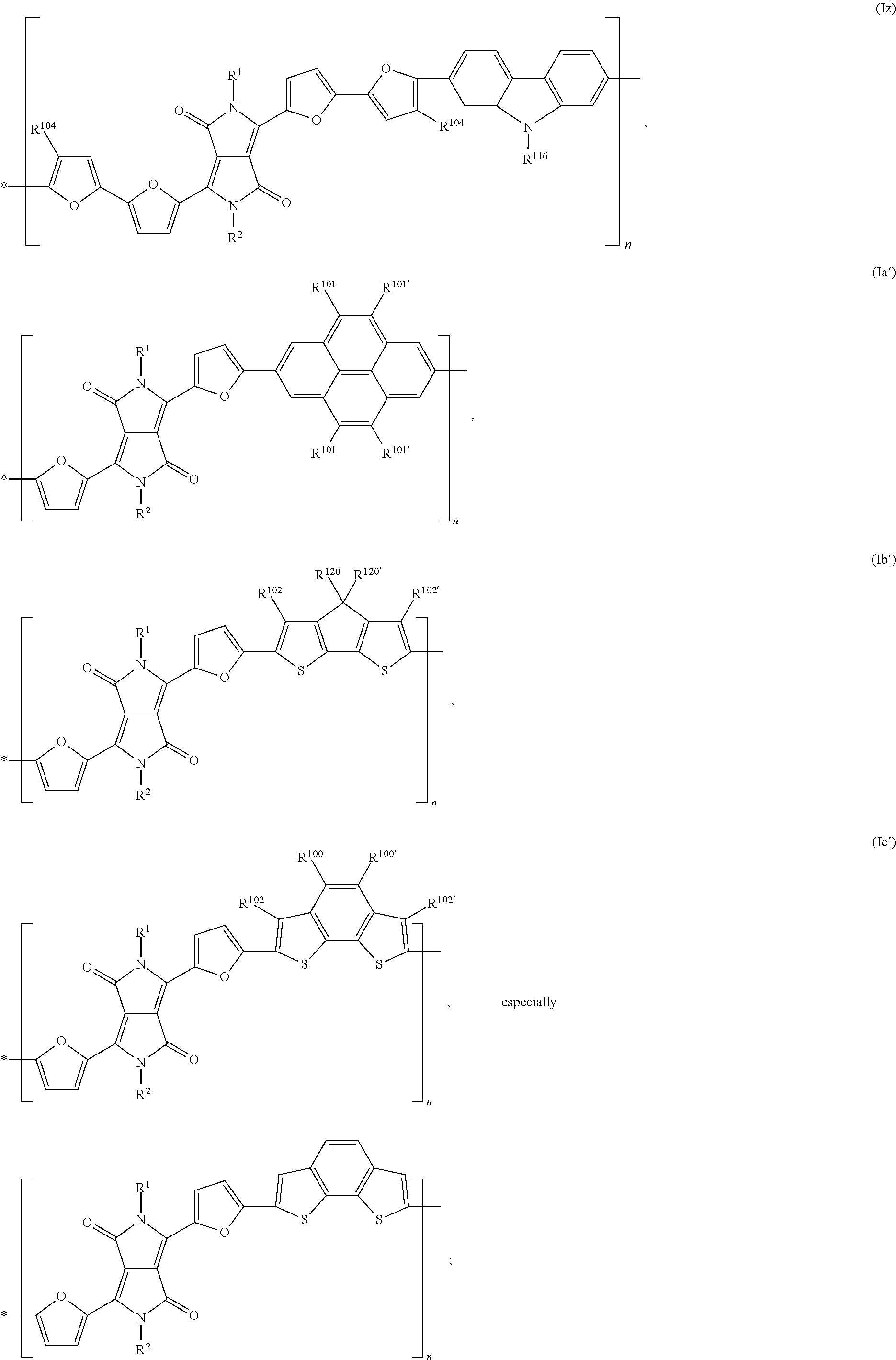 wherein r=0.985 to 0.005, s=0.005 to 0.985, t=0.005 to 0.985, u=0.005 to 0.985, and wherein r+s+t+u=1, A is a group of formula IVa, IVc, IVe, IVg, IVh, IVi, IVj, or IVk, R1and R2are a C1-C35alkyl group, especially a C8-C35alkyl group, R104is a C1-C25alkyl group, especially a C4-C25alkyl, which may optionally be interrupted by one or more oxygen or sulphur atoms, B, D and E are independently of each other a group of formula Va, Vb, Vc, especially Ve, Vf, Vh, Vi, Vj, Vk, Vl, Vm, Vn, Vo, Vp, Vq, Vr, Vs, Vu, Vv, Vw, Vx, especially Vy, Vz, or Va′. The polymers of the formula IIIa have especially a weight average molecular weight of 10,000 to 1,000,000, very especially 10,000 to 100,000 Daltons. In the above-described embodiments groups of formula IVa, IVc, IVe, IVg, IVh and IVi are most preferred as group A. The polymer structure represented by formula * At present polymers of formula (Ia), (Ib), (Ic), (Id), (If), (Ig), (Ih), (Ii), (Ij), (Ik), (Il), (Im), (In), (Io), (Ip), (Iq), (Ir), (Is), (It), (Iu), (Iv), (Ix), (Iy), (Iz), (Ia′), (Ib′), (Ic′), (Id′), (Ie′), (If′), (Ig′), (Ih′), (Ii′), (Ij′), (IIa), (IIb), (IIc), (IId), (IIe), (IIf), (IIg), (IIh), (IIi), and (IIj) are most preferred. R104is preferably a C1-C25alkyl group, especially a C4-C25alkyl, which may optionally be interrupted by one or more oxygen or sulphur atoms. R15, R15′, R17and R17′ are preferably independently of each other H, or a C1-C25alkyl group, especially a C6-C25alkyl, which may optionally be interrupted by one or more oxygen atoms. R20and R20′ are preferably independently of each other hydrogen, C7-C25aralkyl, C1-C25alkyl, especially C4-C25alkyl, which may optionally be interrupted by one, or more oxygen, or sulphur atoms. R100and R100′ are preferably H. R101and R101′ are preferably H, a C1-C25alkyl group, or a C1-C25alkoxy group. R102and R102′ are preferably H, or a C1-C25alkyl group. R103is preferably H, or a C1-C25alkyl group. R116is preferably H, or a C1-C25alkyl group. R120and R120are preferably a C1-C35alkyl group. The preparation of the polymers of the present invention is illustrated in more detail for polymers of formula II. Polymers of formula I and III can be prepared using the methods described for the preparation of the polymers of formula II. Copolymers of formula II can be obtained, for example, by the Suzuki reaction. The condensation reaction of an aromatic boronate and a halogenide, especially a bromide, commonly referred to as the “Suzuki reaction”, is tolerant of the presence of a variety of organic functional groups as reported by N. Miyaura and A. Suzuki in Chemical Reviews, Vol. 95, pp. 457-2483 (1995). Preferred catalysts are 2-dicyclohexylphosphino-2′,6′-dialkoxybiphenyl/palladium(II)acetates, tri-alkyl-phosphonium salts/palladium (0) derivatives and tri-alkylphosphine/palladium (0) derivatives. Especially preferred catalysts are 2-dicyclohexylphosphino-2′,6′-di-methoxybiphenyl (sPhos)/palladium(II)acetate and, tri-tertbutylphosphonium tetrafluoroborate ((t-Bu)3P*HBF4)/tris(dibenzylideneacetone) dipalladium (0) (Pd2(dba)3) and tri-tert-butylphosphine (t-Bu)3P/tris(dibenzylideneacetone)dipalladium (0) (Pd2(dba)3). This reaction can be applied to preparing high molecular weight polymers and copolymers. To prepare polymers corresponding to formula II dihalogenides of formula X10-A-X10and X10—B—X10are reacted with an (equimolar) amount of a diboronic acid or diboronate corresponding to formula; X11 wherein Y1is independently in each occurrence a C1-C10alkyl group and Y2is independently in each occurrence a C2-C10alkylene group, such as —CY3Y4—CY5Y6—, or —CY7Y8—CY9Y10—CY11Y12—, wherein Y3, Y4, Y5, Y6, Y7, Y8, Y9, Y10, Y11and Y12are independently of each other hydrogen, or a C1-C10alkyl group, especially —C(CH3)2C(CH3)2—, —CH2C(CH3)2CH2—, or —C(CH3)2CH2C(CH3)2—, and Y13and Y14are independently of each other hydrogen, or a C1-C10alkyl group, under the catalytic action of Pd and triphenylphosphine. The reaction is typically conducted at about 0° C. to 180° C. in an aromatic hydrocarbon solvent such as toluene, or xylene. Other solvents such as dimethylformamide, dioxane, dimethoxyethan and tetrahydrofuran can also be used alone, or in mixtures with an aromatic hydrocarbon. An aqueous base, preferably sodium carbonate or bicarbonate, potassium phosphate, potassium carbonate or bicarbonate is used as activation agent for the boronic acid, boronate and as the HBr scavenger. A polymerization reaction may take 0.2 to 100 hours. Organic bases, such as, for example, tetraalkylammonium hydroxide, and phase transfer catalysts, such as, for example TBAB, can promote the activity of the boron (see, for example, Leadbeater & Marco; Angew. Chem. Int. Ed. Eng. 42 (2003) 1407 and references cited therein). Other variations of reaction conditions are given by T. I. Wallow and B. M. Novak in J. Org. Chem. 59 (1994) 5034-5037; and M. Remmers, M. Schulze, and G. Wegner in Macromol. Rapid Commun. 17 (1996) 239-252. Control of molecular weight is possible by using either an excess of dibromide, diboronic acid, or diboronate, or a chain terminator. According to the process described in WO2010/136352 (European patent application no. 09176497.7) the polymerisation is carried out in presence of a) a catalyst/ligand system comprising a palladium catalyst and an organic phosphine or phosphonium compound, b) a base, c) a solvent or a mixture of solvents, characterized in that the organic phosphine is a trisubstituted phosphine of formula or phosphonium salt thereof, wherein X independently of Y represents a nitrogen atom or a C—R2″ group and Y independently of X represents a nitrogen atom or a C—R9″ group, R1″ for each of the two R1″ groups independently of the other represents a radical selected from the group C1-C24-alkyl, C3-C20-cycloalkyl, which includes especially both monocyclic and also bi- and tri-cyclic cycloalkyl radicals, C6-C14-ar