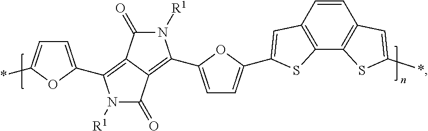 The gate, source and drain electrodes and the insulating and semiconducting layer in the OFET device may be arranged in any sequence, provided that the source and drain electrode are separated from the gate electrode by the insulating layer, the gate electrode and the semiconductor layer both contact the insulating layer, and the source electrode and the drain electrode both contact the semiconducting layer. Preferably the OFET comprises an insulator having a first side and a second side, a gate electrode located on the first side of the insulator, a layer comprising a polymer of the present invention located on the second side of the insulator, and a drain electrode and a source electrode located on the polymer layer. The OFET device can be a top gate device or a bottom gate device. Suitable structures and manufacturing methods of an OFET device are known to the skilled in the art and are described in the literature, for example in WO03/052841. The gate insulator layer may comprise for example a fluoropolymer, like e.g. the commercially available Cytop 809M®, or Cytop 107M® (from Asahi Glass). Preferably the gate insulator layer is deposited, e.g. by spin-coating, doctor blading, wire bar coating, spray or dip coating or other known methods, from a formulation comprising an insulator material and one or more solvents with one or more fluoro atoms (fluorosolvents), preferably a perfluorosolvent. A suitable perfluorosolvent is e.g. FC75® (available from Acros, catalogue number 12380). Other suitable fluoropolymers and fluorosolvents are known in prior art, like for example the perfluoropolymers Teflon AF® 1600 or 2400 (from DuPont), or Fluoropel® (from Cytonix) or the perfluorosolvent FC 43® (Acros, No. 12377). The semiconducting layer comprising a polymer of the present invention may additionally comprise at least another material. The other material can be, but is not restricted to another polymer of the present invention, a semi-conducting polymer, a polymeric binder, organic small molecules different from a polymer of the present invention, carbon nanotubes, a fullerene derivative, inorganic particles (quantum dots, quantum rods, quantum tripods, TiO2, ZnO etc.), conductive particles (Au, Ag etc.), and insulator materials like the ones described for the gate dielectric (PET, PS etc.). As stated above, the semiconductive layer can also be composed of a mixture of one or more polymers of the present invention and a polymeric binder. The ratio of the polymers of the present invention to the polymeric binder can vary from 5 to 95 percent. Preferably, the polymeric binder is a semicristalline polymer such as polystyrene (PS), high-density polyethylene (HDPE), polypropylene (PP) and polymethylmethacrylate (PMMA). With this technique, a degradation of the electrical performance can be avoided (cf. WO2008/001123A1). The polymers of the present invention are advantageously used in organic photovoltaic (PV) devices (solar cells). Accordingly, the invention provides PV devices comprising a polymer according to the present invention. A device of this construction will also have rectifying properties so may also be termed a photodiode. Photoresponsive devices have application as solar cells which generate electricity from light and as photodetectors which measure or detect light. The structure of organic photovoltaic devices (solar cells) is, for example, described in C. Deibel et al. Rep. Prog. Phys. 73 (2010) 096401 and Christoph Brabec, Energy Environ. Sci 2. (2009) 347-303. The PV device comprise in this order: (a) a cathode (electrode), (b) optionally a transition layer, such as an alkali halogenide, especially lithium fluoride, (c) a photoactive layer, (d) optionally a smoothing layer, (e) an anode (electrode), (f) a substrate. The photoactive layer comprises the polymers of the present invention. Preferably, the photoactive layer is made of a conjugated polymer of the present invention, as an electron donor and an acceptor material, like a fullerene, particularly a functionalized fullerene PCBM, as an electron acceptor. As stated above, the photoactive layer may also contain a polymeric binder. The amount of the polymers of the present invention to the polymeric binder can vary from 0.1 to 99.9, especially 1 to 99, very especially 5 to 95 percent by weight based on the amount of polymers of the present invention and polymeric binder. Preferably, the polymeric binder is a semicristalline polymer such as polystyrene (PS), high-density polyethylene (HDPE), polypropylene (PP) and polymethylmethacrylate (PMMA). For heterojunction solar cells the active layer comprises preferably a mixture of a polymer of the present invention and a fullerene, such as [60]PCBM (=6,6-phenyl-C61-butyric acid methyl ester), or [70]PCBM, in a weight ratio of 1:1 to 1:3. The fullerenes useful in this invention may have a broad range of sizes (number of carbon atoms per molecule). The term fullerene as used herein includes various cage-like molecules of pure carbon, including Buckminsterfullerene (C60) and the related “spherical” fullerenes as well as carbon nanotubes. Fullerenes may be selected from those known in the art ranging from, for example, C20-C1000. Preferably, the fullerene is selected from the range of C60to C96. Most preferably the fullerene is C60or C70, such as [60]PCBM, or [70]PCBM. It is also permissible to utilize chemically modified fullerenes, provided that the modified fullerene retains acceptor-type and electron mobility characteristics. The acceptor material can also be a material selected from the group consisting of any semi-conducting polymer, such as, for example, a polymer of the present invention, provided that the polymers retain acceptor-type and electron mobility characteristics, organic small molecules, carbon nanotubes, inorganic particles (quantum dots, quantum rods, quantum tripods, TiO2, ZnO etc.). The photoactive layer is made of a polymer of the present invention as an 