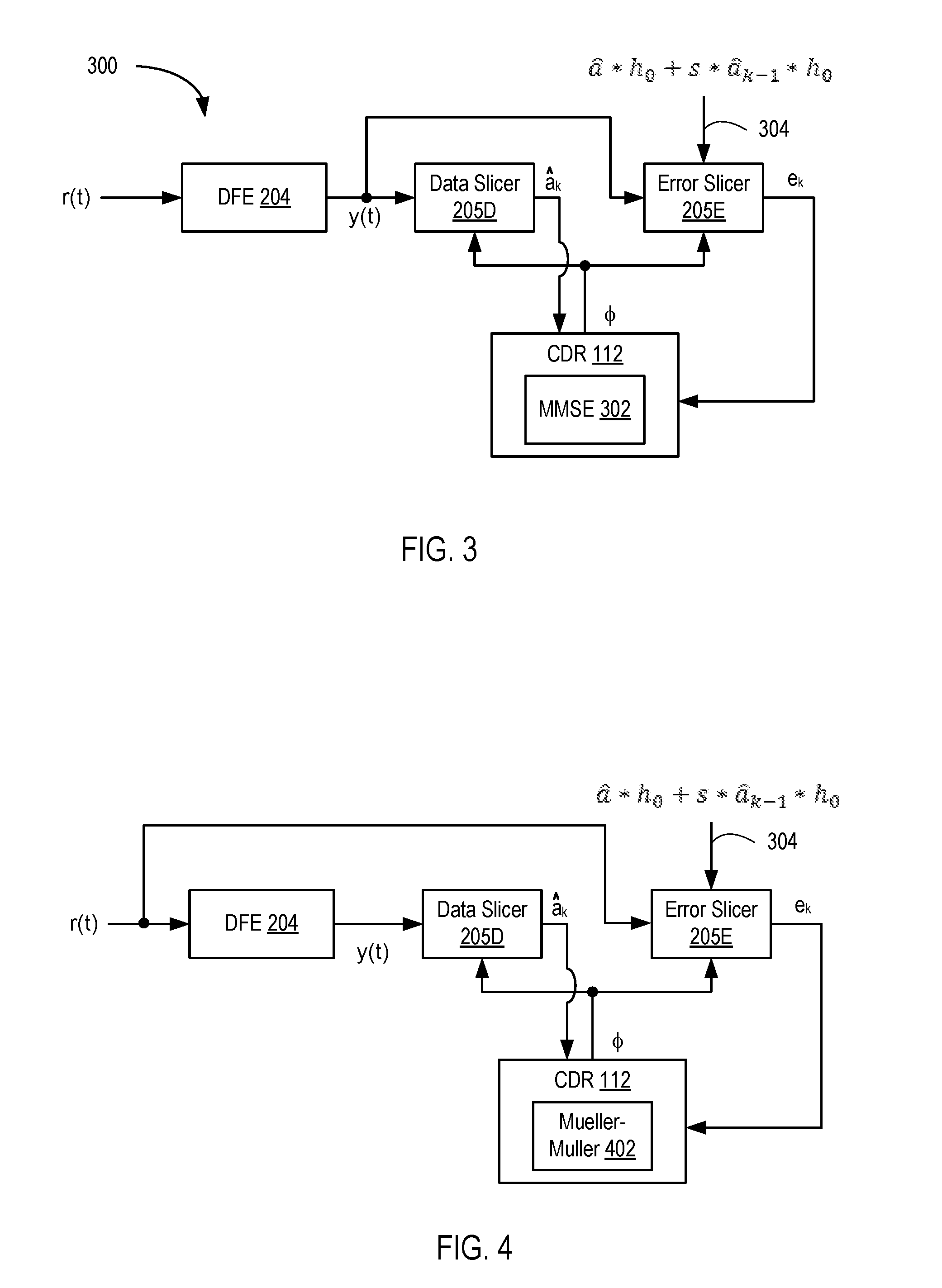 FIG. 3 is a block diagram depicting a baud-rate CDR system 300 according to an example. The baud-rate CDR system 300 includes the DFE 204, a data slicer 205D, an error slicer 205E, and the CDR 112. The CDR 112 includes an MMSE module 302. An input of the DFE 204 receives the filtered analog signal r(t). An output of the DFE 204, y(t), is coupled to an input of the data slicer 205D, and to an input of the error slicer 205E. An output of the data slicer 205D provides symbol decisions âk. The output of the data slicer 205D is coupled to an input of the CDR 112. An output of the error slicer 205E provides the error samples ek. The output of the error slicer 205E is coupled to an input of the CDR 112. The CDR 112 generates a control signal φ to control the sampling phase of the data slicer 205D and the error slicer 205E. An output of the CDR 112 provides the sampling phase φ, which is coupled to inputs of the data slicer 205D and the error slicer 205E, respectively. A threshold input 304 of the error slicer 205E receives a signal to set the decision threshold thereof. The signal coupled to the threshold input 304 is discussed below. The MMSE module 302 performs an MMSE algorithm to determine the sampling phase.