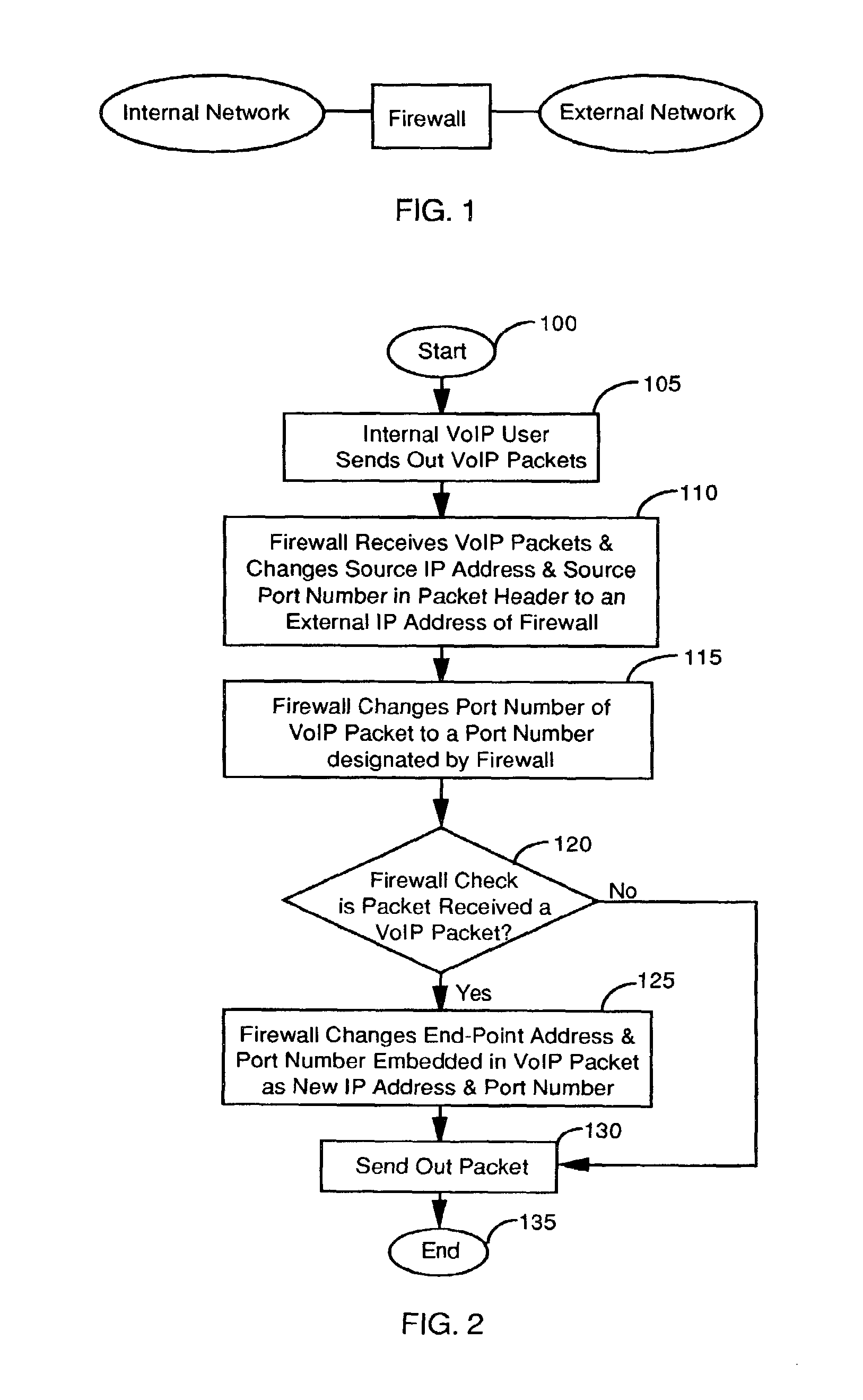 This application is a continuation of U.S. patent application Ser. No. 13/873,895, filed Apr. 30, 2013, now U.S. Pat. No. 9,172,677, which is a continuation of U.S. patent application Ser. No. 13/491,346, filed Jun. 7, 2012, now U.S. Pat. No. 8,434,143, which is a continuation of U.S. patent application Ser. No. 13/229,134, filed Sep. 9, 2011, now U.S. Pat. No. 8,201,236, which is a continuation of U.S. patent application Ser. No. 12/776,415, filed May 9, 2010, now U.S. Pat. No. 8,020,202, which is a continuation of U.S. patent application Ser. No. 10/247,955, filed Sep. 20, 2001, now U.S. Pat. No. 7,716,725, all of which are hereby incorporated by reference in their entirety for all purposes. Contained herein is material that is subject to copyright protection. The copyright owner has no objection to the facsimile reproduction of the patent disclosure by any person as it appears in the Patent and Trademark Office patent files or records, but otherwise reserves all rights to the copyright whatsoever. Copyright© 2002-2015, Fortinet, Inc. 1. Field Embodiments of the present invention generally relate to the management and processes of the network communication packet implemented with a firewall. More particularly, embodiments of the present invention relate to a new interface configuration and processing scheme for enhancing bi-directional VoIP communication traversing the firewall without degrading the level of protections provided by the firewall. 2. Description of the Related Art A technical difficulty is still faced by those who apply Internet Protocol (IP) for voice communication by sending voice messages as digitized data packets on Internet, commonly known as Voice over IP (VoIP) technologies, when the sender or the receiver are protected by a firewall protection system. Specifically, several popular VoIP signaling protocols such as MGCP, SIP and H323 are commonly implemented. All these different types of protocols are implemented with the data relating to the end point address embedded as part of the data content transmitted in the Internet Protocol packets. Referring to An exemplary header is shown below: