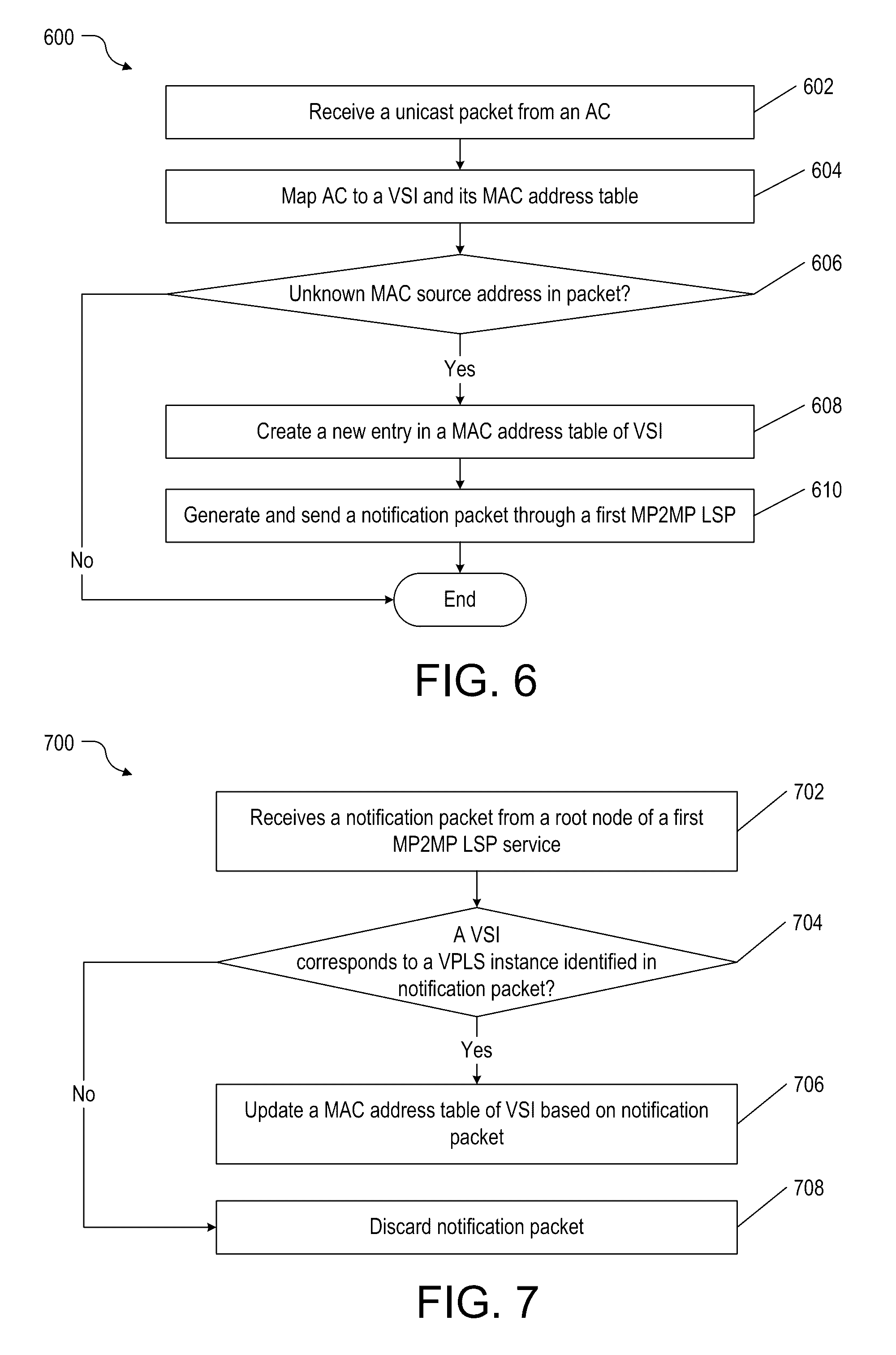 a processor; and a non-transitory processor-readable medium having stored thereon machine-readable instructions that cause the processor to: receive a unicast packet on a first attachment circuit (AC); search, in a media access control (MAC) address table corresponding to a first virtual switch instance (VSI) associated with the first AC, for an entry that matches a first MAC address carried in the unicast packet, the first MAC address being a MAC destination address of the unicast packet; and flood the unicast packet to every AC, excluding the first AC, associated with the first VSI when a matching entry is not found for the first MAC address carried in the unicast packet, and after learning a second MAC address from the first AC, send a first notification packet over the first MP2MP LSP, the first notification packet carrying the second MAC address, a first VSI label corresponding to the first VSI, a VPLS ID of the VPLS instance corresponding to the first VSI, and a PE ID of the first PE device, wherein, based the first notification packet, other PE devices each add an entry to MAC address tables of corresponding VSIs that belong to the same VPLS instance as the first VSI. 10. The first PE device of after a third MAC address in the MAC address table of the first VSI expires, send a cancellation message to the first MP2MP LSP, the cancellation message carrying the third MAC address, the VPLS ID of the VPLS associated with the first VSI, and the PE ID of the first PE device, wherein, based on the cancellation message, the other PE devices each delete another entry in the MAC address table of the corresponding VSIs that belong to the same VPLS instance as the first VSI. 11. The first PE device of receive over the first MP2MP LSP a second notification packet from a second PE device, wherein the second notification packet carries a third MAC address that the second PE device learned from a second AC, a second VSI label corresponding to a second VSI on the second PE device, the VPLS ID of the VPLS instance of the first and the second VSIs, and a PE ID of the second PE device, the second AC being associated with the second VSI; determine if there exists a VSI on the first PE device that belongs to the same VPLS instance as the second VSI; when it is determined that the first VSI belongs to the same VPLS instance as the second VSI, add a relationship among the third MAC address, the second VSI label, and a selected tunnel to a path database on a control plane corresponding to the first VSI, the selected tunnel being a tunnel selected for the second VSI from tunnels between the first PE device and the second PE device; and update the MAC address table corresponding to the first VSI based on the path database corresponding to the first VSI. 12. The first PE device of receive over the first MP2MP LSP a cancellation packet sent by the second PE device after a fourth MAC address in the second MAC address table of the second VSI expires, wherein the cancellation packet carries the fourth MAC address, the VPLS ID of the VPLS instance associated with the second VSI, and the PE ID of the second PE device; determine, based on the VPLS ID carried in the cancellation packet, if there exists a VSI on the first PE device that belongs to the same VPLS instance as the second VSI; and when it is determined that the first VSI belongs to the same VPLS instance as the second VSI, update the path database associated with the first VSI based on the cancellation packet to delete another entry corresponding to the fourth MAC address and update the MAC address table associated with the first VSI based on the path database. 13. The first PE device of receive an MPLS message from a PW; remove another tunnel label from the MPLS packet; remove another VSI label from the MPLS packet after the other tunnel label has been removed; determine that the other VSI label is associated with another VSI on the first PE device, and look up and forward the MPLS packet based on another MAC address table associated with the other VSI. 14. The first PE device of receive a broadcast packet on the first AC;