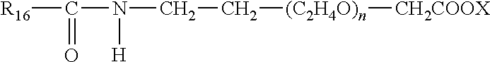 wherein R14is a C8-C20-alkyl group, preferably a C12-C14-alkyl group, n is a number from 1 to 20, preferably 2 to 17, and X is H or preferably a cation of the group sodium, potassium, magnesium and ammonium, which can optionally be hydroxyalkyl-substituted, as well as alkyl amido polyether carboxylic acids of the general formula wherein R16and X have the above meanings, and n is in particular a number from 1 to 10, preferably 2.5 to 5. Such products have been known for some time and are on the market, for example, under the trade name “AKYPO®” and “AKYPO-SOFT®”. Also useful are C8-C20-acyl isethionates, alone or in admixture with other anionic surfactants, as well as sulfofatty acids and the esters thereof. It is also possible to use mixtures of several anionic surfactants, for example an ether sulfate and a polyether carboxylic acid or alkyl amidoether carboxylic acid. An overview of the anionic surfactants used in liquid body cleansing compositions can furthermore be found in the monography of K. Schrader and A. Domsch, “Cosmetology—Theory and Practice”, 2005, Verlag für chemische Industrie, Augsburg-Germany, pp. II-8-II-19. Further suitable anionic surfactants are also C8-C22-acyl aminocarboxylic acids or the water-soluble salts thereof. Especially preferred is N-lauroyl glutamate, in particular as sodium salt, as well as, for example, N-lauroyl sarcosinate, N—C12-C18-acyl asparaginic acid, N-myristoyl sarcosinate, N-oleoyl sarcosinate, N-lauroyl methylalanine, N-lauroyl lysine and N-lauroyl aminopropyl glycine, preferably in form of the water-soluble alkali or ammonium, in particular the sodium salts thereof, preferably in admixture with the above-named anionic surfactants. Further surfactants in the conditioning—cleansing compositions according to the invention are nonionic surfactants, preferably in admixture with anionic surfactants. These are described in Schrader, I.c., on pages 600-601 and pp. 694-695. Especially suited are alkyl polyglucosides of the general formula