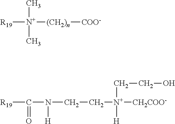 Sodium lauryl ether sulfate 11.0 (% by wt.) Coco glucoside 4.0 Cocoamidopropyl betaine 1.5 Sodium cocyl glutamate 1.5 Silicone Quaternium-22 0.3 Stearoxyopropyl dimethyl amine 0.3 Pentaphenly timethyl siloxane 0.1 Sodium chloride 1.0 Citric acid q.s. pH 5.5 Perfume, preservative q.s Water q.s. to 100.0 EXAMPLE 19