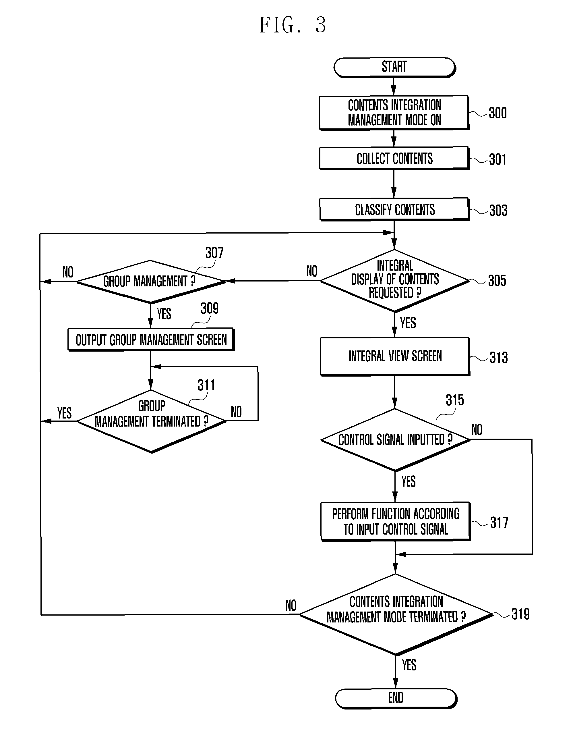 classifying content items into at least one of a first group and a second group; displaying a screen having a first section and a second section, the first section including a first plurality of thumbnails and the second section including a second plurality of thumbnails, wherein each one of the first plurality of thumbnails corresponds to a respective content item that is classified into the first group and each one of the second plurality of thumbnails corresponds to a respective content item that is classified into the second group; detecting a first input dragging a first thumbnail from the first section into the second section, the first thumbnail corresponding to a first content item that is classified into the first group; and in response to the first input, maintaining in the first section display of the first thumbnail while displaying in the second section a second thumbnail, wherein the second thumbnail includes a copy of the first thumbnail and a copy of an image corresponding to an owner of the first content item superimposed onto the first thumbnail, and wherein the second thumbnail displayed only after the first thumbnail is dragged out of the first section by the first input. 2. The method of 3. The method of 4. The method of 5. The method of 6. The method of 7. The method of 8. The method of detecting that a second content item is same as a third content item based on history information associated with the second content item and the third content item; selecting the third content item as a representative content item; and classifying the third content item into the first group as a result of selecting the third content item as the representative content item. 9. The method of detecting a second input selecting the third content item; and displaying additional information regarding the second content item in response to the second input. 10. The method of 11. The method of displaying the first plurality of thumbnails divided into separate rows in the first section, each row associated with a respective owner; and displaying above each row an owner thumbnail image corresponding to the respective, owner, wherein the image superimposed onto the first thumbnail is a copy of one of the owner thumbnail images. 12. An electronic device for displaying an integrated content screen, the electronic device comprising a processing circuitry configured to: